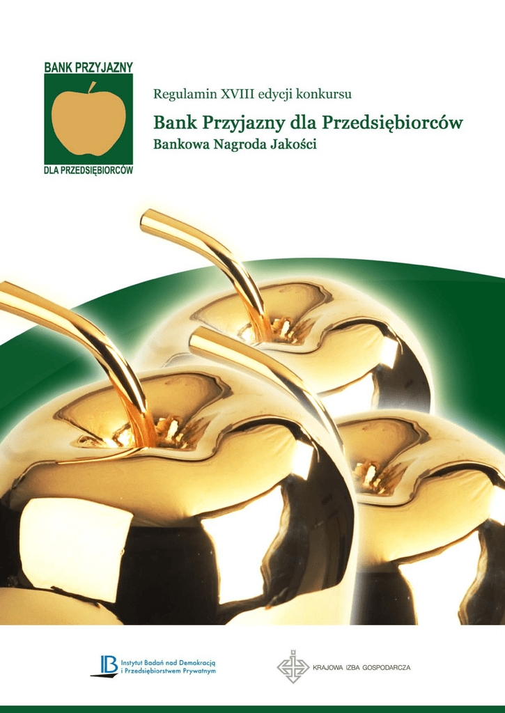 Bank Przyjazny dla Przedsiębiorców Regulamin konkursu Krajowa Izba Gospodarcza Instytut Badań nad Demokracją i Przedsiębiorstwem Prywatnym 1 Bank Przyjazny dla Przedsiębiorców Regulamin XVIII edycji konkursu Bank Przyjazny dla Przedsiębiorców Bankowa Nagroda Jakości Krajowa Izba Gospodarcza Instytut Badań nad Demokracją i Przedsiębiorstwem Prywatnym 2 Bank Przyjazny dla Przedsiębiorców Spis treści 1. Cel konkursu. Podstawowe definicje ............................................................................ 4 2. Organizatorzy konkursu ................................................................................................. 4 3. Kapituła Konkursu i Organy Współdziałające ............................................................. 4 4. Kategorie konkursu ......................................................................................................... 5 5. Nagrody ............................................................................................................................. 5 6. Przebieg konkursu ........................................................................................................... 7 7. Ocena poszczególnych etapów konkursu ..................................................................... 8 8. Tryb oceny konkursowej ................................................................................................. 8 9. Harmonogram realizacji konkursu ............................................................................... 9 10. Opłaty związane z udziałem w konkursie ..................................................................... 9 11. Kontakt z Organizatorami ............................................................................................ 11 Krajowa Izba Gospodarcza Instytut Badań nad Demokracją i Przedsiębiorstwem Prywatnym 3 Bank Przyjazny dla Przedsiębiorców 1. Cel konkursu. Podstawowe definicje 1.1. Cel konkursu Celem konkursu Bank Przyjazny dla Przedsiębiorców – Bankowa Nagroda Jakości jest wyróżnienie banków, które systematycznie wdrażają wysokie standardy obsługi jakości przedsiębiorców, osiągają dobre i bardzo dobre wyniki w zakresie obsługi finansowej małych i średnich przedsiębiorstw (MSP)1, a także dążą do wzbogacania oferty o innowacyjne produkty i usługi finansowe. Godło Promocyjne Bank Przyjazny dla Przedsiębiorców – Bankowa Nagroda Jakości wskazuje przedsiębiorcom te banki, które osiągnęły wysoki poziom obsługi finansowej MSP, zapewniają stabilny oraz wysoki poziom jakości, a także charakteryzują się rzeczowym podejściem i zrozumieniem specyfiki działania przedsiębiorców. 1.2. Definicja Banku Przyjaznego dla Przedsiębiorców Bank Przyjazny dla Przedsiębiorców to instytucja, która: • posiada ofertę produktów i usług bankowych dostosowanych do specyfiki małych i średnich przedsiębiorstw, • systematycznie wdraża standardy lub procedury podnoszenia jakości obsługi finansowej MSP, • zatrudnia kadrę, która legitymuje się stosownym doświadczeniem w zakresie obsługi MSP lub obecnie szkoli się w tym zakresie, • posiada wysoką kulturę korporacyjną i potrafi ją wykorzystać do budowy pozytywnych relacji z sektorem przedsiębiorczości, • dąży do tworzenia nowych produktów, usług i innowacji bankowych w segmencie przedsiębiorczości i osiąga w tym zakresie pozytywne wyniki. 2. Organizatorzy konkursu Organizatorami konkursu są: 2.1. Krajowa Izba Gospodarcza (KIG). Krajowa Izba Gospodarcza jest największą niezależną organizacją biznesu w Polsce. Powstała w 1990 roku. Reprezentuje największą liczbę przedsiębiorców, łącząc ponad 150 organizacji biznesowych. Krajowa Izba Gospodarcza promuje społeczną wrażliwość biznesu. 2.2. Instytut Badań nad Demokracją i Przedsiębiorstwem Prywatnym, który jest fundacją założoną w 1992 roku przez Krajową Izbę Gospodarczą dla promocji rozwoju gospodarki rynkowej i demokracji w Polsce. Celem Fundacji jest wspieranie rozwoju przedsiębiorczości prywatnej oraz budowa społeczeństwa demokratycznego w Polsce. 3. Kapituła Konkursu i Organy Współdziałające 3.1. Kapituła Konkursu jest najważniejszą władzą konkursu, która podejmuje decyzje o nadaniu nagród. Kapituła składa się z przedstawicieli władz, organizacji zrzeszających przedsiębiorców, jednostek wspierania przedsiębiorczości oraz przedstawicieli nauki. 3.2. Zespół Audytorów Jakości - zadaniem Audytorów jest dokonanie ocen wstępnych w oparciu o pisemny kwestionariusz i dołączone załączniki potwierdzające informacje zawarte w kwestionariuszu w ramach I etapu 1 Małe i średnie przedsiębiorstwa to firmy zatrudniające do 250 pracowników. Krajowa Izba Gospodarcza Instytut Badań nad Demokracją i Przedsiębiorstwem Prywatnym 4 Bank Przyjazny dla Przedsiębiorców konkursu. Ponadto, w II etapie konkursu Audytorzy analizują wyniki badań jakości obsługi finansowej przedsiębiorców przeprowadzone w oddziałach banków przez tajemniczych klientów, badają zgodność posiadanych przez bank systemów obsługi (opisanych w formie procedur, praktyk czy standardów) z uzyskanymi wynikami badań klientów oraz oceniają działalność promocyjno-informacyjną banku wobec małych i średnich przedsiębiorstw. Następnie Zespół Audytorów Jakości przygotowuje rekomendacje dla Kapituły, która podejmuje ostateczną decyzję dotyczącą przyznania poszczególnych nagród. 4. Kategorie konkursu 4.1. Konkurs jest prowadzony w następujących kategoriach: 1. banków uniwersalnych, 2. banków spółdzielczych i małych banków lokalnych, 3. oddziałów bankowych. 4.2. Dla potrzeb konkursu przyjęto następujące definicje: 4.2.1. Bank uniwersalny, to bank prowadzący działalność w większym rozmiarze, którego zasięg oddziaływania obejmuje cały kraj lub co najmniej kilka regionów, prowadzący różne usługi bankowe, posiadający wyodrębnioną strukturę