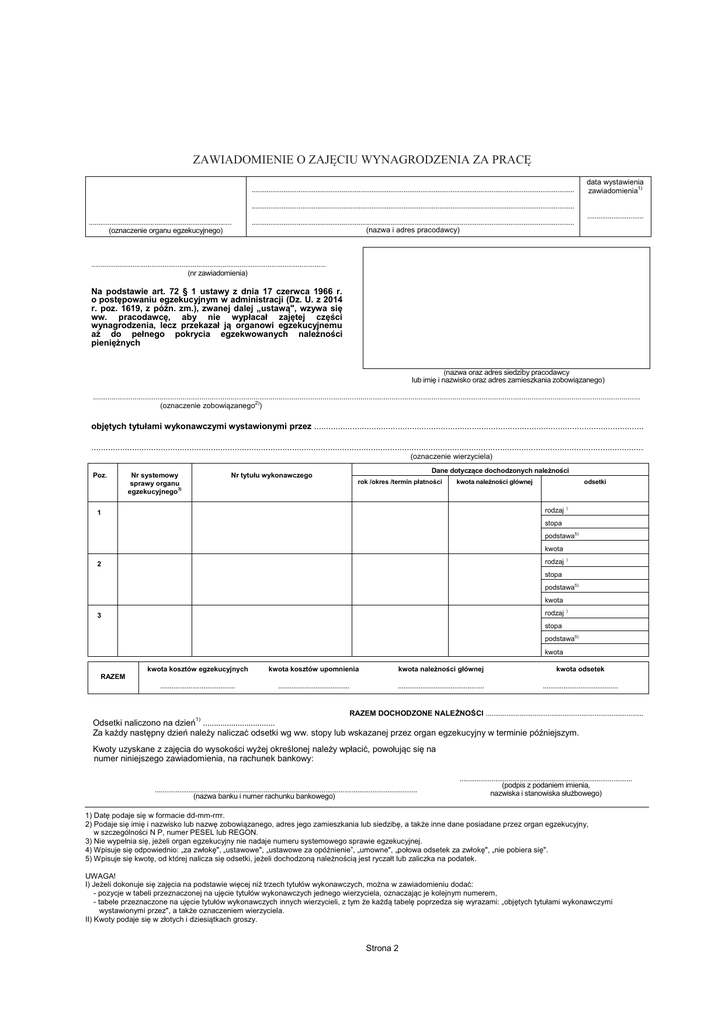 ZAWIADOMIENIE WYNAGRODZENIA AJĘCIU WYNA RODZENIA ZA PR ZA CĘ PRACĘ ZAWI DOMIENIE O ZAJĘCIU ............................................................................................................................................................................ data wystawienia zawiadomienia1) ............................................................................................................................................................................ ............................................................................ (oznaczenie organu egzekucyjnego) ............................................................................................................................................................................ (nazwa i adres pracodawcy) .............................. ............................................................................................................................. (nr zawiadomienia) Na podstawie art. 72 § 1 ustawy z dnia 17 czerwca 1966 r. o postępowaniu egzekucyjnym w administracji (Dz. U. z 2014 r. poz. 1619, z późn. zm.), zwanej dalej „ustawą", wzywa się ww. pracodawcę, aby nie wypłacał zajętej części wynagrodzenia, lecz przekazał ją organowi egzekucyjnemu aż do pełnego pokrycia egzekwowanych należności pieniężnych (nazwa oraz adres siedziby pracodawcy lub imię i nazwisko oraz adres zamieszkania zobowiązanego) ...................................................................................................................................................................................................................................................................... (oznaczenie zobowiązanego2)) objętych tytułami wykonawczymi wystawionymi przez .......................................................................................................................................... ....................................................................................................................................................................................................................................... (oznaczenie wierzyciela) Poz. Nr systemowy sprawy organu egzekucyjnego3) Dane dotyczące dochodzonych należności Nr tytułu wykonawczego rok /okres /termin płatności kwota należności głównej odsetki rodzaj 1 ) stopa podstawa5) kwota rodzaj 2 ) stopa podstawa5) kwota rodzaj 3 ) stopa podstawa5) kwota RAZEM kwota kosztów egzekucyjnych kwota kosztów upomnienia kwota należności głównej kwota odsetek ........................................ ...................................... .............................................. ........................................ RAZEM DOCHODZONE NALEŻNOŚCI .................................................................................... Odsetki naliczono na dzień1) ................................. Za każdy następny dzień należy naliczać odsetki wg ww. stopy lub wskazanej przez organ egzekucyjny w terminie późniejszym. Kwoty uzyskane z zajęcia do wysokości wyżej określonej należy wpłacić, powołując się na numer niniejszego zawiadomienia, na rachunek bankowy: ............................................................................................................................................ (nazwa banku i numer rachunku bankowego) ............................................................................................ (podpis z podaniem imienia, nazwiska i stanowiska służbowego) 1) Datę podaje się w formacie dd-mm-rrrr. 2) Podaje się imię i nazwisko lub nazwę zobowiązanego, adres jego zamieszkania lub siedzibę, a także inne dane posiadane przez organ egzekucyjny, w szczególności N P, numer PESEL lub REGON. 3) Nie wypełnia się, jeżeli organ egzekucyjny nie nadaje numeru systemowego sprawie egzekucyjnej. 4) Wpisuje się odpowiednio: „za zwłokę", „ustawowe", „ustawowe za opóźnienie”, „umowne", „połowa odsetek za zwłokę", „nie pobiera się". 5) Wpisuje się kwotę, od której nalicza się odsetki, jeżeli dochodzoną należnością jest ryczałt lub zaliczka na podatek. UWAGA! I) Jeżeli dokonuje się zajęcia na podstawie więcej niż trzech tytułów wykonawczych, można w zawiadomieniu dodać: - pozycje w tabeli przeznaczonej na ujęcie tytułów wykonawczych jednego wierzyciela, oznaczając je kolejnym numerem, - tabele przeznaczone na ujęcie tytułów wykonawczych innych wierzycieli, z tym że każdą tabelę poprzedza się wyrazami: „objętych tytułami wykonawczymi wystawionymi przez", a także oznaczeniem wierzyciela. II) Kwoty podaje się w złotych i dziesiątkach groszy. Strona 2 WEZWANIE PRACODAWCY Wzywa się pracodawcę, aby w terminie 7 dni od dnia doręczenia zawiadomienia: 1. złożył za okres 3 miesięcy poprzedzających zajęcie, za każdy miesiąc oddzielnie, zestawienie otrzymanego w tym czasie wynagrodzenia zobowiązanego, z wyszczególnieniem wszystkich jego składn ków, 2. w przypadku zaistnienia przeszkód do wypłacenia wynagrodzenia za pracę organowi egzekucyjnemu, złożył oświadczenie o rodzaju tych przeszkód, a w szczególności podał, czy inne osoby roszczą sobie prawa do zajętego wynagrodzenia, czy i w jakim sądzie toczy się sprawa o to wynagrodzenie oraz czy i o jakie roszczenia została skierowana do tego wynagrodzenia egzekucja przez innych wierzycieli. POUCZENIE DLA PRACODAWCY Zajęcie jest dokonane z chwilą doręczenia niniejszego zawiadomienia. Zajęcie to zachowuje moc również w przypadku zmiany stosunku pracy lub zlecenia, nawiązania nowego stosunku pracy lub zlecenia z tym samym pracodawcą, a także w przypadku przejęcia pracodawcy przez innego pracodawcę. W stosunku do egzekwowanej należności pieniężnej nieważne są rozporządzenia wynagrodzeniem przekraczające część wolną od zajęcia, dokonane po jego zajęciu, a także przed tym zajęciem, jeżeli są wymagalne po zajęciu. Wynagrodzenie ze stosunku pracy po