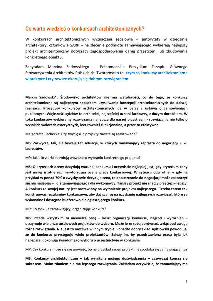 Co warto wiedzieć o konkursach architektonicznych? W konkursach architektonicznych wyznaczeni sędziowie – autorytety w dziedzinie architektury, członkowie SARP – na zlecenie podmiotu zamawiającego wybierają najlepszy projekt architektoniczny dotyczący zagospodarowania danej przestrzeni lub zbudowania konkretnego obiektu. Zapytałam Marcina Sadowskiego – Pełnomocnika Prezydium Zarządu Głównego Stowarzyszenia Architektów Polskich ds. Twórczości o to, czym są konkursy architektoniczne w praktyce i czy zawsze okazują się dobrym rozwiązaniem. Marcin Sadowski*: Środowisko architektów nie ma wątpliwości, co do tego, że konkursy architektoniczne są najlepszym sposobem uzyskiwania koncepcji architektonicznych do dalszej realizacji. Procedury konkursów architektonicznych idą w parze z ustawą o zamówieniach publicznych. Większość sędziów to architekci, najczęściej uznani fachowcy, z dużym dorobkiem. W toku konkursów wybieramy rozwiązania najlepsze dla naszej przestrzeni - rozwiązania nie tylko o wysokich walorach estetycznych, lecz również funkcjonalne, a przez to efektywne. Małgorzata Pachecka: Czy zwycięskie projekty zawsze są realizowane? MS: Zazwyczaj tak, ale bywają też sytuacje, w których zamawiający zaprasza do negocjacji kilku laureatów. MP: Jakie kryteria decydują wówczas o wybraniu konkretnego projektu? MS: O kryteriach oceny decydują warunki konkursu i oczywiście najlepiej jest, gdy kryterium ceny jest mniej istotne niż merytoryczna ocena pracy konkursowej. W sytuacji odwrotnej – gdy na przykład w ponad 70% o zwycięstwie decyduje cena, to dopuszczanie do negocjacji może zakończyć się nie najlepiej – i dla zamawiającego i dla wykonawcy. Tańszy projekt nie znaczy przecież – lepszy. A konkurs ze swojej natury jest nastawiony na wyłonienie projektu najlepszego. Trzeba zatem tak konstruować regulaminy konkursowe, aby dać szansę na uzyskanie najlepszych rozwiązań, które są wykonalne i dostępne budżetowo dla ogłaszającego konkurs. MP: Co zyskuje zamawiający, organizując konkurs? MS: Przede wszystkim za niewielką cenę – koszt organizacji konkursu, nagród i wyróżnień – otrzymuje wiele wartościowych projektów do wyboru. Może je ze sobą porównać, wziąć pod uwagę różne rozwiązania. Nie jest to możliwe w innym trybie. Ponadto dobry skład sędziowski powoduje, że do konkursu przystępuje wielu projektantów. Zależy im, by przedstawiona praca była jak najlepsza, dokonują świadomego wyboru o uczestnictwie w konkursie. MP: Czy konkurs może się nie powieść, bo na przykład żaden projekt nie spodoba się zamawiającemu? MS: Konkursy architektoniczne – tak wynika z mojego doświadczenia – zazwyczaj kończą się sukcesem. Moim zdaniem nie ma lepszego rozwiązania. Zakładam oczywiście, że zamawiający ma 1 dobrą wolę, że nie chodzi o działania pozorne, lecz o to, aby przestrzeń publiczna była przyjazna, a przyjęte do realizacji projekty były efektywne w użytkowaniu i technicznej eksploatacji. MP: Czy organizacja konkursu nie przedłuża w nieskończoność procedury i nie odwleka budowy budynku? MS: Projekty, które powstają w krótkim czasie to projekty w dużej mierze złe. Pośpiech sprzyja błędom. Nasze działania winny być przede wszystkim racjonalne i rozsądne. Pamiętajmy, że mówimy o budowlach, które będą służyły nam kilkadziesiąt lat lub dłużej. Przesunięcie realizacji o kilka czy kilkanaście miesięcy może więc oznaczać, że projekt będzie po prostu lepszy, a budynek bardziej funkcjonalny. A to jest przecież najważniejsze. MP: A co z sytuacją, gdy budżet jest mocno ograniczony, gdy trzeba zamknąć go do końca roku itp., jak ma to miejsce w przypadku urzędów gmin czy instytucji państwowych? MS: Sam koszt postawienia budynku to nie wszystko. Potrzebny jest szacunek kosztów eksploatacji. Gminy, dzielnice błyskawicznie podejmują decyzję o realizacji projektu z wolnej ręki, a potem nie wiedzą, jak dany obiekt utrzymać. Stawiają na przykład trzy boiska („bo trzeba było wydać pieniądze”), które potem obciążają w nieuzasadniony sposób budżet samorządu. Inna sprawa, że przystępując do wykonania pracy, mamy wiedzę jedynie o szacunkowym budżecie inwestycji – często nierealistycznym. Bo niska cena- za projekt, budowę jest najczęściej stosowanym kryterium. Tanio chcemy zbudować coś, co ma nam wspólnie służyć przez lata. Oszczędzamy na przygotowaniu inwestycji, projektowaniu i wykonawstwie. W rzeczywistości przynosi to odwrotny skutek. Przykładowo niedostateczne przygotowanie danych wyjściowych powoduje, że dostajemy nieaktualne mapy, złe inwentaryzacje, lub w ogóle nie dostajemy informacji np. na temat warunków gruntowych. W trakcie realizacji mierzymy się z nowymi problemami. To wszystko wydłuża czas projektowania i budowy, może znacznie zwiększyć koszty. MP: To znaczy, że lepiej zainwestować w porządne przygotowanie projektu, więcej wydać na początku? MS: Oczywiście. Solidne przygotowanie danych wyjściowych jest krytyczne. Im lepiej przygotowany konkurs, tym lepszy efekt końcowy. W tym przypadku oszczędzanie – zarówno czasu, jak i pieniędzy – niekoniecznie się opłaca. Samorządowcy często uważają, że organizacja konkursu to zbytek, bo i tak „każdy ma inny gust”. Tymczasem to nie tylko kwestia gustu, ale także – a może przede wszystkim – sposób szukania rozwiązań funkcjonalnych i efektywnych.. Te wstępne koszty można porównać do wykupienia polisy ubezpieczeniowej. Nie żałujemy pieniędzy, wydając na ubezpieczenie wartościowej rzeczy np. samochodu, na wszelki wypadek, gdyby coś się kiedyś miało zdarzyć. W przypadku projektu architektonicznego, jest podobnie z tą różnicą, iż z góry wiemy, że „coś się zdarzy” bo mamy przecież wybudować daną budowle. MP: Tymczasem mam wrażenie, że w Polsce nie szanujemy wspólnej przestrzeni. Im 