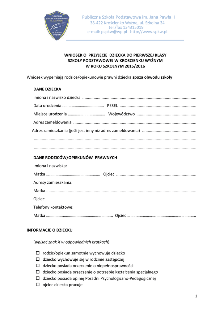Publiczna Szkoła Podstawowa im. Jana Pawła II 38-422 Krościenko Wyżne, ul. Szkolna 34 tel./fax 134315019 e-mail: [email protected] http://www.spkw.pl WNIOSEK O PRZYJĘCIE DZIECKA DO PIERWSZEJ KLASY SZKOŁY PODSTAWOWEJ W KROSCIENKU WYŻNYM W ROKU SZKOLNYM 2015/2016 Wniosek wypełniają rodzice/opiekunowie prawni dziecka spoza obwodu szkoły DANE DZIECKA Imiona i nazwisko dziecka ..................................................................................................... Data urodzenia …………………………………. PESEL .................................................................... Miejsce urodzenia ……………………………… Województwo ..................................................... Adres zameldowania ............................................................................................................. Adres zamieszkania (jeśli jest inny niż adres zameldowania) ................................................ ................................................................................................................................................ ................................................................................................................................................ DANE RODZICÓW/OPIEKUNÓW PRAWNYCH Imiona i nazwiska: Matka ……………………………………………. Ojciec ....................................................................... Adresy zamieszkania: Matka ..................................................................................................................................... Ojciec ..................................................................................................................................... Telefony kontaktowe: Matka ……………..……………………………………….. Ojciec ……………………….……………………………….. INFORMACJE O DZIECKU (wpisad znak X w odpowiednich kratkach) rodzic/opiekun samotnie wychowuje dziecko dziecko wychowuje się w rodzinie zastępczej dziecko posiada orzeczenie o niepełnosprawności dziecko posiada orzeczenie o potrzebie kształcenia specjalnego dziecko posiada opinię Poradni Psychologiczno-Pedagogicznej ojciec dziecka pracuje 1 matka dziecka pracuje dziecko z rodziny wielodzietnej rodzeostwo dziecka uczęszcza do tej szkoły OŚWIADCZENIE RODZICÓW/ PRAWNYCH OPIEKUNÓW Zgodnie z Rozporządzeniem Ministra Edukacji Narodowej z dnia 14 kwietnia 1992 r. w sprawie warunków i sposobu organizowania nauki religii w publicznych przedszkolach i szkołach (§1 ust 1), niniejszym wyrażam wolę, aby mój syn/ córka uczestniczył/ uczestniczyła w lekcjach religii/etyki. ……………………………………………… Podpis rodzica/prawnego opiekuna Wyrażam zgodę na gromadzenie, przetwarzanie i udostępnianie danych osobowych zawartych w karcie w systemach informatycznych szkoły oraz organów uprawnionych do nadzoru nad jednostkami oświatowymi. Przetwarzanie danych odbywad się będzie zgodnie z ustawą o ochronie danych osobowych ( tekst jednolity Dz.U. z 2002r. Nr 101, poz.926 z póź. zmianami). ……………………………………………… Podpis rodzica/prawnego opiekuna Wyrażam zgodę/nie wyrażam zgody (niepotrzebne skreślid) na publikację imienia i nazwiska oraz zdjęd mojego dziecka na stronie internetowej szkoły, w gazetce szkolnej i pismach lokalnych promujących szkołę. ……………………………………………… Podpis rodzica/prawnego opiekuna Wyrażam zgodę na wykorzystanie wizerunku mojego dziecka w celach promocyjnych szkoły (również po jej ukooczeniu). ……………………………………………… Podpis rodzica/prawnego opiekuna Podane w karcie informacje są zgodne ze stanem faktycznym. DO KARTY ZAPISU PROSZĘ DOŁĄCZYĆ: zaświadczenie o spełnianiu obowiązku rocznego przygotowania przedszkolnego MENI/53/2 (jeśli dziecka realizowało roczne przygotowanie przedszkolne w innej placówce niż szkoła w Krościenku Wyżnym), informacja o gotowości dziecka do podjęcia nauki w szkole podstawowej MEN – I/54/2, (jeśli dziecko realizowało roczne przygotowanie przedszkolne w innej szkole niż w Krościenku Wyżnym). Deklaracje złożone przez rodziców/prawnych opiekunów obowiązują przez cały cykl nauki dziecka w szkole. W przypadku zmiany decyzji rodzic/opiekun zobowiązany jest powiadomid o tym fakcie wychowawcę klasy. Krościenko Wyżne, …………………………………… ………………………………………………………….. podpisy obojga rodziców/prawnych opiekunów 2