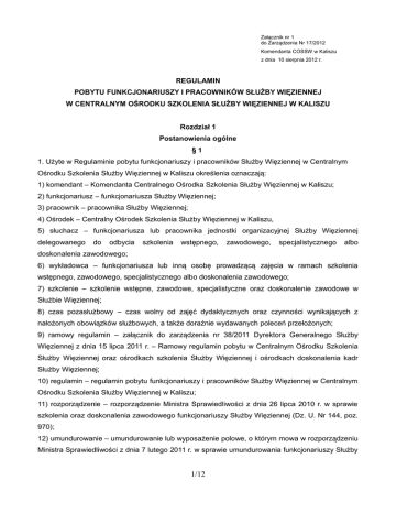 Załącznik nr 1 do Zarządzenia Nr 17/2012 Komendanta COSSW w Kaliszu z dnia 10 sierpnia 2012 r. REGULAMIN POBYTU FUNKCJONARIUSZY I PRACOWNIKÓW SŁUŻBY WIĘZIENNEJ W CENTRALNYM OŚRODKU SZKOLENIA SŁUŻBY WIĘZIENNEJ W KALISZU Rozdział 1 Postanowienia ogólne §1 1. Użyte w Regulaminie pobytu funkcjonariuszy i pracowników Służby Więziennej w Centralnym Ośrodku Szkolenia Służby Więziennej w Kaliszu określenia oznaczają: 1) komendant – Komendanta Centralnego Ośrodka Szkolenia Służby Więziennej w Kaliszu; 2) funkcjonariusz – funkcjonariusza Służby Więziennej; 3) pracownik – pracownika Służby Więziennej; 4) Ośrodek – Centralny Ośrodek Szkolenia Służby Więziennej w Kaliszu, 5) słuchacz – funkcjonariusza lub pracownika jednostki organizacyjnej Służby Więziennej delegowanego do odbycia szkolenia wstępnego, zawodowego, specjalistycznego albo doskonalenia zawodowego; 6) wykładowca – funkcjonariusza lub inną osobę prowadzącą zajęcia w ramach szkolenia wstępnego, zawodowego, specjalistycznego albo doskonalenia zawodowego; 7) szkolenie – szkolenie wstępne, zawodowe, specjalistyczne oraz doskonalenie zawodowe w Służbie Więziennej; 8) czas pozasłużbowy – czas wolny od zajęć dydaktycznych oraz czynności wynikających z nałożonych obowiązków służbowych, a także doraźnie wydawanych poleceń przełożonych; 9) ramowy regulamin – załącznik do zarządzenia nr 38/2011 Dyrektora Generalnego Służby Więziennej z dnia 15 lipca 2011 r. – Ramowy regulamin pobytu w Centralnym Ośrodku Szkolenia Służby Więziennej oraz ośrodkach szkolenia Służby Więziennej i ośrodkach doskonalenia kadr Służby Więziennej; 10) regulamin – regulamin pobytu funkcjonariuszy i pracowników Służby Więziennej w Centralnym Ośrodku Szkolenia Służby Więziennej w Kaliszu; 11) rozporządzenie – rozporządzenie Ministra Sprawiedliwości z dnia 26 lipca 2010 r. w sprawie szkolenia oraz doskonalenia zawodowego funkcjonariuszy Służby Więziennej (Dz. U. Nr 144, poz. 970); 12) umundurowanie – umundurowanie lub wyposażenie polowe, o którym mowa w rozporządzeniu Ministra Sprawiedliwości z dnia 7 lutego 2011 r. w sprawie umundurowania funkcjonariuszy Służby 1/12 Więziennej (Dz. U. Nr 31, poz. 156). Rozdział 2 Szczegółowe obowiązki i uprawnienia słuchaczy §2 1. Słuchacze odbywający szkolenie w Ośrodku obowiązani są do: 1) zapoznania się z treścią i przestrzegania ramowego regulaminu oraz niniejszego regulaminu; 2) posiadania przy sobie legitymacji służbowej funkcjonariusza lub legitymacji pracownika oraz okazywanie jej na żądanie przełożonych; 3) uczestniczenia w apelu, zgodnie z dziennym tokiem służby lub doraźnie zarządzonym przez przełożonych określonych w § 5 ust. 1 pkt 1–5; 4) dbania o higienę oraz wygląd zewnętrzny; 5) utrzymywania porządku i czystości w miejscu zakwaterowania; 6) przestrzegania ciszy nocnej; 7) terminowego przybywania do Ośrodka; 8) wyłączania telefonów komórkowych w trakcie zajęć dydaktycznych oraz w czasie wykonywania czynności służbowych; 9) zgłoszenia dowódcy lub szefowi kompanii faktu posiadania odbiornika telewizyjnego lub sprzętu komputerowego; 10) używania na terenie Ośrodka urządzeń służących do rejestracji obrazu i dźwięku, wyłącznie po uzyskaniu zgody przełożonych i osób, wobec których mają być użyte; 11) wykorzystywania posiadanego na terenie Ośrodka własnego sprzętu komputerowego, zgodnie z obowiązującym prawem powszechnym, a w szczególności: – posługiwania się legalnym oprogramowaniem; – odtwarzania, przechowywania i udostępniania plików multimedialnych zgodnie z prawem autorskim; – wykorzystywania sieci internetowej tylko do celów służbowych, szkoleniowych lub informacyjnych bez utrudniania lub uniemożliwiania pracy innym użytkownikom sieci globalnej lub lokalnej. §3 1. Słuchaczowi zabrania się: 1) wnoszenia, posiadania i spożywania napojów alkoholowych, a także wnoszenia, posiadania i używania środków odurzających lub innych środków psychoaktywnych na terenie Ośrodka; 2) przebywania na terenie Ośrodka w stanie po użyciu alkoholu lub w stanie nietrzeźwości albo w stanie po użyciu środków odurzających lub innych środków psychoaktywnych; 3) palenia wyrobów tytoniowych w miejscach do tego niewyznaczonych; 2/12 4) mycia samochodów na terenie Ośrodka; 5) wynoszenia ze stołówki oraz innych obiektów i pomieszczeń sprzętu stanowiącego ich wyposażenie; 6) przywożenia zwierząt do Ośrodka. §4 Słuchacze odbywający szkolenie, oprócz uprawnień wymienionych w ramowym regulaminie, mają prawo do otrzymania wyposażenia stosownego do odbywanego szkolenia. Rozdział 3 Przełożeni słuchaczy §5 1. Przełożonymi słuchaczy w zakresie podległości służbowej są: 1) komendant oraz jego zastępcy; 2) kierownik działu organizacji i obsługi szkolenia; 3) dowódca zmiany i zastępca dowódcy zmiany; 4) dowódca oraz szef kompanii; 5) oficer dyżurny (w przypadku wprowadzenia wzmocnienia systemu ochrony Ośrodka); 6) dyżurny kompanii. 2. Przełożonymi słuchaczy w zakresie wykonywanych obowiązków oraz zleconych czynności są: 1) wykładowca; 2) opiekun plutonu; 3) dowódca plutonu. 3. Komendant może wyznaczyć spośród funkcjonariuszy i pracowników Ośrodka przełożonego słuchacza lub grupy słuchaczy na czas wykonywania zleconych doraźnie zadań. §6 1. Dowódca kompanii wyznacza spośród słuchaczy plutonu dowódcę plutonu, nie później niż w ciągu 3 dni od dnia inauguracji szkolenia zawodowego oraz niezwłocznie zapoznaje go z zakresem jego obowiązków i uprawnień. 2. Do czasu powołania dowódcy plutonu, dowódca kompanii wyznacza osobę pełniącą obowiązki dowódcy plutonu, nie później niż przed rozpoczęciem zajęć dydaktycznych. 3. Dowódca kompanii, w porozumieniu z opiekunem plutonu, może dokonać zmiany dowódcy plutonu, w przypadku niewywiązywania się prze