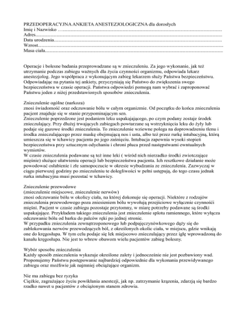 PRZEDOPERACYJNA ANKIETA ANESTEZJOLOGICZNA dla dorosłych Imię i Nazwisko …................................................................................................................................ Adres...................................................................................................................................................... Data urodzenia....................................................................................................................................... Wzrost..................................................................................................................................................... Masa ciała............................................................................................................................................... Operacje i bolesne badania przeprowadzane są w znieczuleniu. Za jego wykonanie, jak też utrzymanie podczas zabiegu ważnych dla życia czynności organizmu, odpowiada lekarz anestezjolog. Jego współpraca z wykonującym zabieg lekarzem służy Państwa bezpieczeństwu. Odpowiadając na pytania tej ankiety, przyczyniają się Państwo do zwiększenia swego bezpieczeństwa w czasie operacji. Państwa odpowiedzi pomogą nam wybrać i zaproponować Państwu jeden z niżej przedstawionych sposobów znieczulenia. Znieczulenie ogólne (narkoza) znosi świadomość oraz odczuwanie bólu w całym organizmie. Od początku do końca znieczulenia pacjent znajduje się w stanie przypominającym sen. Znieczulenie poprzedzone jest podaniem leku uspakajającego, po czym podany zostaje środek znieczulający. Przy dłużej trwających zabiegach powtarzane są wstrzyknięcia leku do żyły lub podaje się gazowe środki znieczulenia. To znieczulenie wziewne polega na doprowadzeniu tlenu i środka znieczulającego przez maskę obejmującą nos i usta, albo też przez rurkę intubacyjną, którą umieszcza się w tchawicy pacjenta po jego zaśnięciu. Intubacja zapewnia wysoki stopień bezpieczeństwa przy sztucznym odychaniu i chroni płuca przed następstwami ewntualnych wymiotów. W czasie znieczulenia podawane są też inne leki ( wśród nich nierzadko środki zwiotczające mięśnie) służące ułatwieniu operacji lub bezpieczeństwa pacjenta. Ich resztkowe działanie może powodować osłabienie i złe samopoczucie w okresie wybudzania ze znieczulenia. Zazwyczaj w ciągu pierwszej godziny po znieczuleniu te dolegliwości w pełni ustępują, do tego czasu jednak rurka intubacyjna musi pozostać w tchawicy. Znieczulenie przewodowe (znieczulenie miejscowe, znieczulenie nerwów) znosi odczuwanie bólu w okolicy ciała, na której dokonuje się operacji. Niektóre z rodzajów znieczulenia przewodowego poza zniesieniem bólu wywołują przejściowe wyłącznie czynnośći mięśni. Pacjent w czasie zabiegu pozostaje przytomny, w miarę potrzeby podawane są środki uspakajające. Przykładem takiego znieczulenia jest znieczulenie splotu ramiennego, które wyłącza odczuwanie bólu od barku do palców ręki po jednej stronie. W przypadku znieczulenia zewnątrzoponowego lub podpajęczynówkowego dąży się do zablokowania nerwów przewodzących ból, z określonych okolic ciała, w miejscu, gdzie wnikają one do kręgosłupa. W tym celu podaje się lek miejscowo znieczulający przez igłę wprowadzoną do kanału kręgosłupa. Nie jest to wbrew obawom wielu pacjentów zabieg bolesny. Wybór sposobu znieczulenia Każdy sposób znieczulenia wykazuje określone zalety i jednocześnie nie jest pozbawiony wad. Proponujemy Państwu postępowanie najbardziej odpowiednie dla wykonania przewidywanego zabiegu oraz możliwie jak najmniej obciążające organizm. Nie ma zabiegu bez ryzyka Ciężkie, zagrażające życiu powikłania anestezji, jak np. zatrzymanie krązenia, zdarzją się bardzo rzadko nawet u pacjentów z obciążonym stanem zdrowia. Współczesne znieczulenie ogólne, dzięki kombinacji różnych środków anestezjologicznych i ich dokładnemu dawkowaniu oraz dzięki prowadzeniu oddechu zastępczego przy pomocy respiratorów pozwala precyzyjnie sterować oddechem, krążeniem i innym ważnymi dla życia funkcjami organizmu, które są przez cały czas znieczulenia na bieżąco monitorowane w celu zapobieżenia możliwym powikłaniom. Wraz z lekarzami operującymi stale kontrolujemy ułożenie pajenta na stole operacyjnym, tak by uniknąć uszkodzenia nerwów przez ucisk lub naciągnięcie. Znieczulenie miejscowe obciąża organizm w minimalnym stopniu. Wbrew obawom niektórych pacjentów uszkodzenia nerwów podczas znieczulenia zewnątrzoponowego lub podpajęczynówkowego są skrajnie rzadkie. Prosimy przestrzegać zaleceń. Aby uniknąć zachłyśnięcia (tj. przedostania się wymiocin do dróg oddechowych) należy: 6-8 godzin przed operacją pozostawać bez jedzenia i picia, przez 6 godzin przed operacją nie palić papierosów Przed przyjęciem na salę operacyjną prosimy zdjąć i dobrze zabezpieczyć protezy zębowe, szkła kontaktowe, biżuterię, sztuczne włosy. Należy usunąć makijaż i lakier do paznokci. Prosimy o dokładne informacje Jak przy każdym zabiegu lekarskim tak i przy znieczuleniu obciążenia i ryzyko są w przypadku każdego pacjenta inne. Istotne są zwłaszcza rodzaj i ciężkość schorzeń, zarówno przebytych jak też towarzyszących chorobie podstawowej, ogólny stan zdrowia, poziom życia praz nawyki życiowe. Dla ograniczenia możliwego ryzyka, a zatem dla osiągnięcia maksimum bezpieczeństwa, pomocne są informacje zawarte w Państwa odpowiedziach na poniższe pytania. Tych pytań jest tak wiele, ponieważ chcemy uniknąć nawet niewielkiego lub mało istotnego zagrożenia. W przypadku wątpliwości podczas wypełniania ankiety prosimy skorzystać z pomocy pielęgniarki lub lekarza anestezjologa. Wywiad od pacjenta 1. Jaki zawód Pan/Pani wykonuje? ….....................................................................................................