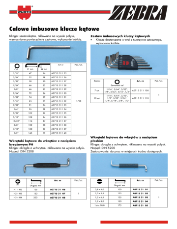 Calowe imbusowe klucze kątowe Klinga: sześciokątna, niklowana na wysoki połysk, wzmocnione powierzchnie czołowe, wykonanie krótkie. Art nr Zestaw imbusowych kluczy kątowych Klucze dostarczane w etui z tworzywa sztucznego, wykonanie krótkie. Pak./szt. Cal L1 mm L2 mm 1/16” 47 16 A0715 311 25 5/64” 52 18 A0715 311 26 3/32” 58 20 A0715 311 27 7/64” 66 23 A0715 311 28 Zawartość cal 1/8” 66 23 A0715 311 29 7 szt. A0715 311 100 9/64” 72 26 A0715 311 30 1/16”, 5/64”, 3/32”, 1/8”, 5/32”, 3/16”, 1/4” 5/32” 74 29 A0715 311 31 10 szt. A0715 311 110 3/16” 85 33 A0715 311 32 1/16”, 5/64”, 3/32”, 1/8”, 5/32”, 3/16”, 1/4”, 5/16”, 3/8”, 1/2” 7/32” 91 36 A0715 311 33 1/4” 96 38 A0715 311 34 9/32” 102 42 A0715 311 35 5/16” 108 44 A0715 311 36 11/32” 114 47 A0715 311 37 3/8” 122 50 A0715 311 38 7/16” 130 53 A0715 311 39 1/2” 145 63 A0715 311 40 1/10 Wkrętaki kątowe do wkrętów z nacięciem krzyżowym PH Klinga: okrągła z uchwytem, niklowana na wysoki połysk. Napęd: DIN 5208 Art. nr PH Art. nr Zestaw Pak./szt. 1 Wkrętaki kątowe do wkrętów z nacięciem płaskim Klinga: okrągła z uchwytem, niklowana na wysoki połysk. Napęd: DIN 5200 Zastosowanie: do prac w miejscach trudno dostępnych. Art. nr Pak./szt. Pak./szt. Długość mm Długość mm H1 + H2 125 A0715 31 06 H2 + H3 150 A0715 31 07 H3 + H4 200 A0715 31 08 1 0,8 x 4,0 100 A0715 31 01 1,0 x 5,5 125 A0715 31 02 1,2 x 6,5 125 A0715 31 03 1,2 x 8,0 150 A0715 31 04 1,6 x 10,0 175 A0715 31 05 1