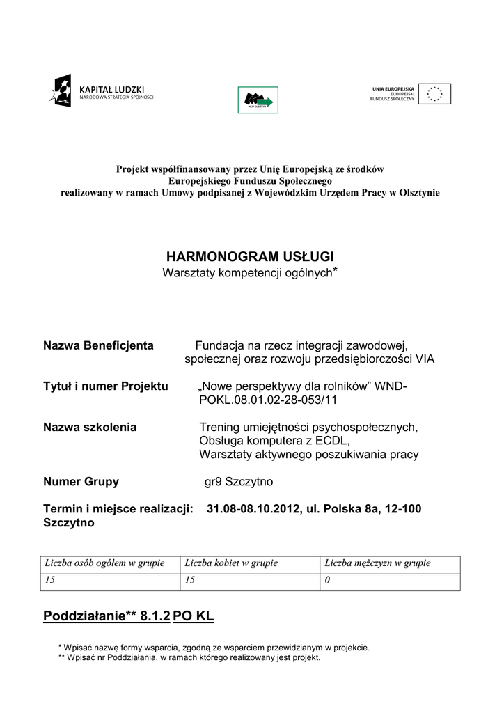 Projekt współfinansowany przez Unię Europejską ze środków Europejskiego Funduszu Społecznego realizowany w ramach Umowy podpisanej z Wojewódzkim Urzędem Pracy w Olsztynie HARMONOGRAM USŁUGI Warsztaty kompetencji ogólnych* Nazwa Beneficjenta Fundacja na rzecz integracji zawodowej, społecznej oraz rozwoju przedsiębiorczości VIA Tytuł i numer Projektu „Nowe perspektywy dla rolników” WNDPOKL.08.01.02-28-053/11 Nazwa szkolenia Trening umiejętności psychospołecznych, Obsługa komputera z ECDL, Warsztaty aktywnego poszukiwania pracy Numer Grupy gr9 Szczytno Termin i miejsce realizacji: Szczytno 31.08-08.10.2012, ul. Polska 8a, 12-100 Liczba osób ogółem w grupie Liczba kobiet w grupie Liczba mężczyzn w grupie 15 15 0 Poddziałanie** 8.1.2 PO KL * Wpisać nazwę formy wsparcia, zgodną ze wsparciem przewidzianym w projekcie. ** Wpisać nr Poddziałania, w ramach którego realizowany jest projekt. 1. Harmonogram usługi Data 31.08 10.09 11.09 12.09 13.09 14.09 17.09 18.09 Godziny zajęć (należy wskazać dokładne godziny przerw między zajęciami) 08:00 – 08:45 08:55 – 09:40 09:45 – 10:30 10:40 – 11:25 11:30 – 12:15 12:25 – 13:10 08:00 – 08:45 08:55 – 09:40 09:45 – 10:30 10:40 – 11:25 11:30 – 12:15 12:25 – 13:10 08:00 – 08:45 08:55 – 09:40 09:45 – 10:30 10:40 – 11:25 11:30 – 12:15 12:25 – 13:10 08:00 – 08:45 08:55 – 09:40 09:45 – 10:30 10:40 – 11:25 11:30 – 12:15 12:25 – 13:10 08:00 – 08:45 08:55 – 09:40 09:45 – 10:30 10:40 – 11:25 11:30 – 12:15 12:25 – 13:10 08:00 – 08:45 08:55 – 09:40 09:45 – 10:30 10:40 – 11:25 11:30 – 12:15 12:25 – 13:10 08:00 – 08:45 08:55 – 09:40 09:45 – 10:30 10:40 – 11:25 11:30 – 12:15 12:25 – 13:10 08:00 – 08:45 08:55 – 09:40 Liczba godzin Temat zajęć Trening umiejętności psychospołecznychPOZNAJEMY SIEBIE Przełamanie barier związanych z poznaniem grupy. Integracja – trening umiejętności psychospołecznych i interpersonalnych. (Trener Wykładowca Miejsce realizacji zajęć (miejscowość, ulica, nr lokalu/nazwa instytucji, nr sali) Anna Baska Ul. Polska 8a, 12-100 Szczytno Anna Baska Ul. Polska 8a, 12-100 Szczytno Anna Baska Ul. Polska 8a, 12-100 Szczytno Anna Baska Ul. Polska 8a, 12-100 Szczytno Anna Baska Ul. Polska 8a, 12-100 Szczytno Agata Plusarczyk Ul. Polska 8a, 12-100 Szczytno Agata Plusarczyk Ul. Polska 8a, 12-100 Szczytno Agata Plusarczyk Ul. Polska 8a, 12-100 Szczytno 6 Grupa) Trening umiejętności psychospołecznychCZŁOWIEK ISTOTA SPOŁECZNA Trening interpersonalny, budowanie poczucia bezpieczeństwa i poznanie się uczestników szkolenia. Trening umiejętności psychospołecznychCO TO JEST KOMUNIKACJA Zapoznanie się z pojęciami komunikacja, komunikacja werbalna, komunikacja pozawerbalna – ćwiczenia, uczymy się wyróżniać. Trening umiejętności psychospołecznychZACHOWYWAĆ SIĘ …. Rozpoznajemy zachowania (agresywne, asertywne, uległe) trening asertywności, co to są uczucia i co potrafią z nami robić. Trening umiejętności psychospołecznychTWÓRCZOŚĆ Bycie kreatywnym, poszukiwanie nowych rozwiązań w starych sprawach jak uniknąć zaszufladkowania, rozciąganie świata za pomocą słowa. Warsztaty aktywnego poszukiwania pracy Prawo pracy - rodzaje wmów o pracę oraz cywilnoprawnych - rozwiązanie stosunku pracy - prawa i obowiązki pracownika - prawa i obowiązki pracodawcy, w szczególności w stosunku do osób niepełnosprawnych Warsztaty aktywnego poszukiwania pracy Tworzenie dokumentów aplikacyjnych - CV- obowiązujące zasady i trendy - przydatne słowa, zwroty, ważne umiejętności - rodzaje życiorysów zawodowych- wady i zalety każdego z nich - list motywacyjny- zasady tworzenia Warsztaty aktywnego poszukiwania pracy 6 6 6 6 6 6 6 09:45 – 10:30 10:40 – 11:25 11:30 – 12:15 12:25 – 13:10 19.09 20.09 21.09 24.09 25.09 26.09 27.09 08:00 – 08:45 08:55 – 09:40 09:45 – 10:30 10:40 – 11:25 11:30 – 12:15 12:25 – 13:10 08:00 – 08:45 08:55 – 09:40 09:45 – 10:30 10:40 – 11:25 11:30 – 12:15 12:25 – 13:10 08:00 – 08:45 08:55 – 09:40 09:45 – 10:30 10:40 – 11:25 11:30 – 12:15 12:25 – 13:10 13:15 – 14:00 08:00 – 08:45 08:55 – 09:40 09:45 – 10:30 10:40 – 11:25 11:30 – 12:15 12:25 – 13:10 13:15 – 14:00 08:00 – 08:45 08:55 – 09:40 09:45 – 10:30 10:40 – 11:25 11:30 – 12:15 12:25 – 13:10 13:15 – 14:00 08:00 – 08:45 08:55 – 09:40 09:45 – 10:30 10:40 – 11:25 11:30 – 12:15 12:25 – 13:10 13:15 – 14:00 08:00 – 08:45 08:55 – 09:40 09:45 – 10:30 10:40 – 11:25 11:30 – 12:15 Autoprezentacja i prowadzenie rozmów kwalifikacyjnych - sztuka kreowania własnego wizerunku (wygląd, ubiór, itp.) - metody doboru i selekcji pracowników - oczekiwania pracodawcy - przygotowanie do spotkania z pracodawcą - trudne pytania, sposoby radzenia sobie z nimi Warsztaty aktywnego poszukiwania pracy Aktywne metody poszukiwania pracy - rynek pracy- charakterystyka - źródła informacji o miejscach pracyAgencje Zatrudnienia, portale, itp. Warsztaty aktywnego poszukiwania pracy Aktywne metody poszukiwania pracy - analiza ogłoszeń prasowych oraz konstruowanie własnych anonsów Ul. Polska 8a, 12-100 Szczytno Mateusz Bartoszewicz Ul. Polska 8a, 12-100 Szczytno Tadeusz Zapadka Ul. Polska 8a, 12-100 Szczytno Tadeusz Zapadka Ul. Polska 8a, 12-100 Szczytno Tadeusz Zapadka Ul. Polska 8a, 12-100 Szczytno 7 7 Obsługa komputera z ECDL MICROSOFT WORD – przetwarzanie tekstów Wstawianie tabel – formatowanie, korespondencja seryjna, hiperłącza, Testy próbne przygotowujące do egzaminu Mateusz Bartoszewicz 7 Obsługa komputera z ECDL MICROSOFT WORD – przetwarzanie tekstów Pisanie tekstu, formatowanie tekstu przy użyciu funkcji programu, Wstawianie grafiki – formatowanie, Wstawianie wykresów – formatowanie Ul. Polska 8a, 12-100 Szczytno 7 Obsługa komputera z ECDL MICROSOFT WORD – przetwarzanie tekstów Zapoznanie z programem i jego funkcjami ( nar