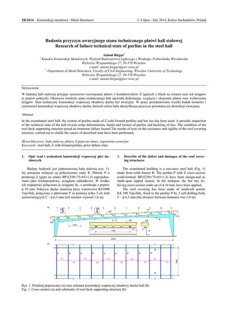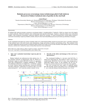 ZK2014 – Konstrukcje metalowe / Metal Structures 2–4 lipca / July 2014, Kielce-Suchedniów, Poland Badania przyczyn awaryjnego stanu technicznego płatwi hali stalowej Research of failure technical state of purlins in the steel hall 1 Antoni Biegus1 Katedra Konstrukcji Metalowych, Wydział Budownictwa Lądowego i Wodnego, Politechnika Wrocławska Wybrzeże Wyspiańskiego 27, 50-370 Wrocław e-mail: [email protected] 1 Department of Metal Structures, Faculty of Civil Engineering, Wrocław University of Technology Wybrzeże Wyspiańskiego 27, 50-370 Wrocław e-mail: [email protected] Streszczenie W badanej hali stalowej przyjęto systemowe rozwiązanie płatwi z kształtowników Z (giętych z blach na zimno) oraz ich ściągów (z prętów pełnych). Okresowa kontrola stanu technicznego hali ujawniła deformacje, wygięcia i skręcenie płatwi oraz wyboczenia ściągów. Stan techniczny konstrukcji wsporczej obudowy dachu był awaryjny. W pracy przedstawiono wyniki badań nośności i sztywności konstrukcji wsporczej obudowy dachu, których celem była identyfikacja przyczyn powstania jej destrukcji awaryjnej. Abstract In the exanimated steel hall, the system of purlins made of Z cold-formed profiles and bar ties has been used. A periodic inspection of the technical state of the hall reveals some deformations, bends and torsion of purlins and buckling of ties. The condition of the roof deck supporting structure posed an imminent failure hazard.The results of tests on the resistance and rigidity of the roof covering structure, carried out to clarify the causes of described state have been performed. Słowa kluczowe: hala stalowa, płatew Z gięta na zimno, zagrożenia awaryjne Keywords: steel hall, Z cold-formed purlins, prior-failure state. 1. Opis wad i uszkodzeń konstrukcji wsporczej płyt dachowych Badany budynek jest jednonawową halą stalową (rys. 1). Jej ustrojami nośnymi są pełnościenne ramy R. Płatwie P o przekroju Z (gięte na zimno BP/Z25075651,5) zaprojektowano jako wieloprzęsłowe, uciąglane zakładkowo. W środku ich rozpiętości połączono je ściągami Sc, o przekroju z prętów 10 mm. Pokrycie dachu stanowią płyty warstwowe KS1000 Top-Dek, połączone z płatwiami P za pomocą tylko 2-ch śrub samowiercących C - 6,3 mm (ich rozstaw wynosił 1,0 m). 1. Describe of the defect and damages of the roof covering structures The examinated building is a one-nave steel hall (Fig. 1) made from solid frames R. The purlins P with Z cross-section (cold-formed; BP/Z25075651,5) have been design-ned as multi-span lapped system. In the midspan, the bar ties Sc, having cross section made up of 10 mm, have been applied. The roof covering has been made of sandwich panels KS 100 Top-Dek, fixed to the purlins P by 2 self-drilling bolts C - 6,3 mm (the distance between fasteners was 1,0 m). Rys. 1. Przekrój poprzeczny (a) oraz schemat konstrukcji wsporczej obudowy dachu hali (b) Fig. 1. Cross section (a) and schematic of roof deck supporting structure (b) ZK2014 – Konstrukcje metalowe / Metal Structures 2–4 lipca / July 2014, Kielce-Suchedniów, Poland Rys. 2. Przykład wygiętej i skręconej płatwi P oraz wyboczonego ściągu Sc, L - linka Fig. 2. Example of curved and twisted P-purlin with buckled Sc-tie, L - cable W trakcie kontroli stanu technicznego hali stwierdzono wygięcia i skręcenia płatwi P oraz ściągów Sc (rys. 2), co świadczyło o ich awaryjnym stanie technicznym. Pomiary prostoliniowości płatwi P wykazały, że ich poziome wygięcia wynosiły nawet e = 25 mm i były one większe o 317% od dopuszczalnych wg [4] yult = 1/1000 5680 6 mm < e = 25 mm. Należy podkreślić, iż wygięcia i skręcenia płatwi P miały charakter trwały i dotyczyły rozciąganej części ich przekrojów, co świadczyło o ich skręcaniu. Ponadto stwierdzono wyboczenia plastyczne 8 ściągów Sc (rys. 2 - można wnioskować, że były one ściskane) a także występowanie „poluzowanych” ściągów Sc. W połączeniach ściągów Sc z płatwiami P występowały odkształcenia plastyczne środników płatwi P, o „głębokości” 1020 mm. Powstały one w wyniku dużych przemieszczeń poziomych wywołanych skręcaniem płatwi. 2. Analiza przyczyn awaryjnego stanu płatwi i ściągów Nośności płatwi obliczono zakładając, że są one usztywnione „bocznie” przez połączenie ich półki górnej z tarczą z blachy fałdowej. Niestety tej bardzo ważnej informacji nie podano w opisie tablic nośności płatwi w katalogu producenta tych wyrobów. Gięty na zimno z blach kształtownik Z o niesymetrycznym przekroju otwartym i cienkich ściankach, wykazuje małą sztywność na skręcanie swobodne oraz znaczną wrażliwość na wyboczenie miejscowe i dystorsyjne. W konsekwencji tego jest elementem o bardzo małej nośności na zwichrzenie. By mógł być efektywnie stosowany jako element zginany, wymaga zabezpieczenia przed zwichrzeniem i skręcaniem [2], [3]. Pełne ciągłe stężenie „boczne” płatwi można uzyskać za pomocą m.in. blachy fałdowej, połączonej w sposób ciągły (gęsty) ich dolnymi fałdami z pasem górnym płatwi. Blacha fałdowa krępuje przemieszczenia liniowe i kątowe przylegającej stopki płatwi, co wydatnie podnosi jej nośność z warunku zwichrzenia. Zgodnie z [6] płatew w miejscu połączenia z blachą fałdową można uważać za stężoną w płaszczyźnie poszycia (zabezpieczoną przed zwichrzeniem) jeśli spełniony jest warunek During the inspection both the bends and torsions of Ppurlins an Sc-ties (Fig. 2) were found, indicating the state of emergency. The measurement of the P - purling has shown out of the straightness of about e = 25 mm, i.c. 317% of ultimate value according to [4] yult = 1/1000 5680 6 mm < e = 25 mm. It should be noted, that the permanent bends and torsion of Ppurlins have occurred at the tensile portion of their crosssections, what is characteristic for torsional type of deformation. Moreover, the yield 