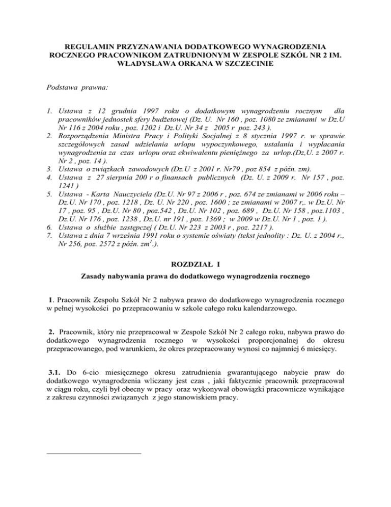 REGULAMIN PRZYZNAWANIA DODATKOWEGO WYNAGRODZENIA ROCZNEGO PRACOWNIKOM ZATRUDNIONYM W ZESPOLE SZKÓL NR 2 IM. WŁADYSŁAWA ORKANA W SZCZECINIE Podstawa prawna: 1. Ustawa z 12 grudnia 1997 roku o dodatkowym wynagrodzeniu rocznym dla pracowników jednostek sfery budżetowej (Dz. U. Nr 160 , poz. 1080 ze zmianami w Dz.U Nr 116 z 2004 roku , poz. 1202 i Dz.U. Nr 34 z 2005 r poz. 243 ). 2. Rozporządzenia Ministra Pracy i Polityki Socjalnej z 8 stycznia 1997 r. w sprawie szczegółowych zasad udzielania urlopu wypoczynkowego, ustalania i wypłacania wynagrodzenia za czas urlopu oraz ekwiwalentu pieniężnego za urlop.(Dz,U. z 2007 r. Nr 2 , poz. 14 ). 3. Ustawa o związkach zawodowych (Dz.U z 2001 r. Nr79 , poz 854 z późn. zm). 4. Ustawa z 27 sierpnia 200 r o finansach publicznych (Dz. U. z 2009 r. Nr 157 , poz. 1241 ) 5. Ustawa - Karta Nauczyciela (Dz.U. Nr 97 z 2006 r , poz. 674 ze zmianami w 2006 roku – Dz.U. Nr 170 , poz. 1218 , Dz. U. Nr 220 , poz. 1600 ; ze zmianami w 2007 r,. w Dz.U. Nr 17 , poz. 95 , Dz.U. Nr 80 , poz.542 , Dz.U. Nr 102 , poz. 689 , Dz.U. Nr 158 , poz.1103 , Dz.U. Nr 176 , poz. 1238 , Dz.U. nr 191 , poz. 1369 ; w 2009 w Dz.U. Nr 1 , poz. 1 ). 6. Ustawa o służbie zastępczej ( Dz.U. Nr 223 z 2003 r , poz. 2217 ). 7. Ustawa z dnia 7 września 1991 roku o systemie oświaty (tekst jednolity : Dz. U. z 2004 r., Nr 256, poz. 2572 z późn. zm1.). ROZDZIAŁ I Zasady nabywania prawa do dodatkowego wynagrodzenia rocznego 1. Pracownik Zespołu Szkół Nr 2 nabywa prawo do dodatkowego wynagrodzenia rocznego w pełnej wysokości po przepracowaniu w szkole całego roku kalendarzowego. 2. Pracownik, który nie przepracował w Zespole Szkół Nr 2 całego roku, nabywa prawo do dodatkowego wynagrodzenia rocznego w wysokości proporcjonalnej do okresu przepracowanego, pod warunkiem, że okres przepracowany wynosi co najmniej 6 miesięcy. 3.1. Do 6-cio miesięcznego okresu zatrudnienia gwarantującego nabycie praw do dodatkowego wynagrodzenia wliczany jest czas , jaki faktycznie pracownik przepracował w ciągu roku, czyli był obecny w pracy oraz wykonywał obowiązki pracownicze wynikające z zakresu czynności związanych z jego stanowiskiem pracy. 3.2. Urlop wypoczynkowy traktowany jest na równi z okresem świadczenia pracy. 3.3. Wszelkie inne okresy w ciągu zatrudnienia traktowane są jako okresy nieprzepracowane niezależnie od tego, czy pracownik zachowuje prawo do wynagrodzenia czy też nie (choroba, świadczenie rehabilitacyjne, urlop macierzyński, urlop bezpłatny, opieka nad dzieckiem, urlopy okolicznościowe). 3.4. W przypadku posiadania kilku umów o pracę w tej samej szkole w danym roku kalendarzowym do obliczenia 6-cio miesięcznego okresu zatrudnienia sumuje się dni przepracowane przyjmując za miesiąc 30 dni roboczych, zgodnie z art. 114 Kodeksu Cywilnego i z art. 300 kodeksu pracy. 3.5. Ustalając okres zatrudnienia w szkole przyjmuje się, że miesiąc pracy upływa w dniu bezpośrednio poprzedzającym dzień, który datą odpowiada dniowi, w którym pracownik został zatrudniony. 4. Pracownik oddelegowany do pracy w zarządzie zakładowej organizacji związkowej zachowuje prawo do wypłaty dodatkowego wynagrodzenia rocznego. 5. Dodatkowe wynagrodzenia roczne otrzymują wyłącznie pracownicy zatrudnieni na podstawie umowy o pracę, a do wymaganego 6-cio miesięcznego okresu zatrudnienia zalicza się tylko okresy pracy potwierdzone umowami o pracę w szkole. 6. 1. Przepracowanie 6-cio miesięcznego okresu w szkole warunkującego nabycie prawa do dodatkowego wynagrodzenia nie jest wymagane w następujących przypadkach : 1) nawiązania stosunku pracy w trakcie roku szkolnego z nauczycielem zgodnie z organizacją pracy szkoły czyli zatrudnienia nauczyciela z dniem 1 września; 2) zatrudnienia pracownika do pracy sezonowej, jeżeli umowa o pracę została zawarta na sezon nie krótszy niż trzy miesiące; 3) powołania pracownika do czynnej służby wojskowej albo do spełnienia obowiązku zastępczej służby wojskowej; 4) rozwiązania stosunku pracy w szkole w związku z : a) przejściem na emeryturę, rentę z tytułu niezdolności do pracy , świadczeniem rehabilitacyjnym b) przeniesieniem służbowym, powołaniem lub wyborem, c) likwidacją szkoły lub zwolnieniem pracownika z przyczyn dotyczących pracodawcy. 5) podjęcia zatrudnienia: a) w wyniku przeniesienia służbowego, b) na podstawie powołania lub wyboru, c) w związku z likwidacją jednostki organizacyjnej poprzedniego pracodawcy lub jej reorganizacją, d) w związku z likwidacją poprzedniego pracodawcy albo zwolnieniem pracownika z przyczyn dotyczących tego pracodawcy. 6) korzystania : a) z urlopu wychowawczego, b) z urlopu dla poratowania zdrowia, c) z urlopu do celów naukowych, zawodowego. artystycznych lub kształcenia 7) wygaśnięcia stosunku pracy w związku ze śmiercią pracownika. 7. 1. Pracownik traci prawo do dodatkowego rocznego wynagrodzenia w przypadkach: 1) 2) 3) 4) nieobecności w pracy z przyczyn nieusprawiedliwionych dłużej niż dwa dni; stawienia się lub przebywania w pracy w stanie nietrzeźwości; otrzymania kary dyscyplinarnej wydalenia z pracy; rozwiązania umowy o pracę bez wypowiedzenia z winy pracownika (zwolnienie dyscyplinarne). ROZDZIAŁ II Zasady ustalania wysokości dodatkowego wynagrodzenia rocznego 8. 1. Wynagrodzenie roczne ustala się w wysokości 8,5 % sumy wynagrodzenia za pracę otrzymanego przez pracownika w ciągu roku kalendarzowego, za który przysługuje to wynagrodzenie i inne świadczenia ze stosunku pracy przyjmowane do obliczenia ekwiwalentu pieniężnego za urlop wypoczynkowy, a także wynagrodzenie za czas pozostawania bez pracy przysługujące pracownikowi, który podjął pracę w wyniku przywrócenia do pracy. 9. 1. Do wysokości dodatkowego rocznego wynagrodzenia nauczyciela wlicza się: 1) wynagrodzenie zasadnicze otrzymywane przez nauczyciela w ciągu roku kalendarzowego; 2) inne świadczenie ze stosunku pracy, przyjmowane do oblic