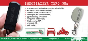 IMMOBILISER ZERO_GHz t supernowoczesna, dwukierunkowa łączność w paśmie 2.4GHz, t zero prądu w czasie czuwania (motocykle), t najmnieszy na rynku 1cm x 2.5cm x 7cm, t bezobsługowy, dwa klucze w komplecie, t sygnalizacja diodą LED i buzerem, t awaryjny KOD odblokowujący, t blokada - przekaźnik 5A, t homologacja E20, t prosty montaż, PROXIMA sp.j, 87-100 Toruń, ul. Filtrowa 23 tel. (056) 660 2000 www.proxima.pl ISO 9001 na rynku od 1995r Wszystko co należy do obowiązków kierowcy to posiadać przy sobie niewielki bezprzewodowy Klucz Elektroniczny – BKE. Zalecanym miejscem przechowywania BKE jest etui na pasku do spodni, portfelu, kieszeni marynarki czy kombinezonu. UWAGA Klucza BKE nie należy przypinać do kluczyków, ponieważ w przypadku ich kradzieży, również złodziej może uruchomić pojazd. BKE nie należy również pozostawiać w samochodzie, ponieważ centrala zawsze pozytywnie zweryfikuje jego obecność. UŻYWANIE IMMOBILISERA Po wejściu do pojazdu i włączeniu stacyjki centrala IMMOBILISERa ZERO_GHz podejmuje próbę nawiązania dwustronnej łączności radiowej z Bezprzewodowym Kluczem Elektronicznym – BKE w którego posiadaniu powinien być kierowca. Potwierdzeniem nawiązania łączności jest krótka melodyjka. Jeśli łączność zostanie nawiązana można jechać. Jeżeli centrala IMMOBILISERa ZERO_GHz w ciągu 10s nie nawiąże łączności z BKE rozłącza obwód blokujący i rozpoczyna oczekiwanie na awaryjne rozbrojenie. AWARYJNE ROZBROJENIE - STAN SERWISOWY Awaryjne rozbrojenie umożliwia uruchomienie pojazdu właścicielowi który utracił klucz BKE, bądź nastąpiła awaria klucza BKE np. wyczerpała sie bateria CR2032. Wymaga jednak od właściciela znajomości kodu awaryjnego (kod fabryczny to 111) jak i procedury wejścia do stanu serwisowego. BEZOBSŁUGOWY KLUCZ ELEKTRONICZNY - BKE zawiera baterię, którą należy regularnie wymieniać. Czas pracy baterii zmienia sie w zależności od jakości baterii, temperatury i czasu jazdy. Zwykle waha sie od 3 do 6 miesięcy. Dobrym zwyczajem jest wożenie w samochodzie zapasowej baterii CR2032. Następnie IMMOBILISER ZERO_GHz gra dwa razy melodyjkę która oznacza, że za chwilę wygeneruje 10 krótkich sygnałów (tonów) z pośród których należy wybrać drugą cyfrę kodu. Należy liczyć impulsy. Wybór polega na szybkim (krótszym niż 1s) wyłączeniu i włączeniu stacyjki zaraz po usłyszeniu impulsu który odpowiada drugiej cyfrze kodu. Schemat montażowy I dalej, IMMOBILISER ZERO_GHz gra trzy razy melodyjkę która oznacza, że za chwilę wygeneruje 10 krótkich sygnałów (tonów) z pośród których należy wybrać trzecią cyfrę kodu. Należy liczyć impulsy. Wybór polega na szybkim (krótszym niż 1s) wyłączeniu i włączeniu stacyjki zaraz po usłyszeniu impulsu który odpowiada trzeciej cyfrze kodu. + 12V po stacyjce + Jeżeli trzy kolejne cyfry zostały wprowadzone błędnie to usłyszymy krótką i niską melodię błędu. Jeżeli trzy kolejne cyfry kodu zostały wybrane poprawnie, usłyszymy pięć długich (5s) tonów dźwiękowych - w czasie trwania trzeciego sygnału należy wyłączyć stacyjkę. 4 12345 + Szanowny Kierowco, IMMOBILISER ZERO_GHz jest supernowoczesnym, bezobsługowym, dwukierunkowym immobiliserem pracującym w mało zakłóconym paśmie radiowym 2.4GHz. Jeżeli IMMOBILISER ZERO_GHz nie może nawiązać łączności z BKE to po 10s gra jeden raz melodyjkę która oznacza, że za chwilę wygeneruje 10 krótkich sygnałów (tonów) z pośród których należy wybrać pierwszą cyfrę kodu. Należy liczyć impulsy. Wybór polega na szybkim (krótszym niż 1s) wyłączeniu i włączeniu stacyjki zaraz po usłyszeniu impulsu który odpowiada pierwszej cyfrze kodu. - Opis działania LED 1k 3 Buzer IMMOBILISER ZERO_GHz znajduje się od tego momentu w stanie serwisowym w którym nie blokuje samochodu, a potwierdzeniem braku ochrony jest krótki sygnał akustyczny (ton) powtarzany co minutę podczas jazdy. Blokada 5A 5 2 IMMOBILISER ZERO_GHz wychodzi automatycznie ze stanu serwisowego jeżeli nawiąże łączność z kluczem BKE przez co najmniej jedną minutę, a potwierdzeniem tego jest krótka dwutaktowa melodyjka. Masa 1