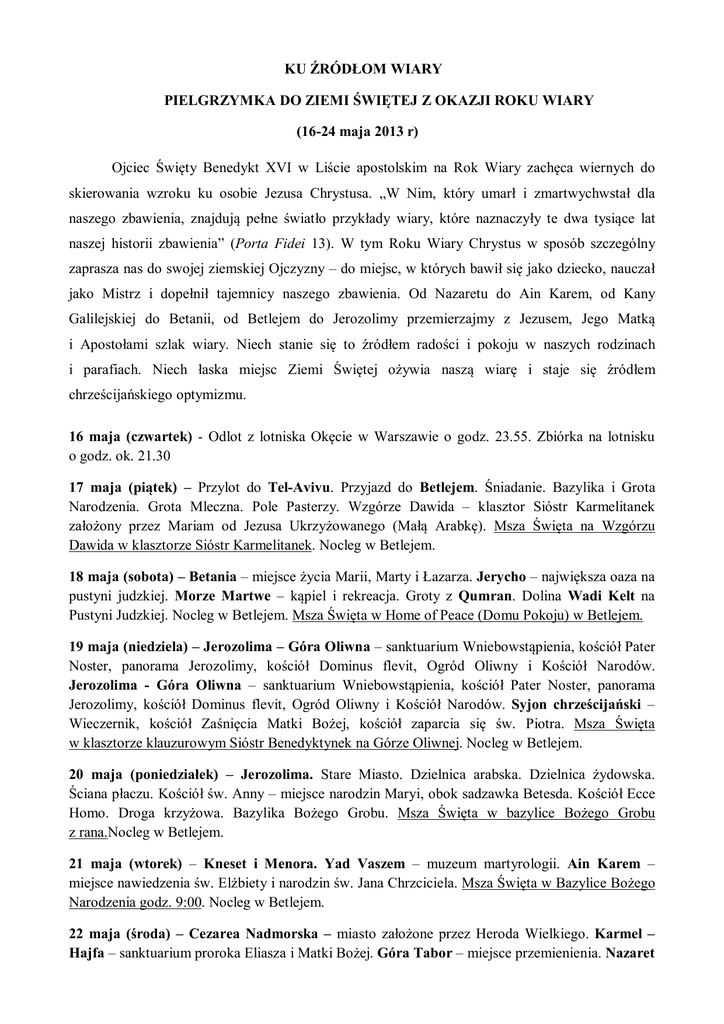 KU ŹRÓDŁOM WIARY PIELGRZYMKA DO ZIEMI ŚWIĘTEJ Z OKAZJI ROKU WIARY (16-24 maja 2013 r) Ojciec Święty Benedykt XVI w Liście apostolskim na Rok Wiary zachęca wiernych do skierowania wzroku ku osobie Jezusa Chrystusa. „W Nim, który umarł i zmartwychwstał dla naszego zbawienia, znajdują pełne światło przykłady wiary, które naznaczyły te dwa tysiące lat naszej historii zbawienia” (Porta Fidei 13). W tym Roku Wiary Chrystus w sposób szczególny zaprasza nas do swojej ziemskiej Ojczyzny – do miejsc, w których bawił się jako dziecko, nauczał jako Mistrz i dopełnił tajemnicy naszego zbawienia. Od Nazaretu do Ain Karem, od Kany Galilejskiej do Betanii, od Betlejem do Jerozolimy przemierzajmy z Jezusem, Jego Matką i Apostołami szlak wiary. Niech stanie się to źródłem radości i pokoju w naszych rodzinach i parafiach. Niech łaska miejsc Ziemi Świętej ożywia naszą wiarę i staje się źródłem chrześcijańskiego optymizmu. 16 maja (czwartek) - Odlot z lotniska Okęcie w Warszawie o godz. 23.55. Zbiórka na lotnisku o godz. ok. 21.30 17 maja (piątek) – Przylot do Tel-Avivu. Przyjazd do Betlejem. Śniadanie. Bazylika i Grota Narodzenia. Grota Mleczna. Pole Pasterzy. Wzgórze Dawida – klasztor Sióstr Karmelitanek założony przez Mariam od Jezusa Ukrzyżowanego (Małą Arabkę). Msza Święta na Wzgórzu Dawida w klasztorze Sióstr Karmelitanek. Nocleg w Betlejem. 18 maja (sobota) – Betania – miejsce życia Marii, Marty i Łazarza. Jerycho – największa oaza na pustyni judzkiej. Morze Martwe – kąpiel i rekreacja. Groty z Qumran. Dolina Wadi Kelt na Pustyni Judzkiej. Nocleg w Betlejem. Msza Święta w Home of Peace (Domu Pokoju) w Betlejem. 19 maja (niedziela) – Jerozolima – Góra Oliwna – sanktuarium Wniebowstąpienia, kościół Pater Noster, panorama Jerozolimy, kościół Dominus flevit, Ogród Oliwny i Kościół Narodów. Jerozolima - Góra Oliwna – sanktuarium Wniebowstąpienia, kościół Pater Noster, panorama Jerozolimy, kościół Dominus flevit, Ogród Oliwny i Kościół Narodów. Syjon chrześcijański – Wieczernik, kościół Zaśnięcia Matki Bożej, kościół zaparcia się św. Piotra. Msza Święta w klasztorze klauzurowym Sióstr Benedyktynek na Górze Oliwnej. Nocleg w Betlejem. 20 maja (poniedziałek) – Jerozolima. Stare Miasto. Dzielnica arabska. Dzielnica żydowska. Ściana płaczu. Kościół św. Anny – miejsce narodzin Maryi, obok sadzawka Betesda. Kościół Ecce Homo. Droga krzyżowa. Bazylika Bożego Grobu. Msza Święta w bazylice Bożego Grobu z rana.Nocleg w Betlejem. 21 maja (wtorek) – Kneset i Menora. Yad Vaszem – muzeum martyrologii. Ain Karem – miejsce nawiedzenia św. Elżbiety i narodzin św. Jana Chrzciciela. Msza Święta w Bazylice Bożego Narodzenia godz. 9:00. Nocleg w Betlejem. 22 maja (środa) – Cezarea Nadmorska – miasto założone przez Heroda Wielkiego. Karmel – Hajfa – sanktuarium proroka Eliasza i Matki Bożej. Góra Tabor – miejsce przemienienia. Nazaret – miejsce życia świętej Rodziny. Bazylika Zwiastowania. Kościół św. Józefa. . Msza Święta w Hajfie (Stella Maris). Nocleg w Nazarecie. 23 maja (czwartek) - Tyberiada – kościół św. Piotra. Tabgha – kościół „Rozmnożenia Chleba i Ryb”, kościół „Prymatu św. Piotra”, Kafarnaum – dom św. Piotra i synagoga. Rejs statkiem po Jeziorze Galilejskim. Góra Błogosławieństw. Msza Święta w kościele Prymatu św. Piotra godz. 11.00. Lunch i statek. Nocleg w Nazarecie. 24 maja (piątek) – o godz. 6.00 odlot do Polski. Przylot do Warszawy o godz. 9.00. Przewodnik: Ks. prof. Mirosław S. Wróbel Cena: 2000 PLN + 700 USD (wpłata na miejscu po przyjeździe) Wpłata zaliczki 500 zł przy zapisie Wpłata 1500 PLN do 15 lutego 2013 r. Dopłata za pokój 1 osobowy – 200 USD ZAPISY: Ks. Krzysztof GAŁAN – [email protected] Cena obejmuje: - przelot na trasie Warszawa – Tel Aviv – Warszawa - ubezpieczenie SIGNAL IDUNA KL 30 000 Euro, NNW 16000 PLN - zakwaterowanie w chrześcijańskich hotelach ***. Pokoje 2 osobowe z łazienkami. - wyżywienie: śniadanie, obiady i kolacje - przejazdy autokarem klimatyzowanym - bilety wstępu do zwiedzanych obiektów - rejs statkiem po Jeziorze Galilejskim + obiad z rybą św. Piotra Cena nie obejmuje: - transportu na lotnisko i z lotniska w Warszawie - opłaty za napoje do obiadów i kolacji - wydatków własnych - kolekty zbieranej podczas Mszy św. na wsparcie sanktuariów w Ziemi Świętej - dodatkowego ubezpieczenia od chorób przewlekłych Paszport musi być ważny minimum 6 miesięcy od daty powrotu z pielgrzymki