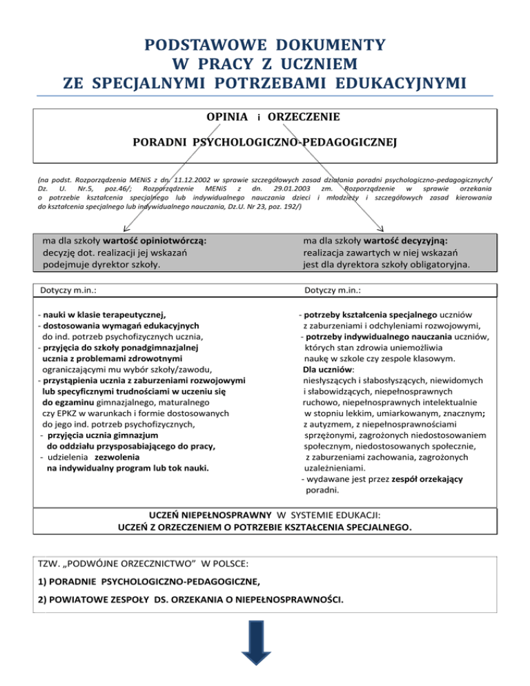 OPINIA i ORZECZENIE PORADNI PSYCHOLOGICZNO-PEDAGOGICZNEJ (na podst. Rozporządzenia MENiS z dn. 11.12.2002 w sprawie szczegółowych zasad działania poradni psychologiczno-pedagogicznych/ Dz. U. Nr.5, poz.46/; Rozporządzenie MENiS z dn. 29.01.2003 zm. Rozporządzenie w sprawie orzekania o potrzebie kształcenia specjalnego lub indywidualnego nauczania dzieci i młodzieży i szczegółowych zasad kierowania do kształcenia specjalnego lub indywidualnego nauczania, Dz.U. Nr 23, poz. 192/) ma dla szkoły wartość opiniotwórczą: decyzję dot. realizacji jej wskazań podejmuje dyrektor szkoły. ma dla szkoły wartość decyzyjną: realizacja zawartych w niej wskazań jest dla dyrektora szkoły obligatoryjna. Dotyczy m.in.: Dotyczy m.in.: - nauki w klasie terapeutycznej, - dostosowania wymagań edukacyjnych do ind. potrzeb psychofizycznych ucznia, - przyjęcia do szkoły ponadgimnazjalnej ucznia z problemami zdrowotnymi ograniczającymi mu wybór szkoły/zawodu, - przystąpienia ucznia z zaburzeniami rozwojowymi lub specyficznymi trudnościami w uczeniu się do egzaminu gimnazjalnego, maturalnego czy EPKZ w warunkach i formie dostosowanych do jego ind. potrzeb psychofizycznych, - przyjęcia ucznia gimnazjum do oddziału przysposabiającego do pracy, - udzielenia zezwolenia na indywidualny program lub tok nauki. - potrzeby kształcenia specjalnego uczniów z zaburzeniami i odchyleniami rozwojowymi, - potrzeby indywidualnego nauczania uczniów, których stan zdrowia uniemożliwia naukę w szkole czy zespole klasowym. Dla uczniów: niesłyszących i słabosłyszących, niewidomych i słabowidzących, niepełnosprawnych ruchowo, niepełnosprawnych intelektualnie w stopniu lekkim, umiarkowanym, znacznym; z autyzmem, z niepełnosprawnościami sprzężonymi, zagrożonych niedostosowaniem społecznym, niedostosowanych społecznie, z zaburzeniami zachowania, zagrożonych uzależnieniami. - wydawane jest przez zespół orzekający poradni. UCZEŃ NIEPEŁNOSPRAWNY W SYSTEMIE EDUKACJI: UCZEŃ Z ORZECZENIEM O POTRZEBIE KSZTAŁCENIA SPECJALNEGO. TZW. „PODWÓJNE ORZECZNICTWO” W POLSCE: 1) PORADNIE PSYCHOLOGICZNO-PEDAGOGICZNE, 2) POWIATOWE ZESPOŁY DS. ORZEKANIA O NIEPEŁNOSPRAWNOŚCI. STOPNIE: LEKKI UMIARKOWANY ZNACZNY ORZECZENIE O NIEPEŁNOSPRAWNOŚCI JAKO PODSTAWOWY DOKUMENT WYDAWANY PRZEZ POWIATOWE ZESPOŁY DS. ORZEKANIA O NIEPEŁNOSPRAWNOŚCI (na pdst. Ustawy o rehabilitacji oraz Rozporządzenia MGiPSz z dn.15 lipca 2003 w sprawie orzekania o niepełnosprawności i stopniu niepełnosprawności (DzU nr 139, poz. 1328 ze zm.) UCZEŃ MOŻE UZYSKAĆ TAKIE ORZECZENIE – JEŚLI: WYMAGA STAŁEJ OPIEKI LUB POMOCY Z POWODU NASTĘPUJĄCYCH SCHORZEŃ: WADY WRODZONE I SCHORZENIA O RÓŻNEJ ETIOLOGII SKUTKUJĄCE NIEDOWŁADAMI, PORAŻENIAMI KOŃCZYN, ZMIANAMI W NARZĄDZIE RUCHU, znacznie upośledzające zdolność chwytną rąk lub utrudniające samodzielne poruszanie się, WRODZONE LUB NABYTE CIĘŻKIE CHOROBY METABOLICZNE, UKŁADU KRĄŻENIA, ODDECHOWEGO, MOCZOWEGO, POKARMOWEGO, UKŁADU KRZEPNIĘCIA ORAZ INNE znacznie upośledzające sprawność organizmu, wymagające systematycznego leczenia domowego oraz okresowego leczenia szpitalnego, NIEPEŁNOSPRAWNOŚĆ INTELEKTUALNA – począwszy od STOPNIA UMIARKOWANEGO, PSYCHOZY I ZESPOŁY PSYCHOTYCZNE, CAŁOŚCIOWE ZABURZENIA ROZWOJOWE (W TYM: AUTYZM I ZESPÓŁ ASPERGERA) znacznie zaburzające interakcje społeczne lub komunikację werbalną oraz nasilające stereotypie zachowań, zainteresowań i aktywności, PADACZKA Z CZĘSTYMI NAPADAMI LUB WYRAŹNYMI NASTĘPSTWAMI PSYCHONEUROLOGICZNYMI, NOWOTWORY ZŁOŚLIWE I CHOROBY ROZROSTOWE UKŁADU KRWIOTWÓRCZEGO do 5 lat od zakończenia leczenia, WRODZONE LUB NABYTE WADY NARZĄDU WZROKU powodujące znaczne ograniczenie jego sprawności, obniżenie ostrości wzroku (wg. przyjętej jednostki) lub ograniczenie pola widzenia do przestrzeni zawartej w granicach 30 stopni, GŁUCHONIEMOTA, GŁUCHOTA LUB OBUSTRONNE UPOŚLEDZENIE SŁUCHU nie ulegające poprawie po zastosowaniu aparatu słuchowego czy implantu ślimakowego. SPEŁNIONE SĄ DODATKOWO NASTĘPUJĄCE WARUNKI: PRZEWIDYWANY CZAS POGORSZENIA STANU ZDROWIA z powodu choroby jest dłuższy niż 12 miesięcy, UCZEŃ JEST NIEZDOLNY DO SAMODZIELNEGO ZASPOKAJANIA POTRZEB ŻYCIOWYCH (samoobsługa, poruszanie się, komunikacja z otoczeniem), STAN ZDROWIA UCZNIA WYMAGA SYSTEMATYCZNYCH I CZĘSTYCH ZABIEGÓW leczniczych oraz rehabilitacyjnych w domu i poza nim. Co zyskuje uczeń? ZASIŁEK PIELĘGNACYJNY, ŚWIADCZENIE PIELĘGNACYJNE, ULGĘ REHABILITACYJNĄ, DODATEK Z TYTUŁU KSZTAŁCENIA I REHABILITACJI, DOFINANSOWANIE NA TURNUSY REHABILITACYJNE, NA SPRZĘT ORTOPEDYCZNY. Opracowanie Elżbieta Swat-Padrok