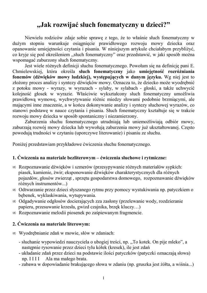 ,,Jak rozwijać słuch fonematyczny u dzieci?” Niewielu rodziców zdaje sobie sprawę z tego, że to właśnie słuch fonematyczny w dużym stopniu warunkuje osiągnięcie prawidłowego rozwoju mowy dziecka oraz opanowanie umiejętności czytania i pisania. W niniejszym artykule chciałabym przybliżyć, co kryje się pod określeniem ,,słuch fonematyczny” oraz przedstawić, w jaki sposób można wspomagać zaburzony słuch fonematyczny. Jest wiele różnych definicji słuchu fonematycznego. Powołam się na definicję pani E. Chmielewskiej, która określa słuch fonematyczny jako umiejętność rozróżniania fonemów (dźwięków mowy ludzkiej), występujących w danym języku. Wg niej jest to złożony proces analizy i syntezy dźwięków mowy. Oznacza to, że dziecko może wyodrębnić z potoku mowy - wyrazy, w wyrazach - sylaby, w sylabach - głoski, a także uchwycić kolejność głosek w wyrazie. Właściwie wykształcony słuch fonematyczny umożliwia prawidłową wymowę, wychwytywanie różnic miedzy słowami podobnie brzmiącymi, ale mającymi inne znaczenie, a w końcu dokonywanie analizy i syntezy słuchowej wyrazów, co stanowi podstawę w nauce czytania i pisania. Słuch fonematyczny kształtuje się w trakcie rozwoju mowy dziecka w sposób spontaniczny i niezamierzony. Zaburzenia słuchu fonematycznego utrudniają lub uniemożliwiają odbiór mowy, zaburzają rozwój mowy dziecka lub wywołują zaburzenia mowy już ukształtowanej. Często powodują trudności w czytaniu (uporczywe literowanie) i pisaniu ze słuchu. Poniżej przedstawiam przykładowe ćwiczenia słuchu fonematycznego. 1. Ćwiczenia na materiale bezliterowym – ćwiczenia słuchowe i rytmiczne: • Rozpoznawanie dźwięków i szmerów (przesypywanie różnych materiałów sypkich: piasek, kamienie, żwir; eksponowanie dźwięków charakterystycznych dla różnych pojazdów, głosów zwierząt , sprzętu gospodarstwa domowego, rozpoznawanie dźwięków różnych instrumentów...) • Odtwarzanie przez dzieci słyszanego rytmu przy pomocy wystukiwania np. patyczkiem o bębenek, wyklaskiwania, wytupywania. • Odgadywanie odgłosów docierających zza zasłony (przelewanie wody, rozdzieranie papieru, przesuwanie krzesła, gwizd czajnika, brzęk kluczy…) • Rozpoznawanie melodii piosenek po zaśpiewanym fragmencie. 2. Ćwiczenia na materiale literowym: • Wyodrębnianie zdań w mowie, słów w zdaniach: - słuchanie wypowiedzi nauczyciela o ubogiej treści, np. ,,To kotek. On pije mleko”, a następnie rysowanie przez dzieci tylu kółek (kresek), ile jest zdań - układanie zdań przez dzieci na podstawie ilości patyczków (patyczki oznaczają słowa) np. I I I I Ala ma małego brata. - zabawa w dopowiadanie brakującego słowa w zdaniu (np. gruszka jest żółta, a wiśnia...) 1 - dokańczanie słów (pokazujemy dziecku obrazek i wypowiadamy pierwszą część słowa, dziecko dopełnia drugą sylabę np. pił – ka , ry – ba). • Wyodrębnianie sylab w słowach: - zabawa w poszukiwanie przedmiotów , których nazwy zaczynają się od - ,,sza” (szalik , szafa ...) - wybieranie obrazków w nazwach, w których jest sylaba - ,,ro”(rower, krowa, korona ...) - zabawa w imiona: nauczyciel wiesza na tablicy obrazek, do tablicy mogą podejść dzieci, których imiona zaczynają się na tę samą sylabę np. obrazek - marchew, dzieci o imionach: Magda, Maciek, Maja - zabawa w sklep: dzieci podchodzą do stolika, na którym leży dużo przedmiotów, nauczyciel poleca ,,kupić” przedmioty, których nazwa zaczyna się od np. ,,bu” (budyń, burak ...) - wyszukiwanie słów rozpoczynających się na daną sylabę, np. ,,ma” - wyszukiwanie słów kończących się na daną sylabę: np. ,,ki”( wor-ki, lal-ki …) - łańcuch sylabowy: dziecko wypowiada dwusylabowy wyraz, dzieli go na sylaby, druga sylaba staje się początkiem nowego wyrazu np. wa- ta, ta-ma. • Podział wyrazów na sylaby (dziecko nazywa obrazki, a następnie dzieli je na sylaby i liczy): - analiza z podskokami - podajemy dziecku wyraz, a jego zadaniem jest podzielić go na sylaby, po wymówieniu każdej z nich musi podskoczyć np. balony - ba ( podskok) lo (podskok) ny (podskok). • Podział wyrazów na sylaby i wyodrębnianie głosek w sylabie: - nauczyciel podaje wyrazy zaczynające się samogłoską, która stanowi sylabę, a dziecko wyodrębnia te sylaby (o-ko, A-la, E-wa ...) - nauczyciel podaje sylaby zamknięte( ul- , ok- , ap- , ar- , ... - dziecko wyodrębnia samogłoskę) - nauczyciel wypowiada grupę sylab, dziecko podnosi rękę, gdy usłyszy określoną sylabę np. ,, pa” (da pa ba ga ka ta pa ta) • Układanie zdań z sylab: np. ca, ta, sto, stoi, Na, le. • Wybieranie i segregowanie przedmiotów oraz obrazków na podstawie dźwiękowych właściwości ich nazw: - dziecko wskazuje przedmioty, których nazwy rozpoczynają się od tego samego dźwięku lub tej samej sylaby; - segregowanie obrazków; rozkładamy obrazki z dwóch grup np.(s-sz), a dziecko ma ułożyć je w dwóch szeregach np. s- sałata, samolot, słoń sz- szafa, szal, szyny. • Tworzenie wyrazów z podanych głosek i ich zamiana: - zabawa ,,Kto powie ?” - wyszukiwanie słów na daną głoskę np. ,,t” ( tata, torba, taca, tory …) 2 - zamiana słów: ,,zmień ostatnią lub pierwszą głoskę tak, aby powstało nowe słowo: nos ,,s” na ,,c” - noc - układanie wyrazów: mając trzy obrazki przed sobą zadaniem dziecka jest z pierwszych głosek nazw kolejnych obrazków ułożyć słowo ryba auto koza = rak - dzieci otrzymują rozsypankę literową, z której można ułożyć imiona dzieci, czytają głośno głoski, dokonują analizy. • Różnicowanie głosek opozycyjnych: - nauczyciel nazywa poszczególne obrazki z tablicy, a dziecko je pokazuje różnią się np. dźwięcznością) półka- bułka budy- buty pal-bal domek- Tomek. (wyrazy Bibliografia: Rocławski B.: Słuch fonemowy i fonetyczny. Teoria i praktyka. Wyd. Glottispol 