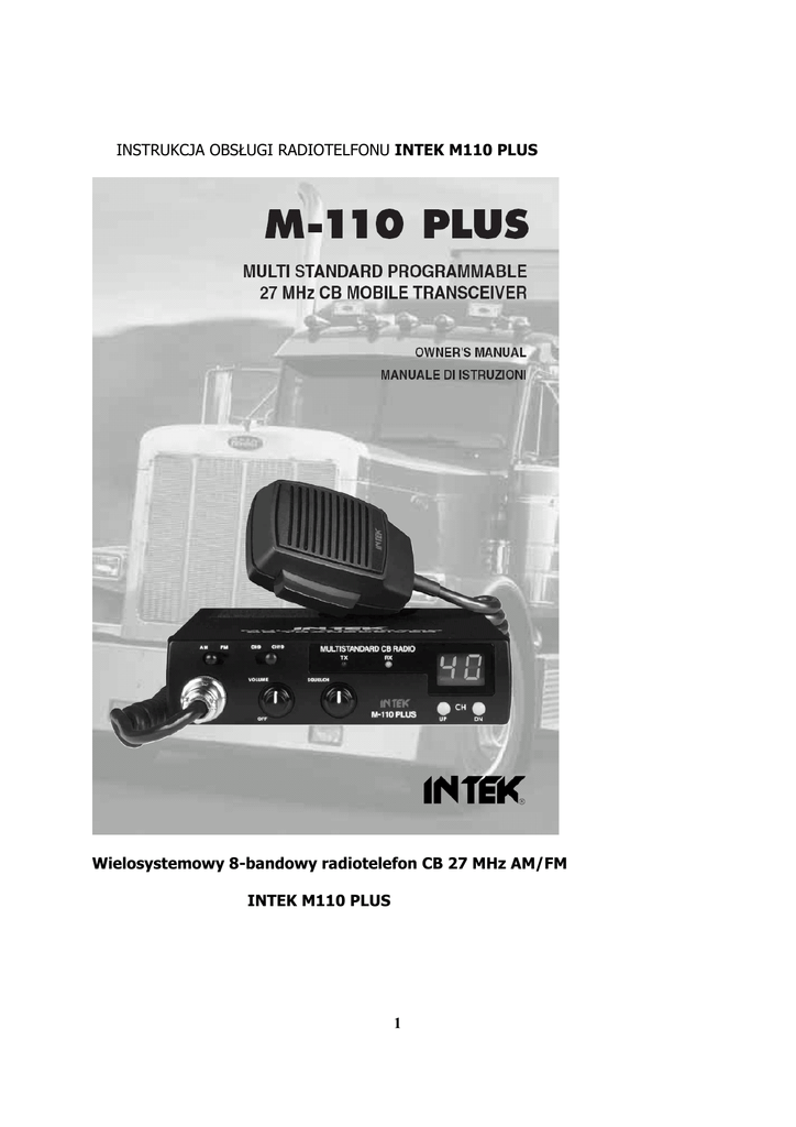 INSTRUKCJA OBSŁUGI RADIOTELFONU INTEK M110 PLUS Wielosystemowy 8-bandowy radiotelefon CB 27 MHz AM/FM INTEK M110 PLUS 1 DEKLARACJA ZGODNOŚCI (Deklaracja Zgodności Producenta - tłumaczenie) Deklarujemy, że produkt : Radiotelefon: INTEK mod. M- 110 PLUS Spełnia techniczne parametry zgodnie z Dyrektywami EC: 73/23/EEC, 89/336/EEC i 99/5/EC oraz spełnia zasadnicze wymagania norm: EN 300 135-2, EN 300 433, EN 60065, EN 301 489-1, EN 301 489-13 Rodzaj produktu: radiotelefon CB 27Mhz Jednostka notyfikowana wykonująca powyższe badania: EMCCert Dr. Rasek - numer identyfikacyjny : 0678 Germany 91320 Ebermannstadt, Boelwiese 5, +49 9194-9016 Producent: INTEK S.R.L., Via G.Marconi 16, 20090 SEGRATE Milano ITALY, tel: +39 02 26950451 / fax: +39 02 26952185 E-mail: [email protected] Kontakt: Armando Zanni, tel +39 02 26950451 Fax: +3902/26952185 E-mail: [email protected] Deklarację podpisano: Segrate (MI) dnia 06/09/2005 przez : Generalny Dyrektor: Vittorio Zanetti 0678 2 DEKLARACJA ZGODNOŚCI Uwaga ! Zaleca się uważne przeczytanie instrukcji obsługi przed przystąpieniem do korzystania z radiotelefonu. Umożliwi to używanie radiotelefonu zgodnie ze szczegółowymi normami i wymaganiami danego Państwa Unii Europejskiej. 3 Spis treści / Wstęp / Zawartość opakowania Spis treści........................................................................................................................................1 Wstęp.............................................................................................................................................1 Zawartość opakowania.....................................................................................................................1 Przyciski i gałki, ustawienie radia do pracy......................................................................................5-7 Instalacja radiotelefonu....................................................................................................................8 Tabela częstotliwości........................................................................................................................9 Wybranie zakresu częstotliwości do pracy/programowanie.................................................................10 Dane techniczne……….....................................................................................................................11 Tabela ograniczeń wykorzystania CB w krajach UE............................................................................12 Płyta (PCB) i płyta CPU…… …………………………………………………....................................................13-14 Schemat....................................................................................................................................15-16 Schemat blokowy.......................................................................................................................17-18 Adnotacje..................................................................................................................................19-20 Uwaga ! Przed użyciem radiotelefonu należy zapoznać się z polskimi normami, aby radiotelefon został właściwie zaprogramowany tzn. należy go ustawić w pozycji PL(08)–40 kanałów AM/FM z mocą 4W, lub zgodnie z normami kraju, w którym radiotelefon jest używany. Fabrycznie sprzęt jest ustawiony zgodnie z normą europejską CE (CEPT 40 kanałów 4W, FM) Gratulujemy ! Nabycia wysokiej jakości produktu firmy INTEK. Radiotelefon zawiera bardzo zaawansowane funkcje i nowe elektroniczne systemy, dlatego koniecznie zalecamy przeczytanie instrukcji przed użyciem radiotelefonu. Następnie używanie radiotelefonu nie będzie sprawiało trudności przez szereg lat. Firma INTEK jest zainteresowana dostarczaniem na rynek najwyższej jakości sprzętu radiotelekomunikacyjnego z uwzględnieniem bieżących potrzeb odbiorców i najnowszych rozwiązań elektronicznych. Obecnie radiotelefony CB INTEK są technologiczną nowością na rynku w zastosowaniu najnowszych systemów modulacji wziętych z profesjonalnych urządzeń nadawczych przeznaczonych do specjalnego użytku. Te specjalne technologie zostały obecnie przeznaczone dla każdego użytkownika CB. Ponadto wszystkie radiotelefony CB z serii PLUS M110, M790, M490 są programowane zgodnie z wymaganiami i normami danego kraju europejskiego. Fabrycznie każdy radiotelefon jest ustawiony zgodnie z normą europejską CE (CEPT 40 kanałów 4W, FM). Zawartość opakowania : Proszę sprawdzić po rozpakowaniu czy w opakowaniu znajdują się następujące elementy: - Radiotelefon Kabel zasilający (DC) z bezpiecznikiem, Mikrofon pojemnościowy, Uchwyt montażowy do samochodu Akcesoria montażowe do uchwytu, Uchwyt mikrofonowy, Instrukcja Obsługi 4 Przyciski i gałki, ustawienie radia do pracy Panel przedni 1. Przełącznik AM/FM. Ten przycisk pozwala na wprowadzenie do pracy modulacji AM lub FM. Wprowadzanie AM lub FM jest możliwe dla Tx i Rx wyłącznie wtedy, gdy jest dopuszczalne w ramach zaprogramowanego pasma. Dodatkowo służy do ustawienia Bandu UK lub CE. Jeśli wprowadzimy ustawienia kodu dla UK to przełącznik musi być w położeniu AM gdy dla CE to FM. 2. Kanał 9 lub Kanał ratunkowy 19 Jest to przełącznik używany również do szybkiego wprowadzania kanału ratunkowego 19 lub 9. W pozycji środkowej działają kanały ustawione na wyświetlaczu. 3. Wskaźnik TX. Ta lampka świeci się na czerwono gdy radio nadaje. 4. Wskaźnik RX. Ta lampka świeci się na zielono gdy radio odbiera sygnały. 5. Wyświetlacz LED. Dużego rozmiaru dwie cyfry pokazują numer kanału lub kod zakresu częstotliwości ustawianej do pracy w danym kraju. 6. Przycisk DN. Ten przycisk pozwala na przełączenie kanału pracy w dół. Poprzez dłuższe przytrzymanie jest możliwe szybkie „przewijanie” kanałów pracy w dół. 7. Przycisk UP. Ten przycisk pozwala na przełączenie kanał