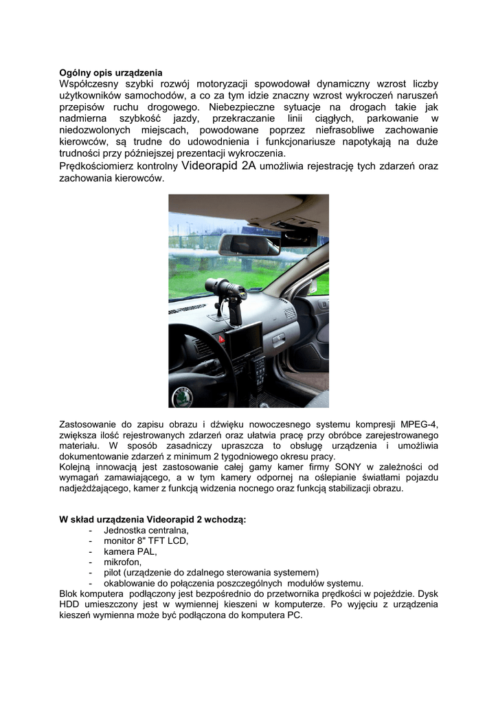 Ogólny opis urządzenia Współczesny szybki rozwój motoryzacji spowodował dynamiczny wzrost liczby użytkowników samochodów, a co za tym idzie znaczny wzrost wykroczeń naruszeń przepisów ruchu drogowego. Niebezpieczne sytuacje na drogach takie jak nadmierna szybkość jazdy, przekraczanie linii ciągłych, parkowanie w niedozwolonych miejscach, powodowane poprzez niefrasobliwe zachowanie kierowców, są trudne do udowodnienia i funkcjonariusze napotykają na duże trudności przy późniejszej prezentacji wykroczenia. Prędkościomierz kontrolny Videorapid 2A umożliwia rejestrację tych zdarzeń oraz zachowania kierowców. Zastosowanie do zapisu obrazu i dźwięku nowoczesnego systemu kompresji MPEG-4, zwiększa ilość rejestrowanych zdarzeń oraz ułatwia pracę przy obróbce zarejestrowanego materiału. W sposób zasadniczy upraszcza to obsługę urządzenia i umożliwia dokumentowanie zdarzeń z minimum 2 tygodniowego okresu pracy. Kolejną innowacją jest zastosowanie całej gamy kamer firmy SONY w zależności od wymagań zamawiającego, a w tym kamery odpornej na oślepianie światłami pojazdu nadjeżdżającego, kamer z funkcją widzenia nocnego oraz funkcją stabilizacji obrazu. W skład urządzenia Videorapid 2 wchodzą: - Jednostka centralna, - monitor 8" TFT LCD, - kamera PAL, - mikrofon, - pilot (urządzenie do zdalnego sterowania systemem) - okablowanie do połączenia poszczególnych modułów systemu. Blok komputera podłączony jest bezpośrednio do przetwornika prędkości w pojeździe. Dysk HDD umieszczony jest w wymiennej kieszeni w komputerze. Po wyjęciu z urządzenia kieszeń wymienna może być podłączona do komputera PC. Dodatkowo, jest możliwość podłączenia radarowego przyrządu do pomiaru prędkości ISKRA-1. Przyrząd ten, podłącza się do gniazda oznaczonego RADAR, z tyłu odbudowy urządzenia Videorapid 2A. Najważniejsze parametry funkcjonalne: - jednoczesne odtwarzanie i nagrywanie - podgląd nagrywanego obrazu, - rejestracja obrazu i komentarza słownego, - odtwarzanie nagranego obrazu (normalna prędkość, podgląd przyspieszony i klatka po klatce), - sterowanie parametrami kamery przez operatora (zoom, ostrość). Zarejestrowany obraz z kamery jest uzupełniany o następujące informacje: - datę, - czas, - dane identyfikacyjne (identyfikator urządzenia), - numer ramki rejestrowanego obrazu, - czas trwania rejestracji pomiaru, - średnią prędkość na odcinku pomiarowym, - długość odcinka drogi pomiarowej, - chwilową prędkość własną pojazdu, - ilość impulsów z przetwornika prędkości pojazdu na sekundę. Powyższe informacje są wyświetlane na ekranie i tym samym można śledzić na bieżąco przebieg wydarzeń, oraz jednocześnie w tym samym czasie rejestrować obraz na dysku twardym rejestratora. Parametry techniczne Zasilanie 12 ÷ 13 V DC (±10%) Zakres mierzonych prędkości 1 250 km/h Sposób sterowania impulsy z przetwornika prędkości pojazdu Działka elementarna 0,1 km/h Błąd graniczny 3% wartości mierzonej, lecz nie mniej niż 3 km/h Pobór prądu max 4 A Pojemność dysku min. 80 GB System video PAL Monitor LCD 8” Rozdzielczość monitora 800 x 480 Jasność monitora 350 Cd/m2 Przetwornik CCD w kamerze ¼” Migawka 1/50 1/120000 s Przysłona 1,6 ÷ 28 Zoom optyczny min. X 10 Zakres temperatur pracy -10 +50oC Zakres temperatur przechowywania -30 +70oC Masa 8 kg Czas gotowości do pracy max 30 s Zakres stałej prędkościomierza 1 – 99999 imp/min.