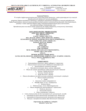 OKUCIA DO STOLARKI Z ALUMINIUM, PCV I DREWNA, AUTOMATYKA DO DRZWI I BRAM 31-586 KRAKÓW, ul. Centralna 51 tel/fax: 12 294 88 07 tel.kom: 695 174 256 e-mail: [email protected] www.wid-art.pl Szanowni Państwo. W związku ciągłym poszerzaniem przez naszą firmę grona dostawców, a także pojawiającymi się u naszych dotychczasowych dostawców nowymi produktami, pragniemy Państwu przedstawić informację o aktualnym asortymencie dostępnym za naszym pośrednictwem. Będąc bezpośrednimi, autoryzowanymi przedstawicielami poniżej wymienionych producentów okuć budowlanych, jesteśmy w stanie zapewnić Państwu pełny asortyment proponowanych przez nich towarów, oraz należytą obsługę i konkurencyjne ceny. Sprzedawane przez nas okucia można zastosować do stolarki aluminiowej, tworzywowej i drewnianej oraz do konstrukcji calszklanych. LISTA DOSTAWCÓW / PRODUCENTÓW AGB, ASSA ABLOY, APRIMATIC, BKS, BROOKVENT, CASAL, CASMA, CISA, CVL, DEA, DIALOC, DITEC, DOM, DOMATIC, DORMA, ECO-SCHULTE, EFFEFF, ELEKTRA PLUS, ESCO, EUROPORTAL, FAM, FAPIM, FKS, GEZE, GIESSE, GU, HAFELE, HAUTAU, HOPPE, IBFM, ISEO, JANIA, JIS, KFV, KOBLENZ LOB, LOCKPOL, MCM, MEDOS, METALPLAST-CZĘSTOCHOWA, NEMEF, NICE, NOVASTIL OTLAV, REMOR, RENSON, ROMB, ROTO, SAVIO, SECUR, SIEGENIA, SIMONSWERK, SOBINCO, STAC, STARTEC, SUKCES, WALA, WILKA, WINKHAUS, WSS I INNI ASORTYMENT: Samozamykacze drzwiowe górne, podłogowe i wpuszczane Okucia do drzwi przesuwnych, składanych, harmonijkowych • Nawierzchniowe otwieracze naświetli • Siłowniki do otwierania okien, systemy oddymiania • Okucia do ścianek całoszklanych, kabin prysznicowych i balustrad • Zawiasy i klamki drzwiowe • Zawiasy i klamki okienne • Rygle drzwiowe i okienne • Okucia obwiedniowe do okien rozwierno-uchylnych, rozwiernych i uchylnych • Okucia uchylno-przesuwne • Zamki • Zasuwnice (zamki wielopunktowe) • Wkładki (klasy A, B, C i bezklasowe) • Systemy klucza • Elektrozaczepy, zwory elektromagnetyczne • Okucia antypaniczne (nawierzchniowe i wpuszczane) • Pochwyty drzwiowe • Nawiewniki okienne • Kraty wentylacyjne i osłonowe • Listwy dymoszczelne do drzwi przymykowych i przesuwnych, szczotki • Automatyka do drzwi przesuwnych, przymykowych, obrotowych • Automatyka do bram przesuwnych, przymykowych, garażowych • Maszyny i narzędzia do montażu okuć drzwiowych i okiennych • • Zapraszamy do współpracy i zakupów. KRAKÓW, styczeń 2012