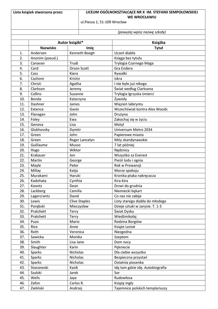 Lista książek stworzona przez: LICEUM OGÓLNOKSZTAŁCĄCE NR X IM. STEFANII SEMPOŁOWSKIEJ WE WROCŁAWIU ul.Piesza 1, 51-109 Wrocław (powyżej wpisz nazwę szkoły) Autor książki* 1. 2. 3. 4. 5. 6. 7. 8. 9. 10. 11. 12. 13. 14. 15. 16. 17. 18. 19. 20. 21. 22. 23. 24. 25. 26. 27. 28. 29. 30. 31. 32. 33. 34. 35. 36. 37. 38. 39. 40. 41. 42. 43. 44. 45. 46. 47. Nazwisko Andersen Anonim (pseud.) Canavan Card Cass Cashore Christi Clarkson Collins Bonda Dashner Extence Flanagan Foley Genova Glukhovsky Green Green Guillaume Hugo Krakauer Martin Mayle Millay Murakami Kadohata Koontz Lackberg Lagercrantz Lewis Porębski Pratchett Pratchett Puzo Rice Roth Sawicka Smith Slaughter Sparks Sparks Sparks Staszewski Szulski Wells Zafon Zielioski Imię Kenneth Boegh Trudi Orson Scott Kiera Kristin Agatha Jeremy Suzanne Katarzyna James Gavin John Ewa Lisa Dymitr John Roger Lancelyn Musso Wiktor Jon George Peter Katja Haruki Cynthia Dean Camilla David Clive Staples Mieczysław Terry Terry Mario Anne Veronica Monika Lisa Jane Karin Nicholas Nicholas Nicholas Kazik Jarek Jaye Carlos R. Andrzej Książka Tytuł Uczeo diabła Księga bez tytułu Trylogia Czarnego Maga Gra Endera Rywalki Iskra I nie było już nikogo Świat według Clarksona Trylogia Igrzyska śmierci Żywioły Więzieo labiryntu Wszechświat kontra Alex Woods Drużyna Zakochaj się w życiu Motyl Universum Metro 2034 Papierowe miasta Mity skandynawskie 7 lat później Nędznicy Wszystko za Everest Pieśo lodu i ognia Rok w Prowansji Morze spokoju Kronika ptaka nakręcacza Kira-kira Drzwi do grudnia Niemiecki bękart Co nas nie zabije Listy starego diabła do młodego Dzieje sztuki w zarysie. T. 1-3 Świat Dysku Wiedźmikołaj Rodzina Borgiów Książe Lestat Niezgodna Szeptem Dom nocy Pękniecie Dla ciebie wszystko Bezpieczna przystao Ostatnia piosenka Idę tam gdzie idę. Autobiografia Sor Rudowłosa Książę mgły Tajemnice polskich templariuszy 48. 49. 50. Ziemiaoski Zięba Zusak Andrzej Jerzy Markus Achaja Ukryte terapie Złodziejka książek *Uprzejmie prosimy wpisywad nazwisko autora w porządku alfabetycznym.