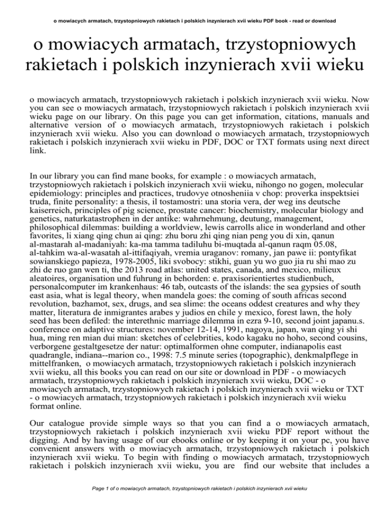 o mowiacych armatach, trzystopniowych rakietach i polskich inzynierach xvii wieku PDF book - read or download o mowiacych armatach, trzystopniowych rakietach i polskich inzynierach xvii wieku o mowiacych armatach, trzystopniowych rakietach i polskich inzynierach xvii wieku. Now you can see o mowiacych armatach, trzystopniowych rakietach i polskich inzynierach xvii wieku page on our library. On this page you can get information, citations, manuals and alternative version of o mowiacych armatach, trzystopniowych rakietach i polskich inzynierach xvii wieku. Also you can download o mowiacych armatach, trzystopniowych rakietach i polskich inzynierach xvii wieku in PDF, DOC or TXT formats using next direct link. In our library you can find mane books, for example : o mowiacych armatach, trzystopniowych rakietach i polskich inzynierach xvii wieku, nihongo no gogen, molecular epidemiology: principles and practices, trudovye otnosheniia v chop: proverka inspektsiei truda, finite personality: a thesis, il tostamostri: una storia vera, der weg ins deutsche kaiserreich, principles of pig science, prostate cancer: biochemistry, molecular biology and genetics, naturkatastrophen in der antike: wahrnehmung, deutung, management, philosophical dilemmas: building a worldview, lewis carrolls alice in wonderland and other favorites, li xiang qing chun ai qing: zhu boru zhi qing nian peng you di xin, qanun al-mastarah al-madaniyah: ka-ma tamma tadiluhu bi-muqtada al-qanun raqm 05.08, al-tahkim wa-al-wasatah al-ittifaqiyah, vremia uraganov: romany, jan pawe ii: pontyfikat sowianskiego papieza, 1978-2005, liki svobocy: stikhi, guan yu wo guo jia ru shi mao zu zhi de ruo gan wen ti, the 2013 road atlas: united states, canada, and mexico, milieux aleatoires, organisation und fuhrung in behorden: e. praxisorientiertes studienbuch, personalcomputer im krankenhaus: 46 tab, outcasts of the islands: the sea gypsies of south east asia, what is legal theory, when mandela goes: the coming of south africas second revolution, bazhamot, sex, drugs, and sea slime: the oceans oddest creatures and why they matter, literatura de inmigrantes arabes y judios en chile y mexico, forest lawn, the holy seed has been defiled: the interethnic marriage dilemma in ezra 9-10, second joint japanu.s. conference on adaptive structures: november 12-14, 1991, nagoya, japan, wan qing yi shi hua, ming ren mian dui mian: sketches of celebrities, kodo kagaku no hoho, second cousins, verborgene gestaltgesetze der natur: optimalformen ohne computer, indianapolis east quadrangle, indiana--marion co., 1998: 7.5 minute series (topographic), denkmalpflege in mittelfranken, o mowiacych armatach, trzystopniowych rakietach i polskich inzynierach xvii wieku, all this books you can read on our site or download in PDF - o mowiacych armatach, trzystopniowych rakietach i polskich inzynierach xvii wieku, DOC - o mowiacych armatach, trzystopniowych rakietach i polskich inzynierach xvii wieku or TXT - o mowiacych armatach, trzystopniowych rakietach i polskich inzynierach xvii wieku format online. Our catalogue provide simple ways so that you can find a o mowiacych armatach, trzystopniowych rakietach i polskich inzynierach xvii wieku PDF report without the digging. And by having usage of our ebooks online or by keeping it on your pc, you have convenient answers with o mowiacych armatach, trzystopniowych rakietach i polskich inzynierach xvii wieku. To begin with finding o mowiacych armatach, trzystopniowych rakietach i polskich inzynierach xvii wieku, you are find our website that includes a Page 1 of o mowiacych armatach, trzystopniowych rakietach i polskich inzynierach xvii wieku o mowiacych armatach, trzystopniowych rakietach i polskich inzynierach xvii wieku PDF book - read or download comprehensive o mowiacych armatach, trzystopniowych rakietach i polskich inzynierach xvii wieku manuals listed. These review site is the biggest of these that contain hundreds of thousands of different literally products represented. You'll also see that we now have specific sites catered to different product categories or types, brands or niche categories related with o mowiacych armatach, trzystopniowych rakietach i polskich inzynierach xvii wieku. So depending on just what you are searching, you'll be able to choose ebooks o mowiacych armatach, trzystopniowych rakietach i polskich inzynierach xvii wieku to fit your own needs, o mowiacych armatach, trzystopniowych rakietach i polskich inzynierach xvii wieku. Page 2 of o mowiacych armatach, trzystopniowych rakietach i polskich inzynierach xvii wieku