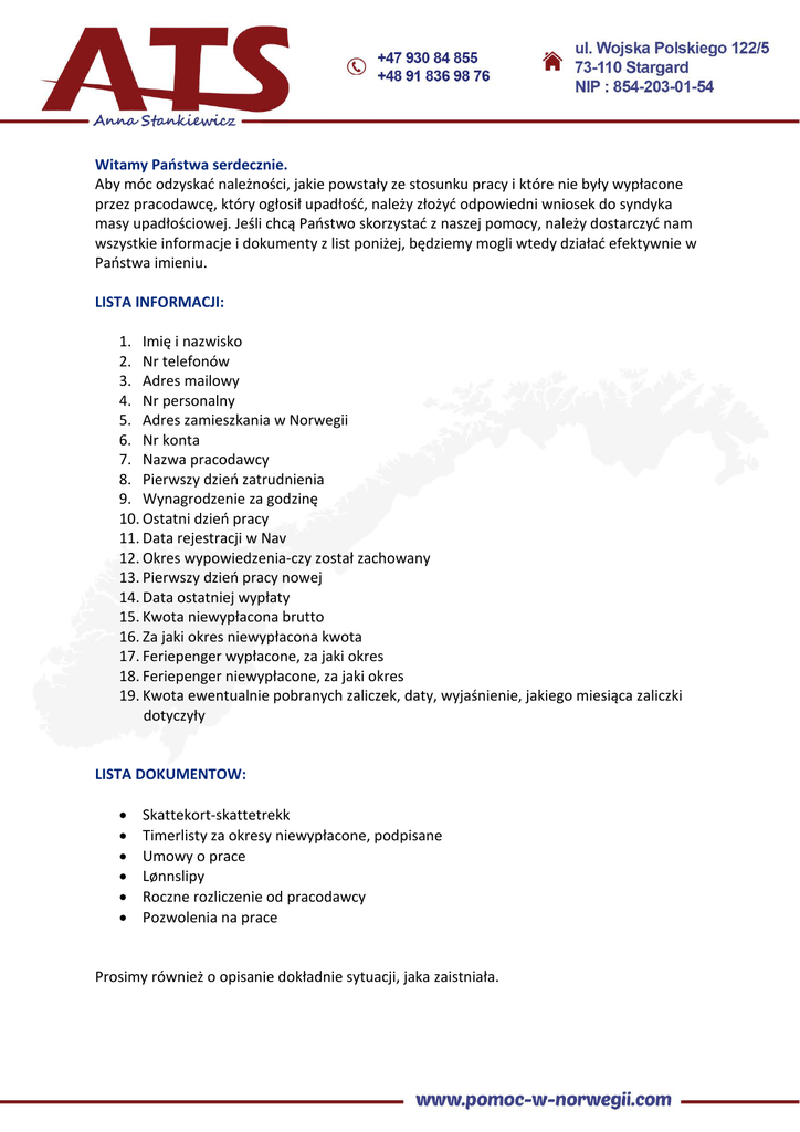 Witamy Państwa serdecznie. Aby móc odzyskać należności, jakie powstały ze stosunku pracy i które nie były wypłacone przez pracodawcę, który ogłosił upadłość, należy złożyć odpowiedni wniosek do syndyka masy upadłościowej. Jeśli chcą Państwo skorzystać z naszej pomocy, należy dostarczyć nam wszystkie informacje i dokumenty z list poniżej, będziemy mogli wtedy działać efektywnie w Państwa imieniu. LISTA INFORMACJI: 1. Imię i nazwisko 2. Nr telefonów 3. Adres mailowy 4. Nr personalny 5. Adres zamieszkania w Norwegii 6. Nr konta 7. Nazwa pracodawcy 8. Pierwszy dzień zatrudnienia 9. Wynagrodzenie za godzinę 10. Ostatni dzień pracy 11. Data rejestracji w Nav 12. Okres wypowiedzenia-czy został zachowany 13. Pierwszy dzień pracy nowej 14. Data ostatniej wypłaty 15. Kwota niewypłacona brutto 16. Za jaki okres niewypłacona kwota 17. Feriepenger wypłacone, za jaki okres 18. Feriepenger niewypłacone, za jaki okres 19. Kwota ewentualnie pobranych zaliczek, daty, wyjaśnienie, jakiego miesiąca zaliczki dotyczyły LISTA DOKUMENTOW: • • • • • • Skattekort-skattetrekk Timerlisty za okresy niewypłacone, podpisane Umowy o prace Lønnslipy Roczne rozliczenie od pracodawcy Pozwolenia na prace Prosimy również o opisanie dokładnie sytuacji, jaka zaistniała. Firma zbankrutowała. Co teraz? Kiedy pracodawca nie wypłaca należnych pieniędzy, warto jak najwcześniej rozpocząć formalne procedury ich odzyskiwania. W Norwegii bankructwo firmy nie jest dla pracowników informacją przerażającą. Najczęściej oznacza, że wkrótce na konto wpłyną zaległe pensje i inne zobowiązania. Firma, w której pracowałeś, ogłosiła upadłość. Czy to znaczy, że należy się pożegnać z wypłatą zaległych należności? Nie. Trzeba tylko rozpocząć odpowiednią procedurę i przestrzegać ustalonych przez prawo terminów, aby otrzymać należne pieniądze. Fundusz Gwarancji Płac Fundusz pokrywa zaległe roszczenia płacowe w przypadku, gdy pracodawca zbankrutuje lub gdy jego firma zostanie przymusowo zlikwidowana. Można z niego otrzymać pokrycie roszczeń finansowych do końca ustanowionego wcześniej z pracodawcą okresu wypowiedzenia. Jeśli pracodawca odprowadzał składki na ubezpieczenie społeczne od twojego wynagrodzenia, jesteś uprawniony do skorzystania z pomocy Funduszu. Nie mogą się do niego zgłaszać natomiast samodzielni przedsiębiorcy, osoby wykonujące pracę na zasadzie umowy zlecenia oraz posiadacze, co najmniej 20% pakietu akcji danego przedsiębiorstwa. Żeby skorzystać z pomocy Funduszu, należy w ciągu dwóch tygodni od otrzymania zawiadomienia od syndyka, iż nie przejmuje on zobowiązań finansowych wynikających z umów o pracę, (czyli po prostu nie będzie wypłacał pracownikom pensji, urlopowego itp.) zarejestrować się, jako osoba poszukująca pracy w najbliższym oddziale NAV. W NAV trzeba być zarejestrowanym przez cały okres, którego będzie dotyczył wniosek. Nie ma znaczenia, czy w tym czasie pobieramy zasiłek dla bezrobotnych, czy też nie. Jeśli roszczenia finansowe zostaną uznane za zasadne, można otrzymać z Funduszu: - Pensję i inne wynagrodzenia za pracę maksymalnie za okres 6 miesięcy. Można się ubiegać o pokrycie należności finansowych, jakie pracodawca zaciągnął wobec nas przed ogłoszeniem upadłości. Od Funduszu można ubiegać się o wypłatę roszczeń nie sprzed maksymalnie 4 miesięcy przed datą wpłynięcia do sądu wniosku o rozpoczęcie postępowania upadłościowego. - Wynagrodzenie urlopowe za maksymalnie 30 miesięcy. Nie może być ono jednak zarobione wcześniej niż na 24 miesiące przed wpłynięciem do sądu wniosku o rozpoczęcie postępowania upadłościowego. - Świadczenia emerytalne maksymalnie za 6 miesięcy. - Odszkodowania za utracone wynagrodzenie maksymalnie za okres 6 miesięcy. - Odsetki od zaległych roszczeń finansowych. Jeśli w czasie, w którym wnioskujesz o pokrycie należnych roszczeń, miałeś dochody w postaci pensji od nowego pracodawcy bądź pobierasz zasiłek dla bezrobotnych, Fundusz potrąci je z przyznanych pieniędzy. Lepiej za wcześnie niż za późno Jeśli twój pracodawca nie wywiązuje się ze zobowiązań finansowych wobec ciebie, najlepiej od razu rozpoczynać formalne procedury. Nie ma, na co czekać w nadziei, że „za miesiąc na pewno się poprawi”. Praktyka pokazuje, iż najczęściej „nie poprawia się”, a my, skoro nie próbowaliśmy od razu dochodzić swoich praw, nie będziemy w pełni wiarygodni wobec urzędów, do których zwrócimy się o pomoc. NAV nie wypłaca przeterminowanych należności, jeśli w odpowiednim czasie nie rozpocząłeś odpowiednich procedur lub nie masz na nie żadnego potwierdzenia na piśmie. Warto zachowywać kopię korespondencji z pracodawcą (w tym kontekście wysłanie e-maila lub listu pocztą jest o wiele korzystniejsze niż rozmowa telefoniczna czy sms). Nawet, jeśli twoje pisma do pracodawcy nie przynosiły oczekiwanego skutku, w odpowiednim momencie dla NAV-u będą to dokumenty dostarczające cennych informacji. Twoje uzasadnione i nieprzeterminowane roszczenia finansowe wobec pracodawcy mogą skutkować wszczęciem postępowania upadłościowego i w konsekwencji bankructwem firmy. Choć brzmi to bardzo radykalnie, w Norwegii jest to powszechnie stosowane rozwiązanie prawne w takich przypadkach. Kiedy pracodawca nie może wypłacać regularnie pensji, to głos pracowników może spowodować rozpoczęcie procedury upadłościowej i przejęcie zobowiązań finansowych wobec zatrudnionych przez Fundusz Gwarancji Płac. Przeterminowanych należności można jeszcze dociekać przez forliksrådet, czyli na drodze pojednawczego postępowania w sądzie zajmującym się sprawami cywilnymi. Składanie wniosku O świadczenia z Funduszu można zacząć się starać wypełniając wniosek „Zgłoszenie roszczeń płacowych do masy upadłościowej”. Należy go przesłać do syndyka m
