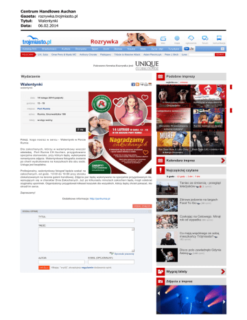 Centrum Handlowe Auchan Gazeta: rozrywka.trojmiasto.pl Tytu³: Walentynki Data: 06.02.2014 kino Katalog firm POLECAMY Wiadomości U.K. Subs Kultura Rozrywka Omar Perry & Mystic MC Sport Anthony Chorale Dom Pablopavo Biznes Nauka Tribute to Massive Attack Moto Życie i styl Adam Pierończyk Wydarzenie mapa ogłoszenia forum komunikacja Turystyka Peter J. Birch SZUKAJ Łona Podobne imprezy najbliżs z e Walentynki minione clubbing, dys walentynki data: 14 lutego 2014 (piątek) IV Mistrzostwa Polski Chippendales godzina: 13 - 19 Walentynki w stylu disco lat 70. miejsce: Port Rumia walentynki adres: Rumia, Grunwaldzka 108 bilety: w s tęp wolny idę Warsztaty: W poszukiwaniu kobiecej rozkoszy! Turniej bowlingowy dla par Ras Sean Mure & Larry Okey & Ikenga Drummers... Black Dogs (UK) +Jolokia + tba Pokaż, kogo nosisz w sercu - Walentynki w Porcie Rumia Dla zakochanych, którzy w walentynkowy wieczór odwiedzą Port Rumia CH Auchan, przygotowano specjalne stanowisko, przy którym będą wykonywane romantyczne zdjęcia. Walentynkowa fotografia zostanie po chwili wydrukowana na koszulkach dla obu osób. U sługa jest bezpłatna. Kalendarz imprez Profesjonalny, walentynkowy fotograf będzie czekał na zakochanych, od godz. 13:00 do 19:00 przy stoisku zlokalizowanym na terenie galerii handlowej. Zdjęcia par będą wykonywane na specjalnie przygotowanym tle, wpisującym się w charakter Dnia Zakochanych. Już po kilkunastu minutach zakochani będą mogli odebrać oryginalny upominek. Organizatorzy przygotowali kilkaset koszulek dla wszystkich, którzy będą chcieli pokazać, kto skradł im serce. Najczęściej czytane 3 godz | 12 godz | 3 dni | 7 dni Taniec ze śmiercią - przegląd teledysków (1 opinia) Zapraszamy! Dodatkowe informacje: http://portrumia.pl Zdrowe jedzenie na targach Food To Go (20 opinii) DODAJ ZDJĘCIE DODAJ OPINIĘ Czekając na Cetowego. Minął rok od wypadku (64 opinie) TYTUŁ: TREŚĆ: 5 5 Co mają wspólnego ze sobą mieszkańcy Trójmiasta? (42 opinie) 6 6 Sprawdź pisownię AUTOR: WYŚLIJ Disco polo zawładnęło Gdynia Areną (140 opinii) E-MAIL (OPCJONALNY): Klikając "wyślij", akceptujesz regulamin dodawania opinii. Wygraj bilety Zdjęcia z imprez Centrum Handlowe Auchan Gazeta: rozrywka.trojmiasto.pl Tytu³: Walentynki Data: 06.02.2014 Ulver + dodaj zdjęcie zobacz wszystkie > 1 2 3 Benefis Przemysława Guldy promo + dodaj film O portalu Logo Reklama Polityka prywatności Kontakt Praca w portalu Mapa serwisu Trojmiasto.pl na komórkę (c) Copyright 1998-2014 Gdańsk, Gdynia, Sopot - Portal Regionalny trojmiasto.pl zobacz wszystkie Logowanie