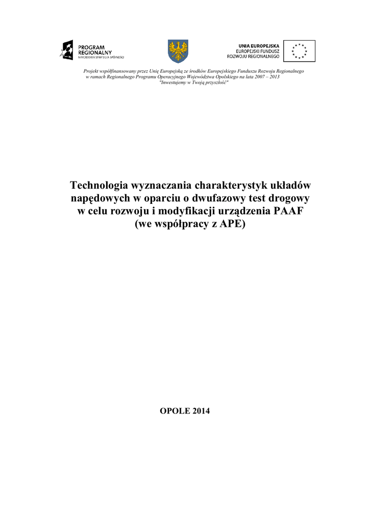 Projekt współfinansowany przez Unię Europejską ze środków Europejskiego Funduszu Rozwoju Regionalnego w ramach Regionalnego Programu Operacyjnego Województwa Opolskiego na lata 2007 – 2013 "Inwestujemy w Twoją przyszłość" Technologia wyznaczania charakterystyk układów napędowych w oparciu o dwufazowy test drogowy w celu rozwoju i modyfikacji urządzenia PAAF (we współpracy z APE) OPOLE 2014 1. Wprowadzenie Określenie chwilowych wartości parametrów trakcyjnych układu napędowego, w tym przyspieszenia wzdłuŜnego, siły i mocy w układzie napędowym, w rzeczywistych warunkach ruchu wymaga przeprowadzenia stosownej próby drogowej, opisanej w monografii dołączonej do raportu [11]. Zachowanie odpowiedniej dynamiki ruchu samochodu na drodze, wymaga od układu napędowego rozwijanie odpowiednio wysokiej: - zdolności przyspieszania, - maksymalnej prędkości jazdy, - zdolności pokonywania wzniesień. Wymienione powyŜej własności trakcyjne samochodu wyraŜa się najczęściej ich najwyŜszymi wartościami i określa się je na podstawie badań drogowych. Przy czym pierwsze dwie wyznacza się na drodze poziomej przy braku wiatru oraz przy ustawieniu urządzeń sterujących mocą układu napędowego na pełną moc. W kaŜdych warunkach droga powinna mieć nawierzchnię jezdni równą i suchą, zapewniającą wysoką przyczepność kół przy jednocześnie małej wartość współczynnika oporu toczenia. Wobec tego, bezpośrednio o własnościach trakcyjnych decyduje dobór parametrów układu napędowego, a więc zaleŜą one od parametrów silnika spalinowego, uŜytego w roli jednostki napędowej i doboru parametrów układu przeniesienia napędu (przełoŜenia). Samochód osobowy jest złoŜonym obiektem dynamicznym, którego własności trakcyjne zaleŜą równieŜ od działania innych sił zewnętrznych powiązanych z kierowcą oraz otoczeniem, które wspólnie z układem napędowym samochodu tworzą tzw. system K-S-O (Kierowca-Samochód-Otoczenie) [3]. Schemat blokowy takiego sytemu przedstawia rys. 1.1. Kierowa Pedał przyspieszenia αp Sterownik silnika αz λ tw Tc n Silnik ZI Mo V Parametry pojazdu Układ napędowy Pojazd up Przepustnica UPN Fn Koła napędzane (siła napędowa) F op Otoczenie Rys. 1.1. Oddziaływanie w systemie kierowca (K) – samochodów (S) – otoczenie (O) Bezpośrednie oddziaływanie otoczenia na poruszający samochód w postaci sił zakłócających oraz oporów (toczenia, powietrza, wzniesienia i bezwładności) narzuca kierowcy konieczność dokonania wyboru punktu pracy jednostki napędowej oraz przełoŜenia układu przeniesienia napędu, w 2 szczególności sprzęgła głównego oraz przekładni o zmiennym przełoŜeniu. Z kolei ruch samochodu wywołuje u kierowcy odczucie obciąŜenia, spowodowanego zmienną prędkością ruchu a tym samym zmiennym przyspieszaniem, które powiązane z masą wywołuje siłę bezwładności. NajwaŜniejsze powiązania (przepływ sygnałów) w systemie przedstawiają strzałki, które pokazują wzajemne relacje pomiędzy elementami systemu, od których zaleŜą podstawowe własności trakcyjne układu napędowego samochodu. W nowoczesnych samochodach osobowych cały układ napędowy podlega nieustannej ewolucji, przejawiającej się lepszymi wskaźnikami jego pracy, które wynikają z konstrukcyjnego doskonalenia znanych rozwiązań. W tym kontekście coraz większa liczba samochodów jest wyposaŜona w drugą jednostkę napędową, którą stanowi np. silnik elektryczny w pojazdach hybrydowych. Tak rozbudowane jednostki napędowej, powiązane ze sobą w sposób funkcjonalny, umoŜliwiają znaczącą poprawę niektórych wskaźników jego pracy. Równolegle udoskonalane są układy przeniesienia napędu, których zadanie sprowadza się juŜ nie tylko do jak najlepszego przetwarzania charakterystyki silnika ze względu na właściwości trakcyjne samochodu, ale równieŜ ze względu na wskaźniki emisji substancji szkodliwych w spalinach, zuŜycia paliwa czy komfortu i bezpieczeństwa jazdy [7, 8, 13]. Rozpoznanie własności trakcyjnych samochodu wymaga uwzględnienia specyfiki działania poszczególnych elementów systemu tj. otoczenia, jednostki napędowej oraz układu przeniesienia napędu. Stąd poniŜej szczegółowo rozpatrzono te elementu. 2. Platforma pomiarowa PAAF II Przedmiotem analizy w wykonanym projekcie są parametry trakcyjne i diagnostyczne pojazdu drogowego wyznaczone za pomiaru przyspieszenia wzdłuŜnego pojazdu w rzeczywistych warunkach drogowych. Z tego względu w ramach projektu podjęto prace zmierzające do budowy takiego urządzenia. Jednak realizacja tego zadania wymagała dokładnej analizy parametrów układu napędowego w rzeczywistych warunkach ruchu pojazdów o róŜnej konstrukcji, w szczególności dotyczy to: zastosowanej jednostki napędowej, konstrukcji układu przeniesienia napędu, masy pojazdu jak równieŜ przeznaczenia tzn. z jakiej klasy pojazdów on pochodził. Pojazdy te skrótowo przedstawiono w rozdziale 3. Stąd na potrzeby projektu wykonano autorski system pomiarowy przeznaczony do pomiaru chwilowych parametrów układu napędowego pochodzących z róŜnych źródeł. Wykorzystane narzędzia badawcze wchodzące w skład platformy pomiarowej PAAFII przedstawiono równieŜ w rozdziale 3. UmoŜliwia ona rejestrację parametrów kinematycznych układu napędowego pojazdu w dziedzinie czasu, z następujących systemów: z pokładowego systemu diagnostycznego OBDII: • prędkość obrotową silnika, obr/min; • uchylenie przepustnicy, %; • podciśnienie w kolektorze dolotowym, kPa; • prędkość liniową, km/h; • z karty pomiarowej NI 6212 • prędkość [km/h] oraz drogę [m] z głowicy optycznej Corrsys Datron L350, • uchylenie przepustnicy, %, • pedał przyspieszenia, %. z układu pomiaru przyspieszenia z wielofunkcyjnego czujnika 3DM-GX3-25: • kierunki magnetyczne osi X, Y, Z; • przyspieszenie osi X, Y, Z, m·s-2; • kąt obrotu osi p