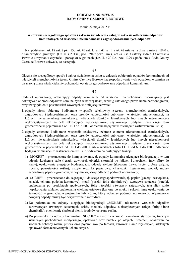 UCHWAŁA NR 74/VI/15 RADY GMINY CZERNICE BOROWE z dnia 22 maja 2015 r. w sprawie szczegółowego sposobu i zakresu świadczenia usług w zakresie odbierania odpadów komunalnych od właścicieli nieruchomości i zagospodarowania tych odpadów. Na podstawie art. 18 ust. 2 pkt 15, art. 40 ust. 1, art. 41 ust.1 i art. 42 ustawy z dnia 8 marca 1990 r. o samorządzie gminnym (Dz. U. z 2013r., poz. 594 z późn. zm.), art. 6r ust. 3 ustawy z dnia 13 września 1996r. o utrzymaniu czystości i porządku w gminach (Dz. U. z 2013r., poz. 1399 z późn. zm.), Rada Gminy Czernice Borowe uchwala, co następuje: § 1. Określa się szczegółowy sposób i zakres świadczenia usług w zakresie odbierania odpadów komunalnych od właścicieli nieruchomości z terenu Gminy Czernice Borowe i zagospodarowania tych odpadów, w zamian za uiszczoną przez właściciela nieruchomości opłatę za gospodarowanie odpadami komunalnymi. § 2. Podmiot uprawniony, odbierający odpady komunalne od właścicieli nieruchomości zobowiązany jest dokonywać odbioru odpadów komunalnych w każdej ilości, według ustalonego przez siebie harmonogramu, przy uwzględnieniu postanowień zawartych w niniejszej uchwale: 1. odpady nie są zbierane i odbierane w sposób selektywny z terenu nieruchomości zamieszkałych, zagrodowych i jednorodzinnych oraz terenów użyteczności publicznej, właścicieli nieruchomości, na których nie zamieszkują mieszkańcy, właścicieli domków letniskowych lub innych nieruchomości wykorzystywanych na cele rekreacyjno- wypoczynkowe, użytkowanych jedynie przez część roku gromadzone w pojemnikach od 110 l do 7000 l, odbierane będą raz w miesiącu z zastrzeżeniem ust. 3; 2. odpady zbierane i odbierane w sposób selektywny zebrane z terenu nieruchomości zamieszkałych, zagrodowych i jednorodzinnych oraz terenów użyteczności publicznej, właścicieli nieruchomości, na których nie zamieszkują mieszkańcy, właścicieli domków letniskowych lub innych nieruchomości wykorzystywanych na cele rekreacyjno- wypoczynkowe, użytkowanych jedynie przez część roku gromadzone w pojemnikach od 110 l do 7000 l lub w workach z folii LDPE od 60 l do 120 l, odbierane będą raz w miesiącu z zastrzeżeniem ust. 3, z podziałem na następujące frakcje: 1) „MOKRE” – przeznaczone do kompostowania, tj. odpady komunalne ulegające biodegradacji, w tym odpady kuchenne stałe (resztki żywności, obierki, skorupki po jajkach i orzechach, fusy, filtry do kawy), opakowania ulegające biodegradacji, odpady zielone (skoszona trawa, liście, drobne gałęzie, trociny, pozostałości roślin), zużyte ręczniki papierowe, chusteczki higieniczne, popiół, mokry zabrudzony papier - gromadzą w pojemniku, który odbierze podmiot uprawniony; 2) „SUCHE” – przeznaczone do segregacji i dalszego zagospodarowania, tj. papier (gazety, czasopisma, książki, tektura, pudełka kartonowe), metal (puszki, folie aluminiowe), tworzywa sztuczne (butelki, opakowania po produktach spożywczych, folie i torebki z tworzyw sztucznych, tekstylia) szkło i opakowania szklane, opakowania wielomateriałowe (kartony po mleku i sokach, inne opakowania po żywności) – gromadzą w pojemniku lub worku, który odbierze podmiot uprawniony. Wymienione powyżej odpady muszą być oczyszczone z zabrudzeń. 3) Do pojemnika na odpady ulegające biodegradacji „MOKRE” nie można wrzucać: odpadów surowcowych (tworzyw sztucznych, szkła, metalu), odpadów niebezpiecznych (oleje, farby i inne chemikalia), chemicznie skażonej ziemi, środków ochrony roślin. 4) Do pojemnika na odpady komunalne „SUCHE” nie można wrzucać: kawałków styropianu, tworzyw sztucznych pochodzenia medycznego, opakowań oraz butelek po olejach i smarach, opakowań po środkach ochrony roślin, puszek oraz pojemników po farbach, żarówek i lamp rtęciowych, szklanych opakowań farmaceutycznych i chemicznych.” Id: FVTCV-NZFUY-SKADD-QZSXH-VOKYA. Uchwalony Strona 1 3. Odpady zbierane i odbierane w sposób selektywny i nie selektywny z nieruchomości, na których nie zamieszkują mieszkańcy w szczególności z cmentarzy, szkół, sklepów, odbierane będą według potrzeb, nie rzadziej niż raz w miesiącu. § 3. 1. Odpady komunalne obejmujące frakcje: 1) przeterminowane leki; 2) zużyte baterie i akumulatory małogabarytowe; 3) zużyte opony; 4) metale; 5) odpady budowlane i rozbiórkowe pochodzące z remontów, niewymagających uzyskania zezwoleń, pozwoleń bądź innych decyzji określonych przez przepisy odrębne; 6) zużyty sprzęt elektryczny i elektroniczny; 7) meble oraz inne odpady wielkogabarytowe, odbierane będą w Punkcie Selektywnej Zbiórki Odpadów Komunalnych (PSZOK). 2. Odpady, o których mowa w ust. 1, powstałe w gospodarstwach domowych będą dostarczane we własnym zakresie do Punktu Selektywnej Zbiórki Odpadów Komunalnych przez ich wytwórców. 3. Punkt Selektywnej Zbiórki Odpadów Komunalnych będzie świadczył usługi w sposób następujący: 1) punkt czynny jest raz w tygodniu, w przedziale 7 godzin, a terminy otwarcia PSZOK zostaną podane do publicznej wiadomości przez Urząd Gminy Czernice Borowe, w sposób zwyczajowo przyjęty; 2) PSZOK zlokalizowany jest w miejscowości Czernice Borowe (działka nr 525/2); 3) PSZOK przyjmuje nieodpłatnie tylko wyselekcjonowane frakcje odpadów, pochodzące od właścicieli nieruchomości zamieszkałych, którzy wnoszą opłatę za gospodarowanie odpadami komunalnymi na rzecz Gminy Czernice Borowe. § 4. Wykonanie uchwały powierza się Wójtowi Gminy Czernice Borowe. § 5. Traci moc uchwała Nr 253/XXIII/13 Rady Gminy Czernice Borowe z dnia 22 maja 2013r. w sprawie sposobu i zakresu świadczenia usług w zakresie odbierania odpadów komunalnych od właścicieli nieruchomości i zagospodarowania tych odpadów (Dz. U. Woj. Maz. z 2013 r., poz. 6261). § 6. Uchwała wchodzi w życie po upływie 14 dni od dnia jej ogłoszenia w Dzienniku Urzędowym Województwa Mazowieckiego. Pr
