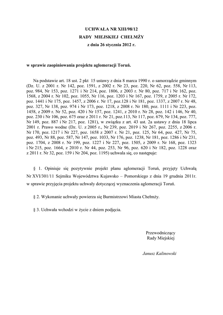 UCHWAŁA NR XIII/98/12 RADY MIEJSKIEJ CHEŁMśY z dnia 26 stycznia 2012 r. w sprawie zaopiniowania projektu aglomeracji Toruń. Na podstawie art. 18 ust. 2 pkt 15 ustawy z dnia 8 marca 1990 r. o samorządzie gminnym (Dz. U. z 2001 r. Nr 142, poz. 1591, z 2002 r. Nr 23, poz. 220, Nr 62, poz. 558, Nr 113, poz. 984, Nr 153, poz. 1271 i Nr 214, poz. 1806, z 2003 r. Nr 80, poz. 717 i Nr 162, poz. 1568, z 2004 r. Nr 102, poz. 1055, Nr 116, poz. 1203 i Nr 167, poz. 1759, z 2005 r. Nr 172, poz. 1441 i Nr 175, poz. 1457, z 2006 r. Nr 17, poz.128 i Nr 181, poz. 1337, z 2007 r. Nr 48, poz. 327, Nr 138, poz. 974 i Nr 173, poz. 1218, z 2008 r. Nr 180, poz. 1111 i Nr 223, poz. 1458, z 2009 r. Nr 52, poz. 420 i Nr 157, poz. 1241, z 2010 r. Nr 28, poz. 142 i 146, Nr 40, poz. 230 i Nr 106, poz. 675 oraz z 2011 r. Nr 21, poz.113, Nr 117, poz. 679, Nr 134, poz. 777, Nr 149, poz. 887 i Nr 217, poz. 1281), w związku z art. 43 ust. 2a ustawy z dnia 18 lipca 2001 r. Prawo wodne (Dz. U. z 2005 r., Nr 239, poz. 2019 i Nr 267, poz. 2255, z 2006 r. Nr 170, poz. 1217 i Nr 227, poz. 1658 z 2007 r. Nr 21, poz. 125, Nr 64, poz. 427, Nr 75, poz. 493, Nr 88, poz. 587, Nr 147, poz. 1033, Nr 176, poz. 1238, Nr 181, poz. 1286 i Nr 231, poz. 1704, z 2008 r. Nr 199, poz. 1227 i Nr 227, poz. 1505, z 2009 r. Nr 168, poz. 1323 i Nr 215, poz. 1664, z 2010 r. Nr 44, poz. 253, Nr 96, poz. 620 i Nr 182, poz. 1228 oraz z 2011 r. Nr 32, poz. 159 i Nr 204, poz. 1195) uchwala się, co następuje: § 1. Opiniuje się pozytywnie projekt planu aglomeracji Toruń, przyjęty Uchwałą Nr XVI/301/11 Sejmiku Województwa Kujawsko – Pomorskiego z dnia 19 grudnia 2011r. w sprawie przyjęcia projektu uchwały dotyczącej wyznaczenia aglomeracji Toruń. § 2. Wykonanie uchwały powierza się Burmistrzowi Miasta ChełmŜy. § 3. Uchwała wchodzi w Ŝycie z dniem podjęcia. Przewodniczący Rady Miejskiej Janusz Kalinowski UZASADNIENIE do uchwały nr XIII/98/12 Rady Miejskiej ChełmŜy z dnia 26 stycznia 2012 r. w sprawie zaopiniowania projektu aglomeracji Toruń. Stosownie do art. 18 ust. 2 pkt 15 ustawy z dnia 8 marca 1990r. o samorządzie gminnym (Dz.U. z 2001r. Nr 142, poz. 1591 z późn.zm.) oraz art. 43 ust. 2a ustawy z dnia 18 lipca 2001 r. Prawo wodne (Dz.U. z 2005 r., Nr 239, poz. 2019 z późn.zm.), rada gminy jest organem właściwym do zaopiniowania projektu planu aglomeracji. W dniu 28 grudnia do Przewodniczącego Rady Miasta ChełmŜy wpłynęło pismo Marszałka Województwa Kujawsko – Pomorskiego w Toruniu w sprawie zaopiniowania projektu planu aglomeracji Toruń, przyjętego Uchwałą Nr XVI/301/11 Sejmiku Województwa Kujawsko – Pomorskiego z dnia 19 grudnia 2011r. w sprawie przyjęcia projektu uchwały dotyczącej wyznaczenia aglomeracji Toruń. Nowa aglomeracja zostanie utworzona z części pięciu gmin tj. gminy miasto Toruń, gminy miasto ChełmŜa, gminy ChełmŜa, gminy Łysomice i gminy Zławieś Wielka. Planowana aglomeracja spełnia równieŜ wszystkie wymagania przewidziane rozporządzeniem Ministra Środowiska z dnia 1 lipca 2010r. w sprawie sposobu wyznaczania obszaru i granic aglomeracji (Dz. U. Nr 137, poz. 922). Mając na uwadze powyŜsze naleŜy pozytywnie zaopiniować projekt planu aglomeracji Toruń, przyjęty w/w uchwałą Sejmiku Województwa Kujawsko – Pomorskiego. W związku z powyŜszym podjęcie niniejszej uchwały jest zasadne.