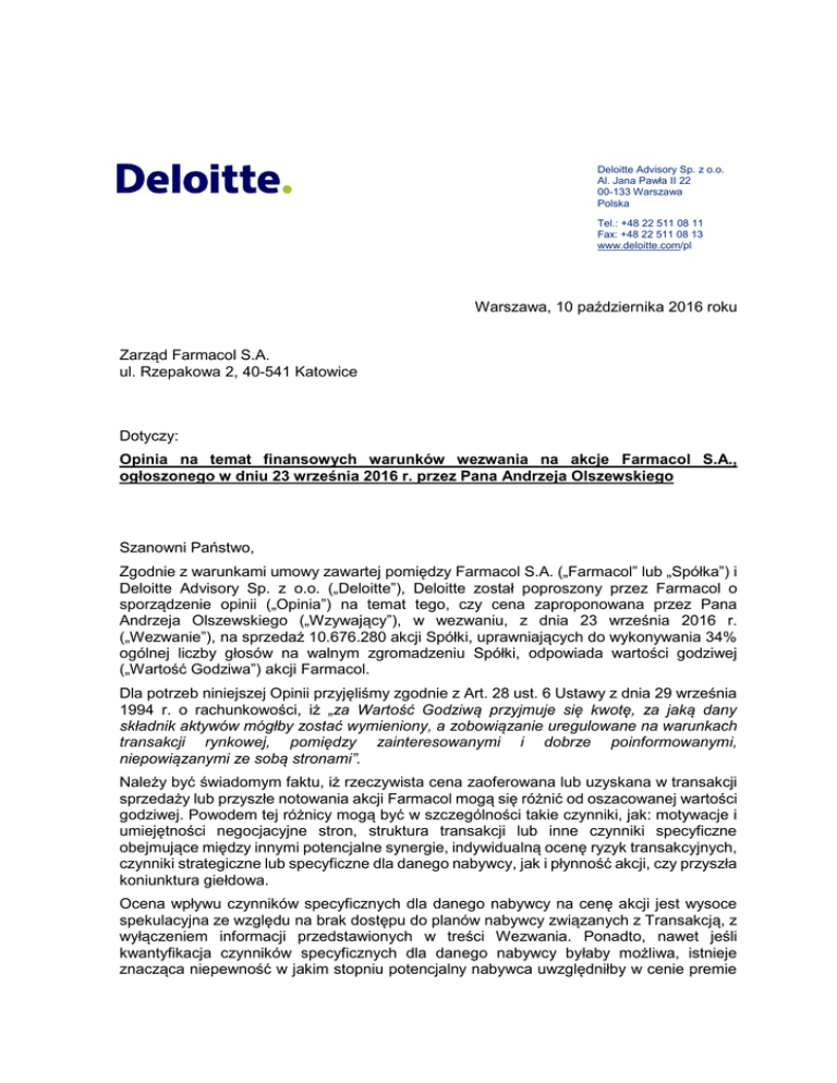 Deloitte Advisory Sp. z o.o. Al. Jana Pawła II 22 00-133 Warszawa Polska Tel.: +48 22 511 08 11 Fax: +48 22 511 08 13 www.deloitte.com/pl Warszawa, 10 października 2016 roku Zarząd Farmacol S.A. ul. Rzepakowa 2, 40-541 Katowice Dotyczy: Opinia na temat finansowych warunków wezwania na akcje Farmacol S.A., ogłoszonego w dniu 23 września 2016 r. przez Pana Andrzeja Olszewskiego Szanowni Państwo, Zgodnie z warunkami umowy zawartej pomiędzy Farmacol S.A. („Farmacol” lub „Spółka”) i Deloitte Advisory Sp. z o.o. („Deloitte”), Deloitte został poproszony przez Farmacol o sporządzenie opinii („Opinia”) na temat tego, czy cena zaproponowana przez Pana Andrzeja Olszewskiego („Wzywający”), w wezwaniu, z dnia 23 września 2016 r. („Wezwanie”), na sprzedaż 10.676.280 akcji Spółki, uprawniających do wykonywania 34% ogólnej liczby głosów na walnym zgromadzeniu Spółki, odpowiada wartości godziwej („Wartość Godziwa”) akcji Farmacol. Dla potrzeb niniejszej Opinii przyjęliśmy zgodnie z Art. 28 ust. 6 Ustawy z dnia 29 września 1994 r. o rachunkowości, iż „za Wartość Godziwą przyjmuje się kwotę, za jaką dany składnik aktywów mógłby zostać wymieniony, a zobowiązanie uregulowane na warunkach transakcji rynkowej, pomiędzy zainteresowanymi i dobrze poinformowanymi, niepowiązanymi ze sobą stronami”. Należy być świadomym faktu, iż rzeczywista cena zaoferowana lub uzyskana w transakcji sprzedaży lub przyszłe notowania akcji Farmacol mogą się różnić od oszacowanej wartości godziwej. Powodem tej różnicy mogą być w szczególności takie czynniki, jak: motywacje i umiejętności negocjacyjne stron, struktura transakcji lub inne czynniki specyficzne obejmujące między innymi potencjalne synergie, indywidualną ocenę ryzyk transakcyjnych, czynniki strategiczne lub specyficzne dla danego nabywcy, jak i płynność akcji, czy przyszła koniunktura giełdowa. Ocena wpływu czynników specyficznych dla danego nabywcy na cenę akcji jest wysoce spekulacyjna ze względu na brak dostępu do planów nabywcy związanych z Transakcją, z wyłączeniem informacji przedstawionych w treści Wezwania. Ponadto, nawet jeśli kwantyfikacja czynników specyficznych dla danego nabywcy byłaby możliwa, istnieje znacząca niepewność w jakim stopniu potencjalny nabywca uwzględniłby w cenie premie Farmacol S.A. Opinia na temat finansowych warunków wezwania na akcje Farmacol S.A., ogłoszonego w dniu 23 września 2016r. przez Pana Andrzeja Olszewskiego 10 października 2016r. lub dyskonta w stosunku do wartości godziwej z tytułu wyżej wymienionych czynników specyficznych. W związku z powyższym, niniejsza opinia na temat Wartości Godziwej odnosi się do wartości posiadanego przez Farmacol majątku, jego potencjału dochodowego, rynkowych stóp zwrotu dla aktywów o profilu ryzyka zbliżonym do Farmacol oraz pakietu akcji będącego przedmiotem Wezwania. Poniżej przedstawiamy nasze zrozumienie warunków finansowych Wezwania, podsumowanie przeprowadzonych przez Deloitte analiz, ograniczenia i zastrzeżenia oraz wnioski naszej Opinii. Warunki finansowe Wezwania W dniu 23 września 2016 r. („Data Wezwania”) Pan Andrzej Olszewski ogłosił wezwanie do sprzedaży wszystkich akcji Spółki, tj. 10.676.280 akcji zwykłych na okaziciela, wyemitowanych przez Spółkę, o wartości nominalnej 1,00 zł każda, uprawniających do wykonywania 34% ogólnej liczby głosów na walnym zgromadzeniu Spółki (dalej: „Akcje”). Akcje zostały dopuszczone i wprowadzone do obrotu na rynku regulowanym i są notowane na rynku podstawowym prowadzonym przez Giełdę Papierów Wartościowych w Warszawie S.A. oraz są zarejestrowane w depozycie papierów wartościowych prowadzonym przez Krajowy Depozyt Papierów Wartościowych S.A. i oznaczone kodem PLFRMCL00066. Cena za akcję ogłoszona w Wezwaniu przez Wzywającego wynosi 47,50 PLN (słownie: czterdzieści siedem złotych 50/100) za jedną Akcję. Zgodnie z treścią Wezwania: a) Cena Akcji w Wezwaniu nie jest niższa niż cena minimalna określona zgodnie z przepisami prawa oraz spełnia kryteria wskazane w art. 79 ust. 1, 2 i 3 Ustawy, b) Średnia arytmetyczna ze średnich dziennych cen ważonych wolumenem obrotu z okresu 6 (sześciu) miesięcy poprzedzających ogłoszenie Wezwania, w czasie, w którym dokonywany był obrót Akcjami na rynku podstawowym GPW wynosi 44,66 zł (słownie: czterdzieści cztery złote 66/100), c) Średnia arytmetyczna ze średnich dziennych cen ważonych wolumenem obrotu z okresu 3 (trzech) miesięcy poprzedzających ogłoszenie Wezwania, w czasie, w którym dokonywany był obrót Akcjami na rynku podstawowym GPW wynosi 45,84 zł (słownie: czterdzieści pięć złotych 84/100), d) Terminy rozpoczęcia i zakończenia okresu przyjmowania zapisów na sprzedaż akcji Spółki, to odpowiednio: 14 października 2016 roku i 23 listopada 2016 roku. Niniejsza Opinia odnosi się jedynie do ceny zaproponowanej w Wezwaniu i nie dotyczy jakichkolwiek innych warunków Wezwania oraz zakłada, iż nie istnieją jakiekolwiek umowy ani porozumienia mające wpływ na cenę zaproponowaną w Wezwaniu. Podsumowanie analiz przeprowadzonych przez Deloitte Na potrzeby wydania niniejszej Opinii wykonaliśmy następujące procedury: 1. dokonaliśmy analizy publicznie dostępnych sprawozdań finansowych i innych informacji finansowych i operacyjnych Farmacol; 2. dokonaliśmy przeglądu wybranych informacji zarządczych i innych danych finansowych i operacyjnych dotyczących działalności Farmacol; 3. omówiliśmy z przedstawicielami Farmacol przeszłą i bieżącą działalność i stan finansowy oraz perspektywy rozwoju Farmacol; 2 Farmacol S.A. Opinia na temat finansowych warunków wezwania na akcje Farmacol S.A., ogłoszonego w dniu 23 września 2016r. przez Pana Andrzeja Olszewskiego 10 października 2016r. 4. dokonaliśmy przeglądu i analizy najważniejszych założeń do projekcji finansowych prz