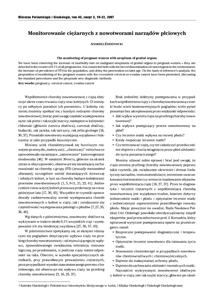 Kliniczna Perinatologia i Ginekologia, tom 43, zeszyt 3, 19-22, 2007 Monitorowanie ciężarnych z nowotworami narządów płciowych A NDRZEJ Z DZIENNICKI The monitoring of pregnant women with neoplasm of genital organs We have been observing the increase of morbidity rate on malignant neoplasms of genital organs in pregnant women – they are detected in the course of 0.1% of all pregnancies. It is connected both with the fact of dissemination of cancerogens in the environment, the increase of prevalence of STD in the population, and delay the procreation on later age. On the basis of reference’s analysis, the proposition of monitoring of the pregnant women with the co-existent cervical or ovarian cancer have been presented, discussing the standard procedures and the proposals new diagnostic methods. Key words: pregnancy, cervical cancer, ovarian cancer Współistnienie choroby nowotworowej z ciążą obej- muje okres czasu trwania ciąży oraz kolejnych 12 miesięcy po odbytym porodzie lub poronieniu. U kobiety ciężarnej możemy spotkać się z każdym rodzajem choroby nowotworowej; biorąc pod uwagę częstość występowania są to: rak piersi i rak szyjki macicy; następnie w kolejności chłoniaki (głównie ziarnica złośliwa), czerniak złośliwy, białaczki, rak jajnika, rak tarczycy, rak jelita grubego [16, 30, 37]. Pozostałe nowotwory występują wyjątkowo i traktujemy je jako przypadki kazuistyczne. Miniony wiek charakteryzował się burzliwym rozwojem przemysłu, motoryzacji, „chemizacji” rolnictwa co spowodowało narastające „zaśmiecanie” kancerogenami środowiska [46]. W ostatnim 30-leciu, głównie na skutek zmian w obyczajowości, obserwuje się narastającą zachorowalność na choroby z grupy STD (sexually transmitted diseases), szczególnie wśród dorastających dziewcząt i młodych kobiet, w tym na choroby będące kofaktorami procesów nowotworowych [1, 5, 9-11, 21, 23, 41]. Jednocześnie coraz więcej kobiet przesuwa prokreację na coraz późniejsze lata [17, 36, 43]. Wszystkie te czynniki spowodowały zaobserwowalny wzrost występowania chorób nowotworowych u kobiet w ciąży, jak i zwiększenie się częstotliwości występowania patologii u płodów [7, 27, 35, 36, 46]. Wg danych z piśmiennictwa, nowotwory złośliwe są wykrywane w trakcie około 0,1% wszystkich ciąż i występowanie ich ma tendencję zwyżkową [27, 30, 37, 43]. W piśmiennictwie spotykamy się ze skrajnie różniącymi się poglądami dotyczącymi wpływu ciąży na przebieg choroby nowotworowej – od stymulującego jej wpływu, spowodowanego zwiększoną tolerancją immunologiczną, po przekonanie, iż podczas ciąży rośnie odporność na raka. Obecnie, w wysoko specjalistycznych ośrodkach, przy prawidłowym prowadzeniu ciężarnych, poza przypadkami wysoko zaawansowanego procesu chorobowego, nie obserwuje się wpływu ciąży na przebieg choroby nowotworowej [3, 16, 25, 37]. Brak jednolitej doktryny postępowania w przypadkach współistnienia ciąży z chorobą nowotworową u matki budzi wiele kontrowersyjnych poglądów; wiele pytań pozostaje bez akceptowanej przez większość odpowiedzi: • Jaki wpływ wywiera ciąża na przebieg choroby nowotworowej? • Jak wpływa postępujący proces nowotworowy na płód? • Czy leczenie matki wpływa na rozwój płodu? • Kiedy rozpocząć leczenie matki? • Czy terminować ciążę, czy też zakończyć przedwcześnie dopiero z chwilą osiągnięcia przez płód zdolności do życia pozamacicznego? Musimy zdawać sobie sprawę i brać pod uwagę, że ciąża zmienia przebieg choroby nowotworowej poprzez takie czynniki, jak: zwiększone ukrwienie i drenaż limfatyczny narządów, immunomodulacje, zmienione uwarunkowania hormonalne czy wreszcie maskowanie objawów przez współistniejącą ciążę [16, 27, 37]. Przez to diagnostyka i leczenie ciężarnych z współistniejącą chorobą nowotworową jest wyjątkowo trudne, bowiem dotyczy jednocześnie matki i płodu – optymalne leczenie matki z jednoczesnym zapewnieniem prawidłowego rozwoju płodu. Mając powyższe na uwadze, Rada Naukowa Polskiej Unii Onkologii powołała interdyscyplinarny zespół ekspertów pod przewodnictwem prof. J. Kornafela, który opracował wytyczne postępowania oparte na przestrzeganiu zasad: • Bezpieczne postępowanie diagnostyczne i terapeutyczne. • Optymalne leczenie nowotworu dla ratowania życia matki. • Stosowanie chemioterapii w przypadkach nowotworów chemiowrażliwych i chemiowyleczalnych. • Dążenie do maksymalnej ochrony płodu. • Dążenie do zachowania zdolności rozrodczych matki. Najczęściej wykrywanym nowotworem złośliwym u kobiet w ciąży jest rak szyjki macicy; głównie po ukoń- I Katedra Ginekologii i Położnictwa Uniwersytetu Medycznego w Łodzi, I Klinika Ginekologii i Onkologii Ginekologicznej 20 A. Zdziennicki czonym 31. roku życia. Występuje z częstością 1-1,3/100010000 ciąż [4, 16, 25, 30, 37, 39, 40, 43]. W wyniku systematycznie przeprowadzanych badań lekarskich, wykrywalność raka szyjki macicy w ciąży jest 3-krotnie większa niż u kobiet nieciężarnych i dotyczy w przeważającej części stanów przedrakowych i raka we wczesnym stadium zaawansowania klinicznego – około 80% wszystkich przypadków [3, 4, 14, 30, 40, 43]. Powyżej 90% przypadków raka szyjki macicy u ciężarnych wykrywana jest w I i II trymestrze [4]. W większości przypadków, rak szyjki macicy powstaje na bazie stanów zapalnych wywołanych przez HPV, HSV, HIV czy Chlamydię trachomatis [1, 5, 9, 11, 21, 23, 39, 41, 42]. W dużym uproszczeniu możemy przyjąć następujący, etapowo przebiegający rozwój choroby [16, 37, 38, 43, 44]: • Stany zapalne z wystąpieniem nieprawidłowych komórek trudnych do oceny (ASCUT – atypical squamous cell of undetermined significance oraz AGUS – atypical glandular cell of undetermined significance). • Dysplasia – CIN I, CIN II. • Rak przedinwazyjny (śródnab