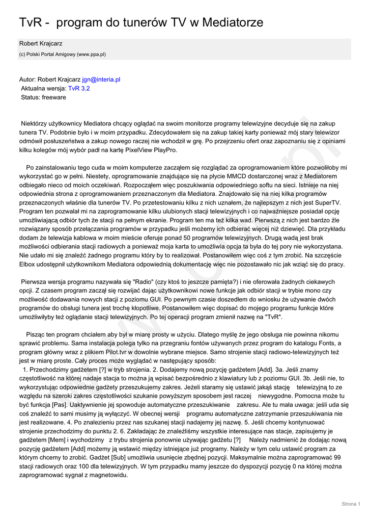 TvR - program do tunerów TV w Mediatorze Robert Krajcarz (c) Polski Portal Amigowy (www.ppa.pl) Autor: Robert Krajcarz [email protected] Aktualna wersja: TvR 3.2 Status: freeware .p l Niektórzy użytkownicy Mediatora chcący oglądać na swoim monitorze programy telewizyjne decyduje się na zakup tunera TV. Podobnie było i w moim przypadku. Zdecydowałem się na zakup takiej karty ponieważ mój stary telewizor odmówił posłuszeństwa a zakup nowego raczej nie wchodził w grę. Po przejrzeniu ofert oraz zapoznaniu się z opiniami kilku kolegów mój wybór padł na kartę PixelView PlayPro. w .p pa Po zainstalowaniu tego cuda w moim komputerze zacząłem się rozglądać za oprogramowaniem które pozwoliłoby mi wykorzystać go w pełni. Niestety, oprogramowanie znajdujące się na płycie MMCD dostarczonej wraz z Mediatorem odbiegało nieco od moich oczekiwań. Rozpocząłem więc poszukiwania odpowiedniego softu na sieci. Istnieje na niej odpowiednia strona z oprogramowaniem przeznaczonym dla Mediatora. Znajdowało się na niej kilka programów przeznaczonych właśnie dla tunerów TV. Po przetestowaniu kilku z nich uznałem, że najlepszym z nich jest SuperTV. Program ten pozwalał mi na zaprogramowanie kilku ulubionych stacji telewizyjnych i co najważniejsze posiadał opcję umożliwiającą odbiór tych że stacji na pełnym ekranie. Program ten ma też kilka wad. Pierwszą z nich jest bardzo źle rozwiązany sposób przełączania programów w przypadku jeśli możemy ich odbierać więcej niż dziewięć. Dla przykładu dodam że telewizja kablowa w moim mieście oferuje ponad 50 programów telewizyjnych. Drugą wadą jest brak możliwości odbierania stacji radiowych a ponieważ moja karta to umożliwia opcja ta była do tej pory nie wykorzystana. Nie udało mi się znaleźć żadnego programu który by to realizował. Postanowiłem więc coś z tym zrobić. Na szczęście Elbox udostępnił użytkownikom Mediatora odpowiednią dokumentację więc nie pozostawało nic jak wziąć się do pracy. Pierwsza wersja programu nazywała się "Radio" (czy ktoś to jeszcze pamięta?) i nie oferowała żadnych ciekawych opcji. Z czasem program zaczął się rozwijać dając użytkownikowi nowe funkcje jak odbiór stacji w trybie mono czy możliwość dodawania nowych stacji z poziomu GUI. Po pewnym czasie doszedłem do wniosku że używanie dwóch programów do obsługi tunera jest trochę kłopotliwe. Postanowiłem więc dopisać do mojego programu funkcje które umożliwiłyby też oglądanie stacji telewizyjnych. Po tej operacji program zmienił nazwę na "TvR". w w Pisząc ten program chciałem aby był w miarę prosty w użyciu. Dlatego myślę że jego obsługa nie powinna nikomu sprawić problemu. Sama instalacja polega tylko na przegraniu fontów używanych przez program do katalogu Fonts, a program główny wraz z plikiem Pilot.tvr w dowolnie wybrane miejsce. Samo strojenie stacji radiowo-telewizyjnych też jest w miarę proste. Cały proces może wyglądać w następujący sposób: 1. Przechodzimy gadżetem [?] w tryb strojenia. 2. Dodajemy nową pozycję gadżetem [Add]. 3a. Jeśli znamy częstotliwość na której nadaje stacja to można ją wpisać bezpośrednio z klawiatury lub z poziomu GUI. 3b. Jeśli nie, to wykorzystując odpowiednie gadżety przeszukujemy zakres. Jeżeli staramy się ustawić jakąś stację telewizyjną to ze względu na szeroki zakres częstotliwości szukanie powyższym sposobem jest raczej niewygodne. Pomocna może tu być funkcja [Pas]. Uaktywnienie jej spowoduje automatyczne przeszukiwanie zakresu. Ale tu mała uwaga: jeśli uda się coś znaleźć to sami musimy ją wyłączyć. W obecnej wersji programu automatyczne zatrzymanie przeszukiwania nie jest realizowane. 4. Po znalezieniu przez nas szukanej stacji nadajemy jej nazwę. 5. Jeśli chcemy kontynuować strojenie przechodzimy do punktu 2. 6. Zakładając że znaleźliśmy wszystkie interesujące nas stacje, zapisujemy je gadżetem [Mem] i wychodzimy z trybu strojenia ponownie używając gadżetu [?] Należy nadmienić że dodając nową pozycję gadżetem [Add] możemy ją wstawić między istniejące już programy. Należy w tym celu ustawić program za którym chcemy to zrobić. Gadżet [Sub] umożliwia usunięcie zbędnej pozycji. Maksymalnie można zaprogramować 99 stacji radiowych oraz 100 dla telewizyjnych. W tym przypadku mamy jeszcze do dyspozycji pozycję 0 na której można zaprogramować sygnał z magnetowidu. Strona 1 TvR - program do tunerów TV w Mediatorze Robert Krajcarz (c) Polski Portal Amigowy (www.ppa.pl) Nowością od tej wersji są: [PTS] - Umożliwia to uśpienie programu z poziomu pilota. [TV Mono] - Myślę że to może się przydać użytkownikom nie mogącym odbierać stacji telewizyjnych w STEREO. Uaktywnienie tej funkcji powodować będzie automatyczne włączanie trymu MONO przy przejściu w tryb TV. Od wersji 2.0 większość z tych funkcji można obsługiwać za pomocą pilota. Lecz nie u wszystkich użytkowników posiadających tą samą kartę co ja było to możliwe. Problemem okazała się różna lokacja przestrzeni adresowej tunera. Dlatego w obecnej wersji można dokonać odpowiedniej korekty w pliku Pilot.tvr, która ma na celu wyeliminowanie tego problemu. Plik ten zawiera także kody klawiszy wysyłanych przez pilota przez co możliwa jest jego modyfikacja tak aby możliwe było dostosowanie programu do obsługi pilotów tunerów TV innych firm. w .p pa .p l Program ten poza wymienionymi wyżej zaletami posiada także kilka wad. Do poważniejszych z nich zalicza się tylko jeden standard systemu kodowania koloru. Aktualnie ustawimy na PAL BDGHI. Dlatego też użytkownicy mieszkający na przykład w USA nie będą mogli skorzystać z trybu TV. Pisząc mój program nie spodziewałem się że może zyskać jakikolwiek rozgłos. Zresztą nie otrzymałem żadnych informacji mówiących o tym problemie. Do mniej poważnych można zaliczyć: 1. Workben