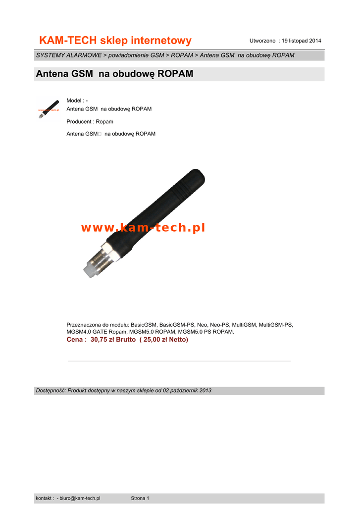 KAM-TECH sklep internetowy Utworzono : 19 listopad 2014 SYSTEMY ALARMOWE > powiadomienie GSM > ROPAM > Antena GSM na obudowę ROPAM Antena GSM na obudowę ROPAM Model : Antena GSM na obudowę ROPAM Producent : Ropam Antena GSM� na obudowę ROPAM Przeznaczona do modułu: BasicGSM, BasicGSM-PS, Neo, Neo-PS, MultiGSM, MultiGSM-PS, MGSM4.0 GATE Ropam, MGSM5.0 ROPAM, MGSM5.0 PS ROPAM. Cena : 30,75 zł Brutto ( 25,00 zł Netto) Dostępność: Produkt dostępny w naszym sklepie od 02 październik 2013 kontakt : - [email protected] Strona 1