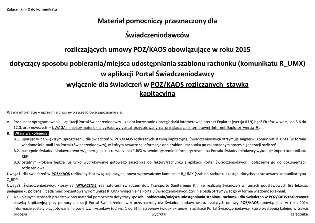 Załącznik nr 2 do komunikatu Materiał pomocniczy przeznaczony dla Świadczeniodawców rozliczających umowy POZ/KAOS obowiązujące w roku 2015 dotyczący sposobu pobierania/miejsca udostępniania szablonu rachunku (komunikatu R_UMX) w aplikacji Portal Świadczeniodawcy wyłącznie dla świadczeń w POZ/KAOS rozliczanych stawką kapitacyjną Ważne informacje – uprzejmie prosimy o szczegółowe zapoznanie się: A. Producent oprogramowania – aplikacji Portal Świadczeniodawcy – zaleca korzystanie z przeglądarki internetowej Internet Explorer (wersja 8 i 9) bądź Firefox w wersji od 3.6 do 12.0, oraz nowszych – UWAGA: niniejszy materia ł przykładowy został przygotowany na przeglądarce internetowej Internet Explorer wersja 9 . B. Właściwa kolejność: B.1. ujmując w największym uproszczeniu dla świadczeń w POZ/KAOS rozliczanych stawką kapitacyjną, Świadczeniodawca otrzymuje najpierw, komunikat R_UMX (w formie wiadomości e-mail i na Portalu Świadczeniodawcy), w którym zawarte są informacje dot. szablonu rachunku po zakończonym procesie generacji rozliczeń B.2. następnie Świadczeniodawca tworzy/generuje plik o rozszerzeniu *.RFX w swoim systemie informatycznym i na Portalu Świadczeniodawcy wykonuje import komunikatu REF B.3. ostatnim krokiem będzie już tylko wydrukowanie gotowego załącznika do faktury/rachunku z aplikacji Portal Świadczeniodawcy i dołączenie go do dokumentacji rozliczeniowej Uwaga1: dla świadczeń w POZ/KAOS rozliczanych stawką kapitacyjną, nowo wprowadzony komunikat R_UMX (szablon rachunku) zastąpi dotychczas stosowany komunikat typu Z_RDP Uwaga2: Świadczeniodawcy, którzy są WYŁĄCZNIE realizatorami świadczeń dot. Transportu Sanitarnego (tj. nie realizują świadczeń w ramach podstawowych list lekarza, pielęgniarki, położnej ) będą mieć prezentowany komunikat R_UMX wyłącznie na Portalu Świadczeniodawcy, czyli nie będą otrzymywać go w formie wiadomości e-mail. C. Na kolejnych stronach przedstawiono materiał pomocniczy dotyczący sposobu pobierania/miejsca udostępniania szablonu rachunku dla świadczeń w POZ/KAOS rozliczanych stawką kapitacyjną przy pomocy aplikacji Portal Świadczeniodawcy przeznaczony dla Świadczeniodawców rozliczających umowy POZ/KAOS obowiązujące w roku 2014. Informacje zostały przygotowane na bazie tzw. rysunków (od rys. 1 do 5) tj. screenów (widok ekranów) z aplikacji Portal Świadczeniodawcy, które występują kolejno w trakcie procesu wydruku załącznika. Rys. 1 1. Po wejściu na stronę internetową www.nfz-wroclaw.pl wybieramy link Ważne linki a następnie link Portal DOW NFZ - (rys. 1). Rys. 1.1 1.1. w kolejnym widoku (rys. 1.1) wybieramy link Portal Świadczeniodawcy. Rys. 2 2. w kolejnym widoku (rys. 2) Logowanie po wpisaniu odpowiednich danych w polach 2.1. Kod świadczeniodawcy: 2.2. Użytkownik: 2.3. oraz Hasło: wybieramy przycisk Zaloguj Rys. 3 3. w kolejnym widoku (rys. 3) w dziale Umowy na realizację świadczeń wybieramy link Pokaż więcej Rys. 4 4. w kolejnym widoku (rys. 4) w dziale Umowy na realizację świadczeń wybieramy link Przegląd danych o deklaracjach POZ Rys. 5 5. w kolejnym widoku (rys. 5) Przegląd szablonów rachunków dotyczących deklaracji POZ - wybieramy/określamy dane w polach Rok, Miesiąc i Kod umowy - następnie wybieramy przycisk Znajdź i po wyszukaniu danych wybieramy link Pobierz dot. danego szablonu Przykładowy widok w części Podsumowanie pokazano poniżej – gdzie w kolumnie Akcje możemy wybrać link pn. Pobierz – w celu pobrania SZABLONU