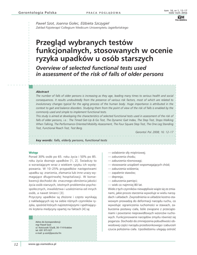 Gerontologia Polska PRACA POGLĄDOWA tom 16, nr 1, 12–17 ISSN 1425–4956 Paweł Szot, Joanna Golec, Elżbieta Szczygieł Zakład Fizjoterapii Collegium Medicum Uniwersytetu Jagiellońskiego Przegląd wybranych testów funkcjonalnych, stosowanych w ocenie ryzyka upadków u osób starszych Overview of selected functional tests used in assessment of the risk of falls of older persons Abstract The number of falls of older persons is increasing as they age, leading many times to serious health and social consequences. It results undoubtedly from the presence of various risk factors, most of which are related to involutonary changes typical for the aging process of the human body. Huge importance is attributed in the context to gait and balance disorders. Studying them from the point of view of the risk of falls is enabled by the commonly used and simple to implement functional tests. This study is aimed at developing the characteristics of selected functional tests used in assessment of the risk of falls of older persons, i.e.: The Timed Get-Up & Go Test, The Dynamic Gait Index, The Step Test, Stops Walking When Talking, The Performance-Oriented Mobility Assessment, The Four Square Step Test, The One Leg Standing Test, Functional Reach Test, Test Berg. Gerontol. Pol. 2008; 16: 12–17 key words: falls, elderly persons, functional tests Wstęp Ponad 30% osób po 65. roku życia i 50% po 85. roku życia doznaje upadków [1, 2]. Świadczy to o wzrastającym wraz z wiekiem ryzyku ich występowania. W 10–25% przypadków następstwami upadku są: zranienia, złamania lub inne urazy wymagające długotrwałej hospitalizacji. W konsekwencji dochodzi do znacznego obniżenia jakości życia osób starszych, istotnych problemów psychospołecznych, inwalidztwa i uzależnienia od innych osób, a nawet śmierci [3]. Przyczyny upadków są złożone i często wynikają z nakładających się na siebie różnych czynników ryzyka, spośród których najistotniejszymi i spełniającymi kryteria medycyny opartej na faktach [4] są: Adres do korespondencji: mgr Paweł Szot ul. Kościuszki 52a/8, 30–114 Kraków tel. 691 975 027 e-mail: [email protected] 12 www.gp.viamedica.pl — osłabienie siły mięśniowej; — zaburzenia chodu; — zaburzenia równowagi; — stosowanie urządzeń wspomagających chód; — zaburzenia widzenia; — zapalenie stawów; — depresja; — zaburzenia pamięci; — wiek co najmniej 80 lat. Wiele z tych czynników niewątpliwie wiąże się ze zmianami, jakie proces starzenia wywołuje w wielu narządach i układach. Zwyrodnienia w układzie kostno-stawowym prowadzą do deformacji narządu ruchu, co wywołuje: ograniczenia ruchomości w stawach, zaburzenia postawy ciała, bóle związane z przeciążeniami i powstanie nieprawidłowych wzorców ruchowych. Funkcjonowanie narządów zmysłu również się pogarsza. Dochodzi do zmniejszenia pobudliwości obwodowej części narządu przedsionkowego i zaburzeń czucia położenia ciała. Upośledzeniu ulegają ostrość Paweł Szot i wsp., Przegląd wybranych testów funkcjonalnych wzroku oraz zdolność widzenia obwodowego i przestrzennego. W obrębie układu nerwowo-mięśniowego obserwuje się natomiast zmniejszenie masy, siły i wydolności mięśni. Spowolnieniu ulegają czynności neuromotoryczne, wydłuża się czas reakcji, pogarsza się spostrzegawczość, podzielność uwagi i koordynacja ruchów [5]. W sytuacjach wymagających większej prędkości, siły lub zwinności, czyli wtedy, gdy konieczna jest odruchowa reakcja dla utrzymania równowagi, osoby starsze stają się niewydolne. Dochodzi do znacznego ograniczenia ich sprawności i funkcji lokomocyjnych. Chód staje się wolniejszy i niepewny, krok się skraca, pojawiają się problemy z pokonywaniem przeszkód, zmianami pozycji i obrotami. Te pozornie proste, codzienne czynności, którym towarzyszy przeniesienie środka ciężkości, powodują wzrost ryzyka upadków. Znalazło to potwierdzenie w badaniach przeprowadzonych przez Lewczuk i Białoszewskiego [6]. Podobną analizę przeprowadzili Żak i Grodzicki [7], którzy wykazali, że zwiększone ryzyko upadków u osób starszych jest związane ze zmianą pozycji i chodzeniem. Z kolei Skalska i wsp. [8] wskazują chodzenie i wstawanie jako czynności, w czasie których najczęściej dochodzi do upadków. Według National Institiute for Clinical Exellence UK [9] u każdego starszego pacjenta, zgłaszającego występowanie co najmniej jednego upadku w ciągu ostatniego roku, powinno się przeprowadzić badanie chodu i równowagi. Jest to pomocne w wyselekcjonowaniu osób i czynności najbardziej zagrożonych upadkami. Ważną kwestię stanowi zatem wybór właściwych metod, które umożliwią szybką i rzetelną ocenę chodu i równowagi pod kątem ryzyka upadków z możliwie dużą dokładnością. Dużą popularnością cieszą się testy funkcjonalne, oceniające ryzyko upadków u osób starszych. Łączą one w sobie elementy fizjologiczne i wymogi czynnościowe, odtwarzające rzeczywiste, codzienne aktywności większości ludzi, związane z chodzeniem i utrzymaniem równowagi. Ich dostępność, możliwości zastosowania w każdych warunkach, bez konieczności użycia kosztownego sprzętu, i krótki czas ich przeprowadzenia sprawia, że są one bardzo praktycznym narzędziem badania przeglądowego, w przeciwieństwie do skomplikowanych technologicznie pomiarów. Celem prezentowanej pracy jest charakterystyka wybranych testów funkcjonalnych stosowanych w ocenie ryzyka upadków, ze zwróceniem szczególnej uwagi na sposób ich przeprowadzenia, rzetelność pomiarów oraz czułość i specyficzność w prognozowaniu upadków u osób starszych. Testy funkcjonalne Timed Up & Go Test Timed Up & Go Test (TUG) jest modyfikacją testu Get–Up & Go wprowadzonego w 1986 roku przez Mathiasa i wsp. [10]. Modyfikacja, autorstwa Podsiadło i Richardson [11], polegała na zastąpieniu pięciostopniowej oceny punktowej pom