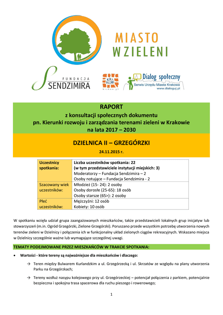 RAPORT z konsultacji społecznych dokumentu pn. Kierunki rozwoju i zarządzania terenami zieleni w Krakowie na lata 2017 – 2030 DZIELNICA II – GRZEGÓRZKI 24.11.2015 r. Uczestnicy spotkania: Szacowany wiek uczestników: Płeć uczestników: Liczba uczestników spotkania: 22 (w tym przedstawiciele instytucji miejskich: 3) Moderatorzy – Fundacja Sendzimira – 2 Osoby notujące – Fundacja Sendzimira - 2 Młodzież (15- 24): 2 osoby Osoby dorosłe (25-65): 18 osób Osoby starsze (65>): 2 osoby Mężczyźni: 12 osób Kobiety: 10 osób W spotkaniu wzięła udział grupa zaangażowanych mieszkańców, także przedstawicieli lokalnych grup inicjatyw lub stowarzyszeń (m.in. Ogród Grzegórzki, Zielone Grzegórzki). Poruszano przede wszystkim potrzebę utworzenia nowych terenów zieleni w Dzielnicy i połączenia ich w funkcjonalny układ zielonych ciągów rekreacyjnych. Wskazano miejsca w Dzielnicy szczególnie ważne lub wymagające szczególnej uwagi. TEMATY PODEJMOWANE PRZEZ MIESZKAŃCÓW W TRAKCIE SPOTKANIA: Wartości - które tereny są najważniejsze dla mieszkańców i dlaczego: → Teren między Bulwarem Kurlandzkim a ul. Grzegórzecką i ul. Skrzatów ze względu na plany utworzenia Parku na Grzegórzkach; → Tereny wzdłuż nasypu kolejowego przy ul. Grzegórzeckiej – potencjał połączenia z parkiem, potencjalnie bezpieczna i spokojna trasa spacerowa dla ruchu pieszego i rowerowego; 1 → Tereny wzdłuż koryta rzeki Białuchy (dolina Prądnika), ze względu na możliwość stworzenia terenów rekreacyjnych; → Bulwary Wiślane, ze względu na rekreacyjny typ terenu; → Zieleń osiedlowa, ze względu na unikatowe gatunki starych drzew, które powinny być chronione oraz ze względu na jakość powietrza w mieście. Formy korzystania z terenów zieleni: → Spacery, → Zabawa z dziećmi, → Bieganie (jogging), → Jazda na rolkach / hulajnodze, → Jazda na rowerze, → Relaks i odpoczynek, → Wyprowadzanie psów. Najważniejsze potrzeby i bariery dot. korzystania z zieleni (w tym dostępność terenów zieleni, poczucie bezpieczeństwa): → Brak terenów zieleni, z których mieszkańcy mogliby korzystać i które zapewniałyby przestrzeń dla różnych użytkowników (rodzin z dziećmi, właścicieli psów, osób uprawiających sporty); → Potrzeba utworzenia parku między Bulwarem Kurlandzkim, ul. Grzegórzecką i ul. Skrzatów (Park na Grzegórzkach) o powierzchni min. 6,5 ha; → Trudny dostęp do istniejących fragmentów zieleni – głównie z powodu grodzonych osiedli powstających w Dzielnicy, ale także w związku z ruchliwymi ulicami (np. do Parku/Bulwarów na Dąbiu) czy wąskimi chodnikami; → Bariera na Alei Daszyńskiego, ze względu na brak dostępności tego terenu, poprzez pasy szybkiego ruchu. Propozycja połączenia terenu z Bulwarami Wiślanym poprzez kładkę lub usunięcie jednego pasa ruchu i stworzenie przejścia dla pieszych; → Ogrodzenie nowego osiedla przy ulicach Zieleniewskiego, Grzegórzeckiej i Fabrycznej które uniemożliwia przejście dojście do zieleni w okolicy ul. Skrzatów czy Wisły; → Sprzeciw dla objazdu do Ronda Grzegórzeckiego przez „starą” ul. Grzegórzecką (okolice terenów wojskowych). Droga ta powinna pozostać tylko w charakterze lokalnym, a nie objazdowym; → Potrzeba uspokojenia ruchu samochodowego przy końcu ul. Rakowickiej – projekt uspokojonego ruchu – woonerf; → Ochrona „starszej” zieleni osiedlowej, poprzez niepowiększanie parkingów naziemnych na osiedlach mieszkaniowych, np. Skwer Bobrowskiego; → Ochrona przed szybkim ruchem samochodowym, który stwarza barierę dostępności terenów zieleni. Wprowadzenie fizycznych „zwalniaczy” tempa ruchu; → Niezagospodarowany teren pomiędzy Cmentarzem Rakowickim a nowym osiedlem na ul. Rakowickiej, teren Wojska Polskiego – niskie poczucie bezpieczeństwa w okolicy; → Niezagospodarowany teren opuszczonego pawilonu na Ofiar Dąbia – niskie poczucie bezpieczeństwa w okolicy. 2 Potrzeby dot. zagospodarowanie nowych terenów i/lub rewaloryzacji istniejących: → Potrzeba powstania Parku na Grzegórzkach (między Bulwarem Kurlandzkim, ul. Grzegórzecką i ul. Skrzatów) o powierzchni min. 6,5 ha; → Tereny międzyosiedlowe dzielnicy powinny zostać oznaczone jako chronione, ze względu na wartościowe okazy drzew; → Rewitalizacja placu zabaw na Dąbiu; → Dolina koryta rzeki Białuchy od Alei Pokoju (zjazd z Plazy), za torami kolejowymi - teren do zagospodarowania jako teren zielony; → Stworzenie otwartego terenu zieleni przy ul. Nullo, teraz są tam zamknięte ogródki działkowe; → Postulat dosadzenia większej ilości drzew w dalszej części ul. Fabrycznej, jest na to miejsce; → Odgrodzenie ścieżki rowerowej przy Ogrodzie Botanicznym (Aleja Powstania Warszawskiego) aż do Ronda Grzegórzeckiego, osłonięcie jej od drogi żywopłotem lub drzewami; → Oczyszczenie i zagospodarowanie terenu koryta rzeki Prądnik od terenu zakładów farmaceutycznych PLIVA, aż do ujścia rzeki do Wisły. Prawidłowe zagospodarowanie kończy się przy nasypie kolejowym na ul. Rakowickiej; → Stworzenie przestrzeni zielonej, a nie parkingów, między Cmentarzem Żydowskim a ul. Daszyńskiego. → Bulwary Wiślane – potrzeba lepszego zagospodarowania i utrzymania terenu; → Potrzeba lepszego dostępu do Bulwarów na Dąbiu – lepsze połączenie terenu zieleni z innymi terenami w Dzielnicy (np. z projektowanym Parkiem na Grzegórzkach); → Utworzenie ścieżki rekreacyjno-spacerowej wśród zieleni oplatającej całą Dzielnicę; → Klin przy torach kolejowych (okolicy między ul. Mogilską a Fabryczną) - z przeznaczeniem na teren zielony, w tym wybieg dla psów; → Otworzenie ogrodzonych ogródków działkowych, być może w części wspólnej da się zbudować plac zabaw. Główny postulat: umożliwienie przejścia przez ogródki. Potrzeby odnośnie standardów utrzymania i jakości terenów zieleni: → Możliwość uratowania i
