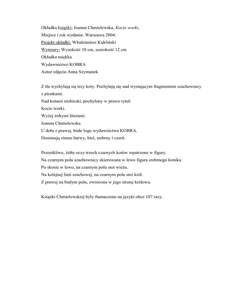 Okładka książki: Joanna Chmielewska, Kocie worki, Miejsce i rok wydania: Warszawa 2004. Projekt okładki: Włodzimierz Kukliński Wymiary: Wysokość 18 cm, szerokość 12 cm Okładka miękka Wydawnictwo KOBRA Autor zdjęcia Anna Szymanek Z tła wychylają się trzy koty. Pochylają się nad wystającym fragmentem szachownicy z pionkami. Nad kotami niebieski, pochylony w prawo tytuł: Kocie worki. Wyżej żółtymi literami: Joanna Chmielewska U dołu z prawej, białe logo wydawnictwa KOBRA. Dominują zimne barwy, biel, srebrny i czerń. Przenikliwe, żółte oczy trzech czarnych kotów wpatrzone w figury. Na czarnym polu szachownicy skierowana w lewo figura srebrnego konika. Po skosie w lewo, na czarnym polu stoi wieża. Na kolejnej linii szachowej, na czarnym polu stoi król. Z prawej na białym polu, zwrócona w jego stronę królowa. Książki Chmielewskiej były tłumaczone na języki obce 107 razy.