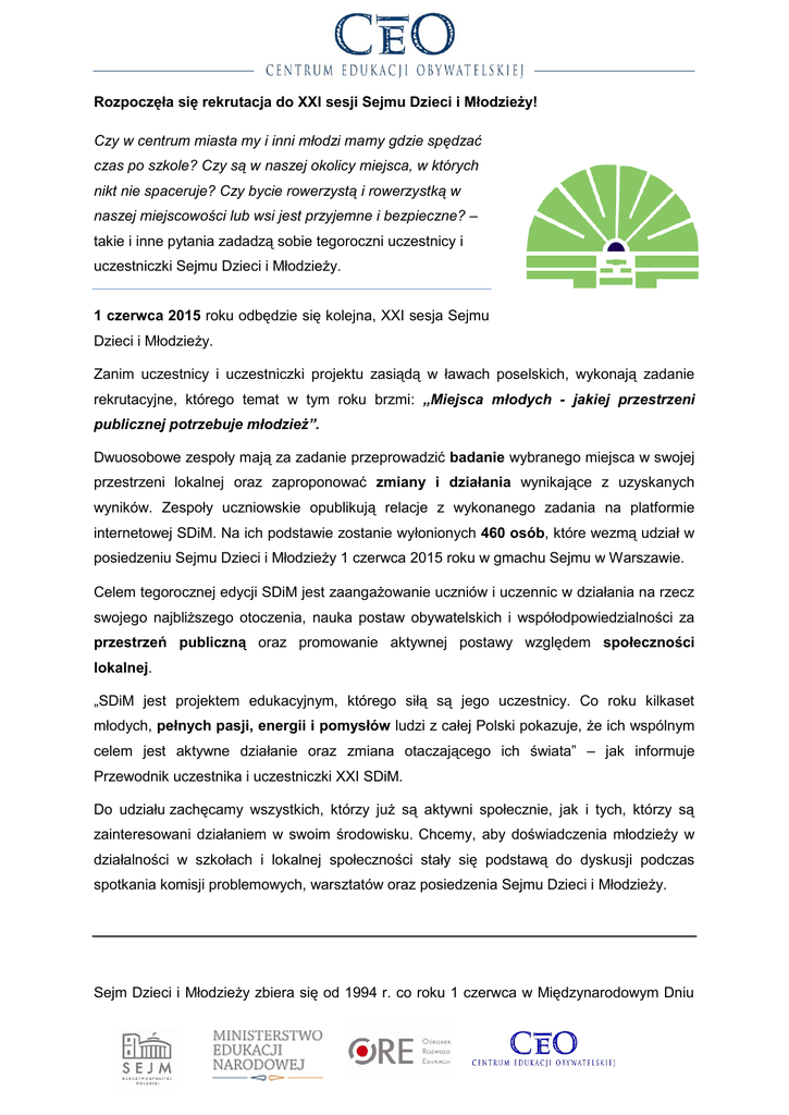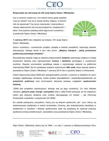 Rozpoczęła się rekrutacja do XXI sesji Sejmu Dzieci i Młodzieży! Czy w centrum miasta my i inni młodzi mamy gdzie spędzać czas po szkole? Czy są w naszej okolicy miejsca, w których nikt nie spaceruje? Czy bycie rowerzystą i rowerzystką w naszej miejscowości lub wsi jest przyjemne i bezpieczne? – takie i inne pytania zadadzą sobie tegoroczni uczestnicy i uczestniczki Sejmu Dzieci i Młodzieży. 1 czerwca 2015 roku odbędzie się kolejna, XXI sesja Sejmu Dzieci i Młodzieży. Zanim uczestnicy i uczestniczki projektu zasiądą w ławach poselskich, wykonają zadanie rekrutacyjne, którego temat w tym roku brzmi: „Miejsca młodych - jakiej przestrzeni publicznej potrzebuje młodzież”. Dwuosobowe zespoły mają za zadanie przeprowadzić badanie wybranego miejsca w swojej przestrzeni lokalnej oraz zaproponować zmiany i działania wynikające z uzyskanych wyników. Zespoły uczniowskie opublikują relacje z wykonanego zadania na platformie internetowej SDiM. Na ich podstawie zostanie wyłonionych 460 osób, które wezmą udział w posiedzeniu Sejmu Dzieci i Młodzieży 1 czerwca 2015 roku w gmachu Sejmu w Warszawie. Celem tegorocznej edycji SDiM jest zaangażowanie uczniów i uczennic w działania na rzecz swojego najbliższego otoczenia, nauka postaw obywatelskich i współodpowiedzialności za przestrzeń publiczną oraz promowanie aktywnej postawy względem społeczności lokalnej. „SDiM jest projektem edukacyjnym, którego siłą są jego uczestnicy. Co roku kilkaset młodych, pełnych pasji, energii i pomysłów ludzi z całej Polski pokazuje, że ich wspólnym celem jest aktywne działanie oraz zmiana otaczającego ich świata” – jak informuje Przewodnik uczestnika i uczestniczki XXI SDiM. Do udziału zachęcamy wszystkich, którzy już są aktywni społecznie, jak i tych, którzy są zainteresowani działaniem w swoim środowisku. Chcemy, aby doświadczenia młodzieży w działalności w szkołach i lokalnej społeczności stały się podstawą do dyskusji podczas spotkania komisji problemowych, warsztatów oraz posiedzenia Sejmu Dzieci i Młodzieży. Sejm Dzieci i Młodzieży zbiera się od 1994 r. co roku 1 czerwca w Międzynarodowym Dniu Dziecka. Posiedzenie odbywa się w gmachu Sejmu RP i kończy się ogłoszeniem wypracowanej uchwały SDiM. Do projektu mogą zgłosić się dwuosobowe zespoły uczniów i uczennic wszystkich klas gimnazjum i szkół ponadgimnazjalnych. Członkowie zespołów muszą być uczniami i uczennicami tej samej szkoły. Uczestnictwo w rekrutacji ułatwi Przewodnik uczestnika i uczestniczki dostępny pod tym linkiem: http://www.ceo.org.pl/pl/sejmmlodziezy/news/przewodnik-uczestnika-i- uczestniczki-xxi-sdim. Organizatorem XXI Sesji Sejmu Dzieci i Młodzieży jest Kancelaria Sejmu w porozumieniu z Fundacją Centrum Edukacji Obywatelskiej, Ośrodkiem Rozwoju Edukacji i Ministerstwem Edukacji Narodowej. Rejestracja zespołów odbywa się za pośrednictwem platformy internetowej SDiM: www.sdim.ceo.org.pl i trwa od 20 lutego do 7 kwietnia 2015 roku. Zapraszamy do udziału! Informacji udziela: Urszula Cyrynger, (22) 825 05 50 wew. 103, e-mail: [email protected] Przydatne linki: Platforma SDiM: www.sdim.ceo.org.pl Facebook SDiM: www.facebook.com/sejmmlodziezy Strona internetowa SDiM: www.ceo.org.pl/pl/sejmmlodziezy Poradnik uczestnika i uczestniczki XXI SDiM: http://issuu.com/fundacjaceo/docs/przewodnik_sdim