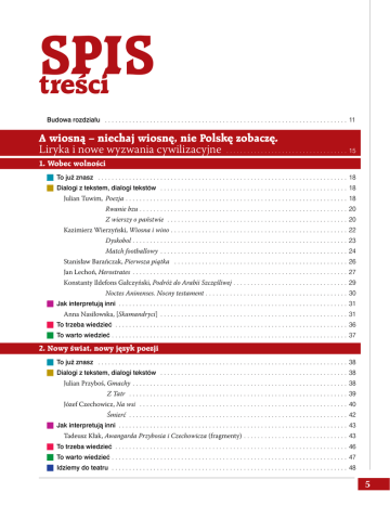 SPIS treści Budowa rozdziału . . . . . . . . . . . . . . . . . . . . . . . . . . . . . . . . . . . . . . . . . . . . . . . . . . . . . . . . . . . . . . . . . . . . . . . 11 A wiosną – niechaj wiosnę, nie Polskę zobaczę. Liryka i nowe wyzwania cywilizacyjne . . . . . . . . . . . . . . . . . . . . . . . . . . . . . . . . . . . . 15 1. Wobec wolności g To już znasz . . . . . . . . . . . . . . . . . . . . . . . . . . . . . . . . . . . . . . . . . . . . . . . . . . . . . . . . . . . . . . . . . . . . . . . . . 18 g Dialogi z tekstem, dialogi tekstów . . . . . . . . . . . . . . . . . . . . . . . . . . . . . . . . . . . . . . . . . . . . . . . . . . . . . . . 18 Julian Tuwim, Poezja . . . . . . . . . . . . . . . . . . . . . . . . . . . . . . . . . . . . . . . . . . . . . . . . . . . . . . . . . . . . . . . . . 18 Rwanie bzu. . . . . . . . . . . . . . . . . . . . . . . . . . . . . . . . . . . . . . . . . . . . . . . . . . . . . . . . . . . . . 20 Z wierszy o państwie . . . . . . . . . . . . . . . . . . . . . . . . . . . . . . . . . . . . . . . . . . . . . . . . . . . . . 20 Kazimierz Wierzyński, Wiosna i wino. . . . . . . . . . . . . . . . . . . . . . . . . . . . . . . . . . . . . . . . . . . . . . . . . . . . 22 Dyskobol. . . . . . . . . . . . . . . . . . . . . . . . . . . . . . . . . . . . . . . . . . . . . . . . . . . . . . . . . . . . . . . 23 Match footballowy . . . . . . . . . . . . . . . . . . . . . . . . . . . . . . . . . . . . . . . . . . . . . . . . . . . . . . . 24 Stanisław Barańczak, Pierwsza piątka . . . . . . . . . . . . . . . . . . . . . . . . . . . . . . . . . . . . . . . . . . . . . . . . . . . 26 Jan Lechoń, Herostrates . . . . . . . . . . . . . . . . . . . . . . . . . . . . . . . . . . . . . . . . . . . . . . . . . . . . . . . . . . . . . . . 27 Konstanty Ildefons Gałczyński, Podróż do Arabii Szczęśliwej. . . . . . . . . . . . . . . . . . . . . . . . . . . . . . . . . . 29 Noctes Aninenses. Nocny testament. . . . . . . . . . . . . . . . . . . . . . . . . . . . . . . . . . . . . . . . . . 30 g Jak interpretują inni . . . . . . . . . . . . . . . . . . . . . . . . . . . . . . . . . . . . . . . . . . . . . . . . . . . . . . . . . . . . . . . . . . . 31 Anna Nasiłowska, [Skamandryci] . . . . . . . . . . . . . . . . . . . . . . . . . . . . . . . . . . . . . . . . . . . . . . . . . . . . . . . 31 g To trzeba wiedzieć . . . . . . . . . . . . . . . . . . . . . . . . . . . . . . . . . . . . . . . . . . . . . . . . . . . . . . . . . . . . . . . . . . . . 36 g To warto wiedzieć . . . . . . . . . . . . . . . . . . . . . . . . . . . . . . . . . . . . . . . . . . . . . . . . . . . . . . . . . . . . . . . . . . . . . 37 2. Nowy świat, nowy język poezji g To już znasz . . . . . . . . . . . . . . . . . . . . . . . . . . . . . . . . . . . . . . . . . . . . . . . . . . . . . . . . . . . . . . . . . . . . . . . . . 38 g Dialogi z tekstem, dialogi tekstów . . . . . . . . . . . . . . . . . . . . . . . . . . . . . . . . . . . . . . . . . . . . . . . . . . . . . . . 38 Julian Przyboś,Gmachy . . . . . . . . . . . . . . . . . . . . . . . . . . . . . . . . . . . . . . . . . . . . . . . . . . . . . . . . . . . . . . . 38 Z Tatr . . . . . . . . . . . . . . . . . . . . . . . . . . . . . . . . . . . . . . . . . . . . . . . . . . . . . . . . . . . . . . . . 39 Józef Czechowicz, Na wsi . . . . . . . . . . . . . . . . . . . . . . . . . . . . . . . . . . . . . . . . . . . . . . . . . . . . . . . . . . . . . 40 Śmierć . . . . . . . . . . . . . . . . . . . . . . . . . . . . . . . . . . . . . . . . . . . . . . . . . . . . . . . . . . . . . . . . 42 g Jak interpretują inni . . . . . . . . . . . . . . . . . . . . . . . . . . . . . . . . . . . . . . . . . . . . . . . . . . . . . . . . . . . . . . . . . . . 43 Tadeusz Kłak, Awangarda Przybosia i Czechowicza (fragmenty) . . . . . . . . . . . . . . . . . . . . . . . . . . . . . . . 43 g To trzeba wiedzieć . . . . . . . . . . . . . . . . . . . . . . . . . . . . . . . . . . . . . . . . . . . . . . . . . . . . . . . . . . . . . . . . . . . . 46 g To warto wiedzieć . . . . . . . . . . . . . . . . . . . . . . . . . . . . . . . . . . . . . . . . . . . . . . . . . . . . . . . . . . . . . . . . . . . . . 47 g Idziemy do teatru . . . . . . . . . . . . . . . . . . . . . . . . . . . . . . . . . . . . . . . . . . . . . . . . . . . . . . . . . . . . . . . . . . . . . 48 5 Dialog z tradycją Adam Zagajewski, [Wykłady poetów o poezji] . . . . . . . . . . . . . . . . . . . . . . . . . . . . . . . . . . . . . . . . . . . . . 50 Wojciech Gryniewicz, Ławeczka Tuwima . . . . . . . . . . . . . . . . . . . . . . . . . . . . . . . . . . . . . . . . . . . . . . . . 52 Ewa Lipska, Moi tłumacze . . . . . . . . . . . . . . . . . . . . . . . . . . . . . . . . . . . . . . . . . . . . . . . . . . . . . . . . . . . . . 52 g Przemyśl na nowo . . . . . . . . . . . . . . . . . . . . . . . . . . . . . . . . . . . . . . . . . . . . . . . . . . . . . . . . . . . . . . . . . . . . 54 g Trzeba przemyśleć, trzeba zapamiętać . . . . . . . . . . . . . . . . . . . . . . . . . . . . . . . . . . . . . . . . . . . . . . . . . . . 54 Jest się takim, jak miejsce, w którym się jest. Tajemnice ludzkiej świadomości. . . . . . . . . . . . . . . . . . . . . . . . . . . . . . . . . . . . . . . . . . . . . 55 1. Powroty do przeszłości g To już znasz. . . . . . . . . . . . . . . . . . . . . . . . . . . . . . . . . . . . . . . . . . . . . . . . . . . . . . . . . . . . . . . . . . . . . . . . . . 58 g Dialogi z tekstem, dialogi tekstów. . . . . . . . . . . . . . . . . . . . . . . . . . . . . . . . . . . . . . . . . . . . . . . . . . . . . . . . 58 Jarosław Iwaszkiewicz, Panny z Wilka (fragmenty) . . . . . . . . . . . . . . . . . . . . . . . . . . . . . . . . . . . . . . . . . 58 g Jak interpretują inni . . . . . . . . . . . . . . . . . . . . . . . . . . . . . . . . . . . . . . . . . . . . . . . . . . . . . . . . . . . . . . . . . . . 60 Ryszard Przybylski, Eros i Tana