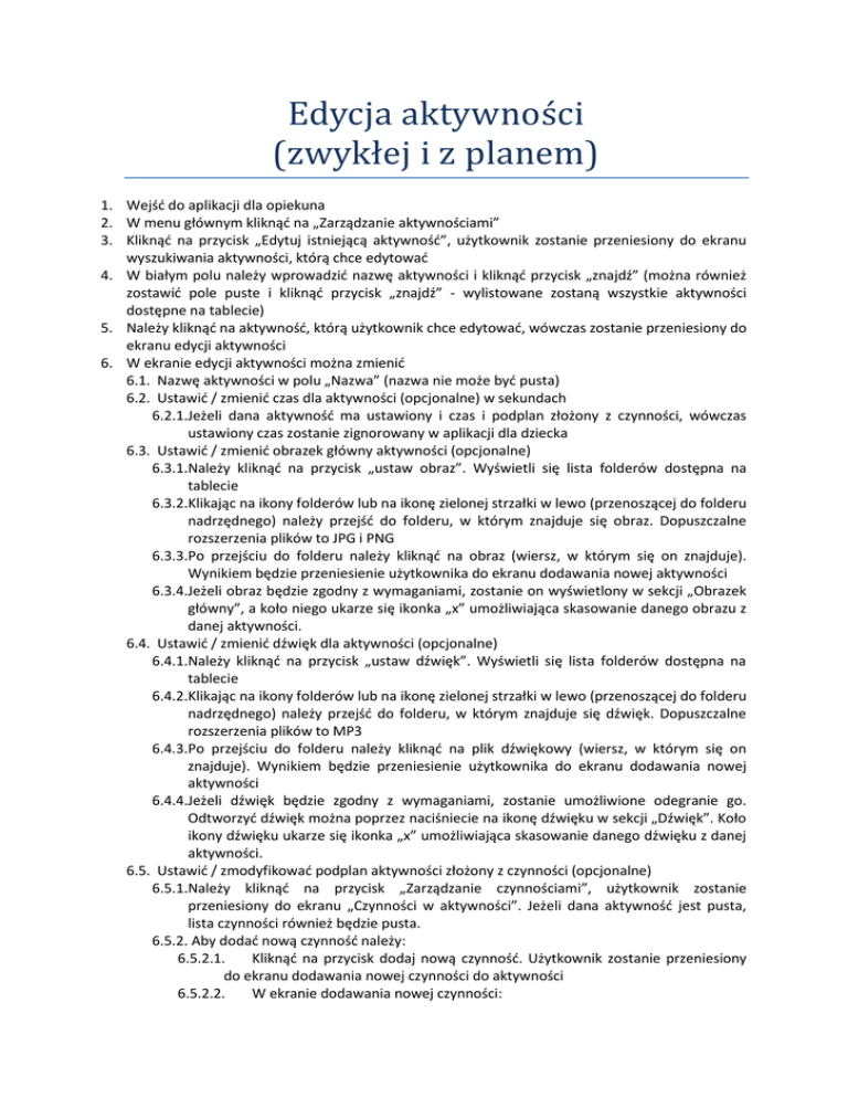 Edycja aktywności (zwykłej i z planem) 1. Wejść do aplikacji dla opiekuna 2. W menu głównym kliknąć na „Zarządzanie aktywnościami” 3. Kliknąć na przycisk „Edytuj istniejącą aktywność”, użytkownik zostanie przeniesiony do ekranu wyszukiwania aktywności, którą chce edytować 4. W białym polu należy wprowadzić nazwę aktywności i kliknąć przycisk „znajdź” (można również zostawić pole puste i kliknąć przycisk „znajdź” - wylistowane zostaną wszystkie aktywności dostępne na tablecie) 5. Należy kliknąć na aktywność, którą użytkownik chce edytować, wówczas zostanie przeniesiony do ekranu edycji aktywności 6. W ekranie edycji aktywności można zmienić 6.1. Nazwę aktywności w polu „Nazwa” (nazwa nie może być pusta) 6.2. Ustawić / zmienić czas dla aktywności (opcjonalne) w sekundach 6.2.1.Jeżeli dana aktywność ma ustawiony i czas i podplan złożony z czynności, wówczas ustawiony czas zostanie zignorowany w aplikacji dla dziecka 6.3. Ustawić / zmienić obrazek główny aktywności (opcjonalne) 6.3.1.Należy kliknąć na przycisk „ustaw obraz”. Wyświetli się lista folderów dostępna na tablecie 6.3.2.Klikając na ikony folderów lub na ikonę zielonej strzałki w lewo (przenoszącej do folderu nadrzędnego) należy przejść do folderu, w którym znajduje się obraz. Dopuszczalne rozszerzenia plików to JPG i PNG 6.3.3.Po przejściu do folderu należy kliknąć na obraz (wiersz, w którym się on znajduje). Wynikiem będzie przeniesienie użytkownika do ekranu dodawania nowej aktywności 6.3.4.Jeżeli obraz będzie zgodny z wymaganiami, zostanie on wyświetlony w sekcji „Obrazek główny”, a koło niego ukarze się ikonka „x” umożliwiająca skasowanie danego obrazu z danej aktywności. 6.4. Ustawić / zmienić dźwięk dla aktywności (opcjonalne) 6.4.1.Należy kliknąć na przycisk „ustaw dźwięk”. Wyświetli się lista folderów dostępna na tablecie 6.4.2.Klikając na ikony folderów lub na ikonę zielonej strzałki w lewo (przenoszącej do folderu nadrzędnego) należy przejść do folderu, w którym znajduje się dźwięk. Dopuszczalne rozszerzenia plików to MP3 6.4.3.Po przejściu do folderu należy kliknąć na plik dźwiękowy (wiersz, w którym się on znajduje). Wynikiem będzie przeniesienie użytkownika do ekranu dodawania nowej aktywności 6.4.4.Jeżeli dźwięk będzie zgodny z wymaganiami, zostanie umożliwione odegranie go. Odtworzyć dźwięk można poprzez naciśniecie na ikonę dźwięku w sekcji „Dźwięk”. Koło ikony dźwięku ukarze się ikonka „x” umożliwiająca skasowanie danego dźwięku z danej aktywności. 6.5. Ustawić / zmodyfikować podplan aktywności złożony z czynności (opcjonalne) 6.5.1.Należy kliknąć na przycisk „Zarządzanie czynnościami”, użytkownik zostanie przeniesiony do ekranu „Czynności w aktywności”. Jeżeli dana aktywność jest pusta, lista czynności również będzie pusta. 6.5.2. Aby dodać nową czynność należy: 6.5.2.1. Kliknąć na przycisk dodaj nową czynność. Użytkownik zostanie przeniesiony do ekranu dodawania nowej czynności do aktywności 6.5.2.2. W ekranie dodawania nowej czynności: 6.5.2.2.1. Wprowadzić nazwę czynności w polu „Nazwa” (opcjonalne) 6.5.2.2.2. Ustawić czas dla czynności w sekundach (opcjonalne) 6.5.2.2.3. Ustawić obrazek czynności (opcjonalne) 6.5.2.2.3.1. Należy kliknąć na przycisk „ustaw obraz”. Wyświetli się lista folderów dostępna na tablecie 6.5.2.2.3.2. Klikając na ikony folderów lub na ikonę zielonej strzałki w lewo (przenoszącej do folderu nadrzędnego) należy przejść do folderu, w którym znajduje się obraz. Dopuszczalne rozszerzenia plików to JPG i PNG 6.5.2.2.3.3. Po przejściu do folderu należy kliknąć na obraz (wiersz, w którym się on znajduje). Wynikiem będzie przeniesienie użytkownika do ekranu dodawania nowej czynności 6.5.2.2.3.4. Jeżeli obraz będzie zgodny z wymaganiami, zostanie on wyświetlony w sekcji „Obrazek główny”, a koło niego ukarze się ikonka „x” umożliwiająca skasowanie danego obrazu z danej czynności. 6.5.2.2.4. Ustawić dźwięk dla czynności (opcjonalne) 6.5.2.2.4.1. Należy kliknąć na przycisk „ustaw dźwięk”. Wyświetli się lista folderów dostępna na tablecie 6.5.2.2.4.2. Klikając na ikony folderów lub na ikonę zielonej strzałki w lewo (przenoszącej do folderu nadrzędnego) należy przejść do folderu, w którym znajduje się dźwięk. Dopuszczalne rozszerzenia plików to MP3 6.5.2.2.4.3. Po przejściu do folderu należy kliknąć na plik dźwiękowy (wiersz ,w którym się on znajduje). Wynikiem będzie przeniesienie użytkownika do ekranu dodawania nowej czynności 6.5.2.2.4.4. Jeżeli dźwięk będzie zgodny z wymaganiami, zostanie umożliwione odegranie go. Odtworzyć dźwięk można poprzez naciśniecie na ikonę dźwięku w sekcji „Dźwięk”. Koło ikony dźwięku ukarze się ikonka „x” umożliwiająca skasowanie danego dźwięku z danej czynności. 6.5.2.2.4.5. Po modyfikacjach należy kliknąć przycisk „zapisz” inaczej zmiany nie zostaną zapisane 6.5.3.Czynności można zamienić kolejnością używając do tego strzałek w górę i w dół 6.5.4.Czynności można usunąć używając ikony „x” 6.5.5.Czynności można edytować używając przycisku „ … ” znajdującego się przy czynności 6.5.6.Po modyfikacjach należy kliknąć przycisk „zapisz” inaczej zmiany nie zostaną zapisane 7. Po modyfikacjach należy kliknąć przycisk „zapisz” inaczej zmiany nie zostaną zapisane