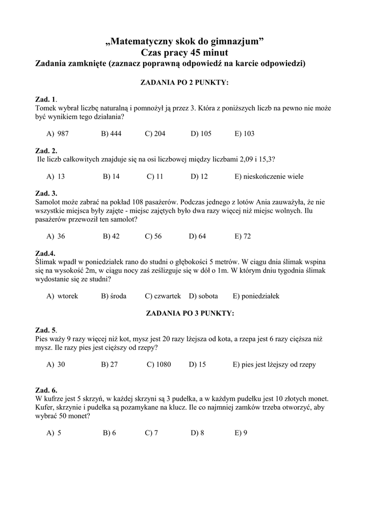 „Matematyczny skok do gimnazjum” Czas pracy 45 minut Zadania zamknięte (zaznacz poprawną odpowiedź na karcie odpowiedzi) ZADANIA PO 2 PUNKTY: Zad. 1. Tomek wybrał liczbę naturalną i pomnożył ją przez 3. Która z poniższych liczb na pewno nie może być wynikiem tego działania? A) 987 B) 444 C) 204 D) 105 E) 103 Zad. 2. Ile liczb całkowitych znajduje się na osi liczbowej między liczbami 2,09 i 15,3? A) 13 B) 14 C) 11 D) 12 E) nieskończenie wiele Zad. 3. Samolot może zabrać na pokład 108 pasażerów. Podczas jednego z lotów Ania zauważyła, że nie wszystkie miejsca były zajęte - miejsc zajętych było dwa razy więcej niż miejsc wolnych. Ilu pasażerów przewoził ten samolot? A) 36 B) 42 C) 56 D) 64 E) 72 Zad.4. Ślimak wpadł w poniedziałek rano do studni o głębokości 5 metrów. W ciągu dnia ślimak wspina się na wysokość 2m, w ciągu nocy zaś ześlizguje się w dół o 1m. W którym dniu tygodnia ślimak wydostanie się ze studni? A) wtorek B) środa C) czwartek D) sobota E) poniedziałek ZADANIA PO 3 PUNKTY: Zad. 5. Pies waży 9 razy więcej niż kot, mysz jest 20 razy lżejsza od kota, a rzepa jest 6 razy cięższa niż mysz. Ile razy pies jest cięższy od rzepy? A) 30 B) 27 C) 1080 D) 15 E) pies jest lżejszy od rzepy Zad. 6. W kufrze jest 5 skrzyń, w każdej skrzyni są 3 pudełka, a w każdym pudełku jest 10 złotych monet. Kufer, skrzynie i pudełka są pozamykane na klucz. Ile co najmniej zamków trzeba otworzyć, aby wybrać 50 monet? A) 5 B) 6 C) 7 D) 8 E) 9 Zad. 7. Największy kwadrat ma pole 16 cm2, a pole najmniejszego kwadratu jest równe 4 cm2. Pole średniego co do wielkości kwadratu jest równe? A)8 cm2 B) cm2 C) 10 cm2 D) cm2 E) 12 cm2 Zad. 8. Długość jednego z boków prostokąta zwiększono o 10 %, a długość drugiego boku zmniejszono o 10 %. Jak zmieniło się pole prostokąta? A) nie zmieniło się wzrosło o 20 % B) zmalało o 1 % C) wzrosło o 1 % E) to zależy od długości boków D) ZADANIA OTWARTE (każde zadanie proszę wykonać na oddzielnej kartce) ZADANIA PO 5 PUNKTÓW: Zad.9. W jednym z nadmorskich miast było 17 000 dzieci w wieku od 6 – 15 lat. Na wakacje wyjechało tylko 40% tej liczby. Z tego w góry pojechało 35%, na niziny zaś 25% tej liczby co w góry, reszta na Mazury. O ile więcej dzieci wyjechało na Mazury niż w góry? Zad. 10. Po zarastającej tafli jeziora można poruszać się tylko wyznaczonymi szlakami i po przeznaczonych ku temu drewnianych kładkach. Mają one szerokość 0,8m i kształt łamanej o odcinkach długości 1,5m. Ile potrzeba sztuk desek o tej długości i szerokości 0,16m, jeżeli ogólna długość szlaku ma wynosić 2km?