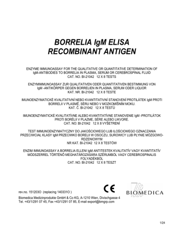 BORRELIA IgM ELISA RECOMBINANT ANTIGEN ENZYME IMMUNOASSAY FOR THE QUALITATIVE OR QUANTITATIVE DETERMINATION OF IgM-ANTIBODIES TO BORRELIA IN PLASMA, SERUM OR CEREBROSPINAL FLUID CAT. NO. BI-21042 12 X 8 TESTS ENZYMIMMUNOASSAY ZUR QUALITATIVEN ODER QUANTITATIVEN BESTIMMUNG VON IgM -ANTIKÖRPER GEGEN BORRELIEN IN PLASMA, SERUM ODER LIQUOR KAT. NR. BI-21042 12 X 8 TESTE IMUNOENZYMATICKÉ KVALITATIVNÍ NEBO KVANTITATIVNÍ STANOVENÍ PROTILÁTEK IgM PROTI BORRELII V PLASMĚ, SÉRU NEBO V MOZKOMÍŠNÍM MOKU. KAT. Č. BI-21042 12 X 8 TESTŮ IMUNOENZYMATICKÉ KVALITATÍVNE ALEBO KVANTITATÍVNE STANOVENIE IgM -PROTILÁTOK PROTI BORÉLII V PLAZME, SÉRE ALEBO LIKVORE. CAT. NO: BI-21042 12 X 8 VYŠETRENÍ TEST IMMUNOENZYMATYCZNY DO JAKOŚCIOWEGO LUB ILOŚCIOWEGO OZNACZANIA PRZECIWCIAŁ KLASY IgM PRZECIWKO BORELII W OSOCZU, SUROWICY LUB PŁYNIE MÓZGOWORDZENIOWYM NR KAT. BI-21042 12 X 8 TESTÓW ENZIM IMMUNOASSAY A BORRELIA ELLENI IgM ANTITESTEK KVALITATÍV VAGY KVANTITATÍV MÓDSZERREL TÖRTÉNŐ MEGHATÁROZÁSÁRA SZÉRUMBÓL VAGY CEREBROSPINALIS FOLYADÉKBÓL CAT. NO. BI-21042 12 X 8 TESZT rev.no. 151203O (replacing 140331O ) Biomedica Medizinprodukte GmbH & Co KG, A-1210 Wien, Divischgasse 4 Tel. +43/1/291 07 45, Fax +43/1/291 07 85, E-mail [email protected] 1/24 CONTENT / INHALT / OBSAH / OBSAH / SPIS TREŚCI / TARTALOM 1) 2) 3) 4) 5) 6) ENGLISH ............ 3 DEUTSCH ........... 7 ČESKY ................ 11 SLOVENSKY........ 15 POLSKI …………. 19 MAGYAR ……….. 23 Additional Information about our products is available on our website. Zusätzliche Information zu unseren Produkten ist auf unserer Homepage erhältlich. Další informace o našem sortimentu jsou na stránkách. Doplňujúce informácie o našich výrobkoch môžete získať na našej internetovej stránke. Dodatkowe informacje o naszych produktach są dostępne na naszej stronie internetowej. További információ termékeinkről internetes oldalunkon található. www.bmgrp.com 2/24 1) INTRODUCTION Lyme borreliosis is a bacterial infection caused by the spirochaete Borrelia Burgdorferi sensu stricto, Afzellii or Garinii, and is characterised by a variety of clinical symptoms. It can be divided into 3 stages: Stage 1, early dermatitis, Clinical: erythema migrans. Stage 2, early disseminated infection, Clinical: lymphocytic meningoradiculitis (Bannwarth's syndrome), neuroborreliosis. Stage 3, late disseminated infection, Clinical: chronic progressive encephalomyelitis, acrodermatitis chronica atrophicans (ACA), chronic arthritis. To improve the diagnostic specifity, the Biomedica microwell strips are coated with the following recombinant antigens: • p21 = OspC (outer surface protein C): B. afzellii (pKo) • p21 = OspC (outer surface protein C): B. garinii (20047) • p41/I = (inner part of flagellin): B. bavariensis (pBi) • VIsE: fusion proteins of different Borrelia genospecies 2) CONTENTS OF THE KIT All reagents except the wash buffer are ready for use. Store all reagents at 2-8°C. CONT PLATE STD CONJ DIL SUB WASHBUF STOP KIT COMPONENTS Microwell strips, breakable, colour coded, coated with recombinant antigen Standards: positive (pos), cut-off (c.o.), negative (neg), ready to use Conjugate: rabbit anti human IgM HRPO, ready to use Sample diluent with green dye, ready to use Substrate: TMB substrate solution, ready to use Wash buffer: 20x concentrated Stop solution: sulphuric acid, ready to use QUANTITY 12 x 8 strips Each 1 x 1.5 ml 1 x 14 ml 1 x 105 ml 1 x 13 ml 1 x 50 ml 1 x 10 ml 3) ADDITIONAL MATERIAL ADDED TO THE KIT • 2 self-adhesive plastic films • Quality control sheet • Protocol sheet • Instruction manual for use 4) EQUIPMENT REQUIRED BUT NOT SUPPLIED • Precision pipettes calibrated to deliver 10-1000 µl and disposable tips • Multichannel pipette • ELISA reader for absorbance at 450 nm (or from 450 nm to 630 nm) • Graph paper or software for calculation of results • Plate washer is recommended for washing 5) REAGENTS AND SAMPLE PREPARATION Conjugate: The conjugate is ready for use and should be used within 2 weeks after opening. For long term storage please aliquot and freeze at -20°C unused conjugate. Frozen aliquots are stable until expiry date stated on the original vial. Preparation WASHBUF (Wash buffer): Dilute 20x conc. wash buffer with distilled water to 1000 ml (50 ml conc. + 950 ml dist. water). Mix well. Crystals that may appear will dissolve at room temperature. Undiluted WASHBUF is stable 2-8°C until expiry date stated on the label. The diluted wash buffer is stable at 2-8°C for one month. Sample dilution: Dilute human serum or plasma 1:101 (1 + 100) with sample diluent (e.g. 10 µl of sample + 1 ml of sample diluent), mix well Dilute cerebrospinal fluid 1:2 (1 + 1) with sample diluent (e.g. 100 µl of sample + 100 µl of sample diluent), mix well. For samples with results >30 BBU/ml the samples can be diluted with sample dilution buffer and retested. Obtained results need to be multiplied with respective dilution factor for final concentration. STD: standards (pos, cut-off, neg) are ready to use and MUST NOT be diluted. 3/24 6) PRINCIPLE OF THE ASSAY 7) ASSAY PROTOCOL All reagents and samples must be at room temperature (18-26°C) before use in the assay. Mark position for BLANK/STD/SAMPLE/ (Blank/Standard/Sample) on the protocol sheet. Take microtiter strips out of the alu bag, take a minimum of one well as Blank. Store unused strips with desiccant at 2-8°C in the alu bag. Strips are stable until expiry date stated on the label. 1. Add 100 µl STD/SAMPLE (Standards/diluted samples) into the respective wells, except blank. 2. Cover strips with plastic film and incubate for 1 hour at 37°C in an incubator. 3. Aspirate and wash wells 4x with at least 250 µl diluted WASHBUF (Wash buffer). Remove remaining WASHBUF by hitting plate against paper towel after the latest wash. 4. Add 100 µl CONJ (anti human IgM-HRPO) into each well. 5. Cover strips with plastic film and incubat