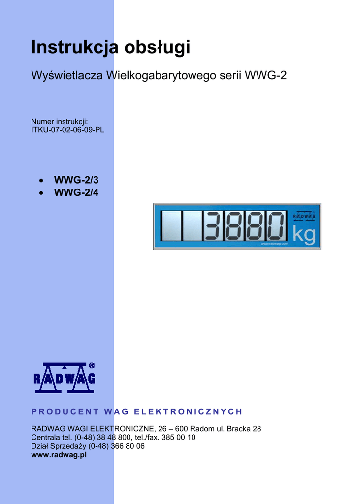 Instrukcja obsługi Wyświetlacza Wielkogabarytowego serii WWG-2 Numer instrukcji: ITKU-07-02-06-09-PL • • WWG-2/3 WWG-2/4 PRODUCENT WAG ELEKTRONICZNYCH RADWAG WAGI ELEKTRONICZNE, 26 – 600 Radom ul. Bracka 28 Centrala tel. (0-48) 38 48 800, tel./fax. 385 00 10 Dział Sprzedaży (0-48) 366 80 06 www.radwag.pl CZERWIEC 2009 -2- 1. PRZEZNACZENIE Wyświetlacz wielkogabarytowy WWG-2 zbudowany jest z sześciu podświetlanych segmentów LCD o wysokości cyfry 4,5 cala (11,2cm). Wyświetlacz LCD znajduje się w obudowie ze stali nierdzewnej. Wyposażony w uchwyt służący do postawienia wyświetlacza na stole, lub zawieszenia go na ścianie. Komunikacja z miernikiem wagowym odbywa się za pośrednictwem interfejsu RS232. Wersja wykonania WWG-2/3 przeznaczona jest do pracy z miernikiem wagowym PUE C/31H. Wersja wykonania WWG-2/4 przeznaczona jest do pracy z miernikiem wagowym PUE C41H oraz terminalem wagowym PUE 5. Wyświetlacz posiada podświetlenie diodowe białe. Wyświetlacz zasilany jest napięciem 230VAC. Służy do wyświetlania masy z wagi przemysłowej w trudnych warunkach środowiskowych przy silnym oświetleniu zewnętrznym (także słonecznym), w dużej odległości od terminala. 2. DANE TECHNICZNE WWG-2/3 WWG-2/4 Obudowa Nierdzewna Wielkość cyfr Przeznaczony do miernika 4,5” (11,2cm) PUE C/31H PUE C41H, PUE 5 Komunikacja RS232 Sposób podłączenia złącze Długość przewodu sygnałowego 3m (opcjonalnie max 10m) Zasilanie 230VAC Stopień ochrony IP66/67 Temperatura pracy od -20°C do +40°C Wymiary (bez uchwytu) 635x195x48 Masa (netto) 5,5kg -3- 3. WYMIARY 4. SPOSÓB MOCOWANIA 5. URUCHOMIENIE Wyświetlacz w zależności od rodzaju okablowania należy podłączyć do portu RS232 w mierniku wagowym PUE C/31H lub PUE C41H, PUE 5. Następnie podłączyć do sieci zasilającej. W chwili poprawnej komunikacji z wagą zostanie podświetlone tło wyświetlacza oraz zostanie wyświetlona masa. Uwaga: Aby miernik wagowy poprawnie współpracował z wyświetlaczem, należy ustawić w nim parametry zgodnie z punktem 6. -4- 6. USTAWIENIE PARAMETRÓW Parametry PUE C/31H: Rodzaj wydruku Prędkość transmisji Parametry transmisji Numer i nazwa parametru 2.1. Pr_n 2.3. bAud 2.4. S_rS Wartość parametru CntA 2400 - 38400 8d1SnP Parametry PUE C41H: Port wysyłania danych Typ wyświetlacza dod. Prędkość transmisji Parametry transmisji Numer i nazwa parametru P 3.5.1 PORT WYS. D. P 3.5.2 TYP WYS. D. P 2.2-3.1 PREDK. TRAN. P 2.2.2 BITY DANE P 2.2.3 BIT PARZ. P 2.2.4 BITY STOPU Wartość parametru RS232(1) – RS232(2) WWG 2400 - 38400 8 BRAK 1 7. WSPÓŁPRACA Z MIERNIKIEM WAGOWYM Opis pinów RS232 w płytce wyświetlacza wielkogabarytowego WWG-2: -5- Schemat przewodu łączącego PUE C/31H z portem RS232 wyświetlacza wielkogabarytowego WWG-2/3: Schemat przewodu łączącego PUE C41H, PUE 5 z portem RS232 wyświetlacza wielkogabarytowego WWG-2/4: -6- 8. PROTOKÓŁ KOMUNIKACJI Wyświetlacz obsługuje ramkę komunikacyjna wysyłaną w postaci transmisji ciągłej. Format ramki obsługiwanej przez wyświetlacz. 1 2 3 4 5 6 7-15 16 S I spacja znak stabilności spacja znak masa spacja Znak stabilności Znak Masa Jednostka Rozkaz 17 18 19 jednostka 20 21 CR LF [spacja] jeżeli wynik jest stabilny [?] jeżeli wynik jest niestabilny [^] jeżeli wystąpi błąd przekroczenia zakresu na + [v] jeżeli wystąpi błąd przekroczenia zakresu na [spacja] dla wartości dodatnich [-] dla wartości ujemnych 9 znaków z kropką z wyrównaniem do prawej 3 znaki z wyrównaniem do lewej 3 znaki z wyrównaniem do lewej -7- PRODUCENT WAG ELEKTRONICZNYCH RADWAG WAGI ELEKTRONICZNE 26-600 Radom, ul. Bracka 28 Centrala tel. +48 48 38 48 800, tel./fax. + 48 48 385 00 10 Dział Sprzedaży + 48 48 366 80 06 www.radwag.pl -8-