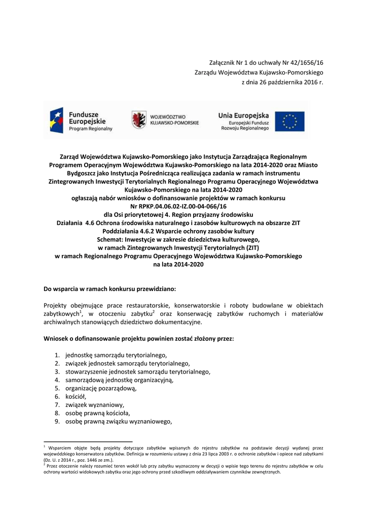 Załącznik Nr 1 do uchwały Nr 42/1656/16 Zarządu Województwa Kujawsko-Pomorskiego z dnia 26 października 2016 r. Zarząd Województwa Kujawsko-Pomorskiego jako Instytucja Zarządzająca Regionalnym Programem Operacyjnym Województwa Kujawsko-Pomorskiego na lata 2014-2020 oraz Miasto Bydgoszcz jako Instytucja Pośrednicząca realizująca zadania w ramach instrumentu Zintegrowanych Inwestycji Terytorialnych Regionalnego Programu Operacyjnego Województwa Kujawsko-Pomorskiego na lata 2014-2020 ogłaszają nabór wniosków o dofinansowanie projektów w ramach konkursu Nr RPKP.04.06.02-IZ.00-04-066/16 dla Osi priorytetowej 4. Region przyjazny środowisku Działania 4.6 Ochrona środowiska naturalnego i zasobów kulturowych na obszarze ZIT Poddziałania 4.6.2 Wsparcie ochrony zasobów kultury Schemat: Inwestycje w zakresie dziedzictwa kulturowego, w ramach Zintegrowanych Inwestycji Terytorialnych (ZIT) w ramach Regionalnego Programu Operacyjnego Województwa Kujawsko-Pomorskiego na lata 2014-2020 Do wsparcia w ramach konkursu przewidziano: Projekty obejmujące prace restauratorskie, konserwatorskie i roboty budowlane w obiektach zabytkowych1, w otoczeniu zabytku2 oraz konserwację zabytków ruchomych i materiałów archiwalnych stanowiących dziedzictwo dokumentacyjne. Wniosek o dofinansowanie projektu powinien zostać złożony przez: 1. 2. 3. 4. 5. 6. 7. 8. 9. jednostkę samorządu terytorialnego, związek jednostek samorządu terytorialnego, stowarzyszenie jednostek samorządu terytorialnego, samorządową jednostkę organizacyjną, organizację pozarządową, kościół, związek wyznaniowy, osobę prawną kościoła, osobę prawną związku wyznaniowego, 1 Wsparciem objęte będą projekty dotyczące zabytków wpisanych do rejestru zabytków na podstawie decyzji wydanej przez wojewódzkiego konserwatora zabytków. Definicja w rozumieniu ustawy z dnia 23 lipca 2003 r. o ochronie zabytków i opiece nad zabytkami (Dz. U. z 2014 r., poz. 1446 ze zm.). 2 Przez otoczenie należy rozumieć teren wokół lub przy zabytku wyznaczony w decyzji o wpisie tego terenu do rejestru zabytków w celu ochrony wartości widokowych zabytku oraz jego ochrony przed szkodliwym oddziaływaniem czynników zewnętrznych. 10. partnera prywatnego we współpracy z podmiotami publicznymi w przypadku projektów realizowanych w formule partnerstwa publiczno-prywatnego, 11. inny podmiot posiadający osobowość prawną, 12. państwową jednostkę organizacyjną, 13. organ władzy, administracji rządowej, 14. przedsiębiorstwo. Instytucja Zarządzająca RPO oraz Instytucja Pośrednicząca realizująca zadania w ramach instrumentu Zintegrowanych Inwestycji Terytorialnych Regionalnego Programu Operacyjnego Województwa Kujawsko-Pomorskiego na lata 2014-2020 dokonają oceny i wyboru projektów w oparciu o Kryteria wyboru projektów zatwierdzone uchwałą Komitetu Monitorującego Regionalny Program Operacyjny Województwa Kujawsko-Pomorskiego na lata 2014-2020 stanowiące załącznik nr 5 do Regulaminu konkursu. Wielkość środków przeznaczonych na konkurs wynosi 2 153 250,00 zł pochodzących z Europejskiego Funduszu Rozwoju Regionalnego (dalej: EFRR). Maksymalny poziom dofinansowania ze środków EFRR wynosi 85 % wydatków kwalifikowanych na poziomie projektu, w przypadku projektów nie objętych pomocą publiczną. W przypadku projektów objętych pomocą publiczną poziom dofinansowania ze środków EFRR powinien zostać ustalony zgodnie z wymogami właściwych programów pomocowych wskazanych w rozdziale 2 pkt 3 Regulaminu konkursu, jednak nie więcej niż 85 % wydatków kwalifikowalnych. Maksymalna wartość dofinansowania obiektu zabytkowego stanowi nie więcej niż 100 000,00 zł. Konkurs ma charakter zamknięty z etapem preselekcji. Wnioski preselekcyjne należy składać od 6.12.2016 r. do 19.12.2016 r. W przypadku uzyskania pozytywnej oceny na etapie preselekcji wnioskodawca zostanie wezwany w piśmie przez Instytucję Organizującą Konkurs do złożenia właściwego wniosku o dofinansowanie projektu w terminie od 29.05.2017 r. do 28.06.2017 r. Planowany termin rozstrzygnięcia konkursu to listopad 2017 r. Wnioski preselekcyjne należy złożyć z zastosowaniem wzoru wniosku preselekcyjnego stanowiącego załącznik nr 1p do Regulaminu. Wniosek preselekcyjny wraz z pismem przewodnim i załącznikami (jeśli dotyczą) należy złożyć do Biura ZIT BTOF w Bydgoszczy w terminie naboru, w 2 egzemplarzach w wersji papierowej oraz 1 egzemplarz w formie elektronicznej (płyta CD/DVD), zgodnie z zapisami rozdziału 4 Regulaminu konkursu. Miejscem składania wniosków preselekcyjnych jest Biuro ZIT BTOF w Bydgoszczy, ul. Jagiellońska 61, 85-027 Bydgoszcz. Wniosek preselekcyjny należy złożyć w godzinach pracy Biura ZIT BTOF w Bydgoszczy: od poniedziałku do piątku: w poniedziałki, środy i czwartki od 8.00 do 16.00, we wtorki od 8.00 do 18.00, w piątki od 8.00 do 14.00. Wniosek preselekcyjny może być dostarczony: - osobiście lub przez posłańca - decyduje data wpływu do Biura ZIT BTOF w Bydgoszczy; - poprzez nadanie w polskiej placówce pocztowej – decyduje data wpływu do Biura ZIT BTOF w Bydgoszczy. Właściwy formularz wniosku o dofinansowanie projektu należy w pierwszej kolejności wypełnić i wysłać w Generatorze Wniosków o Dofinansowanie dla RPO WK-P 2014-2020 (dalej: GWD)3. Następnie należy wydrukować i złożyć ostateczną wersję formularza wniosku o dofinansowanie projektu wraz z załącznikami i pismem przewodnim w Urzędzie Marszałkowskim Województwa Kujawsko-Pomorskiego, w terminie wskazanym w piśmie Instytucji Organizującej Konkurs, tj. od 29.05.2017 r. do 28.06.2017 r. Dokumentację projektową należy złożyć w 2 egzemplarzach, zgodnie z zapisami rozdziału 4 Regulaminu konkursu. Wnioski o dofinansowanie projektu złożone wyłącznie w GWD lub bez wykorzystania GWD nie będą traktowane jako złożone w odpowiedzi na konkurs, tym samym nie będą podlegały ocenie. Mie