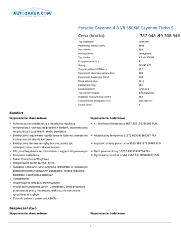 Porsche Cayenne 4.8 V8 550KM Cayenne Turbo S Cena (brutto): 787 048 .19 zł 308 949 Typ nadwozia terenowy Pojemność silnika (ccm) 4806 Moc silnika 550 Rodzaj paliwa benzynowy Typ silnika 4.8 V8 550KM Przyspieszenie (s.) 4 Opony 265/45 R21 Zużycie paliwa (l/100km.) 11.5 Pojemność zbiornika paliwa (litry) 100 Pojemność bagażnika (litry) 670 Masa własna (kg.) 2215 Ładowność (kg.) 665 Klasa/segment terenowe Typ skrzyni biegów automatyczna Prędkość maksymalna (km/h) 283 Częstotliwość przeglądu (km.) Brak danych Liczba drzwi 5 Komfort Wyposażenie standardowe Wyposażenie dodatkowe ✓ Automatyczna klimatyzacja z niezależną regulacją ✕ 4 - strefowa klimatyzacja 4687.856155395508 PLN temperatury i nawiewu na przednich siedzeń, automatyczną recyrkulacją z czujnikiem jakości powietrza ✓ Elektrycznie regulowane i podgrzewane lusterka zewnętrzne ✕ Adaptacyjny tempomat 11872.695393562317 PLN a sferyczne po stronie kierowcy ✓ Elektrycznie sterowane szyby boczne, przód/ tył, ✕ Asystent zmiany pasa ruchu 3533.384117126465 PLN zabezpieczenie przed zakleszczeniem ✓ Filtr przeciwpyłkowy ze zbiornikiem z węglem aktywowanym ✕ Dach panoramiczny 10237.19333934784 PLN ✓ Komputer pokładowy ✕ Ogrzewana przednia szyba 2566.951085090637 PLN ✓ Pakiet Oświetlenia Wnętrza\n ✓ Podgrzewane fotele (przód i tył)\n ✓ Składane i dzielone tylne siedzenia (40/20/40) ze składanym podłokietnikiem z uchwytem donapojów, ręczna regulacja odległości i pochylenia oparcia\n ✓ Tempomat\n ✓ Wspomaganie układu kierowniczego\n ✓ Wycieraczki przedniej szyby - 2 prędkości, programowanie przerywacza pracy i interwału, elektrycznie sterowane spryskiwacze szyby\n ✓ Zbiornik paliwa o pojemności 100l\n Bezpieczeństwo Wyposażenie standardowe Wyposażenie dodatkowe 1 ✓ 3 - punktowe automatyczne pasy bezpieczeństwa przód/ tył, ✕ Boczne poduszki powietrzne dla tyłu samochodu zamki pasów zintegrowane z przednimi fotelami, regulacja 2217.1110734939575 PLN wysokości mocowania pasów bezpieczeństwa z przodu ✓ Aktywne zagłówki foteli ✕ Gaśnica 804.6320266723633 PLN ✓ Czujnik dachowania pozwalający na szybsze uruchomienie kurtyn powietrznych i napinaczypasów bezpieczeństwa\n ✓ Elektryczny hamulec pomocniczy\n ✓ Porsche Traction Management (PTM): aktywny napęd czterech kół z elektronicznie sterowanym sprzęgłem wielotarczowym oraz ABD i ASR\n ✓ System mocowania fotelika dziecięcego ISOFIX\n ✓ Układ stabilizacji pojazdu Porsche Stability Management (PSM) z ABS, ASR, ABD, MSRi systemem stabilizacji zestawu z przyczepą\n Dodatki Wyposażenie standardowe Wyposażenie dodatkowe ✓ 21" koła 911 Turbo II malowane na czarno ✕ 19" pompowane koło awaryjne 1412.4790468215942 PLN ✓ 4-tłoczkowe aluminiowe stałe zaciski monobloc z tyłu, ✕ 20" pompowane koło awaryjne 2055.310068130493 PLN wewnętrznie wentylowane tarczehamulcowe ✓ 6-tłoczkowe aluminiowe stałe zaciski monobloc z przodu, ✕ 21" koła Cayenne SportEdition malowane na czarno, z wewnętrznie wentylowane tarczehamulcowe ✓ ABS - system zapobiegający blokadzie kół podczas elementami poszerzającymibłotniki 21633.23171710968 PLN ✕ 21" koła Cayenne SportEdition w kolorze nadwozia z hamowania ✓ Adaptacyjne fotele sportowe z pakietem komfortowej elementami poszerzającymibłotniki 20351.94267463684 PLN ✕ 6-płytowa zmieniarka CD lub 6-płytowa zmieniarka CD/DVD pamięci ustawień 2824.9580936431885 PLN ✓ Aluminiowe głowice cylindrów ✕ Aktywne zawieszenie PASM (Porsche Active Suspension ✓ Aluminiowy blok silnika i głowice cylindrów ✕ Aluminiowe osłony progowe 1858.5250616073608 PLN Management) 8348.057276725769 PLN ✓ Analogowe wskaźniki obrotów, prędkości, temperatury płynu ✕ Automatycznie podnoszona tylna klapa 3533.384117126465 chłodzącego i poziomu paliwa ✓ Asystent parkowania z akustycznym i optycznym PLN ✕ Cyfrowe radio (DAB, DAB+, DMB) 2566.951085090637 PLN wskazaniem odległości ✓ Asystent świateł ✕ Czarne elementy zewnętrznego wykończenia nadkoli z listwami ochronnymi drzwi 5133.902170181274 PLN ✓ Automatycznie przyciemniane lusterko wewnętrzne i ✕ Dyskretne szyby 2536.3400840759277 PLN lusterka zewnętrzne ✓ Barwione szyby, szyba czołowa z szarym klinem ✕ Dźwignia Tiptronic wykończona aluminium przeciwsłonecznym 2470.7450819015503 PLN ✓ Belki wzmacniające w drzwiach bocznych ✕ Elektroniczna książka samochodu 3109.2031030654907 PLN ✓ Bezpośredni wtrysk paliwa DFI ✕ Elektryczne rolety dla bocznych tylnych szyb 4171.842138290405 PLN ✓ Bezzwrotny układ zasilania ✕ Elektrycznie składany hak holowniczy 6546.381217002869 PLN ✓ Boczne poduszki powietrzne zintegrowane z przednimi ✕ Elektrycznie uchylany/odsuwany szklany dach fotelami ✓ Całkowicie galwanizowane nadwozie z zintegrowaną ramą 7958.860263824463 PLN ✕ Hamulce Porsche Ceramic Composite Brake (PCCB) 46992.259557724 PLN 2 ✓ Centralny zamek zdalnie sterowany ✕ HomeLink 1539.2960510253906 PLN ✓ Charakterystyczne przetłoczenia na pokrywie silnika ✕ Kamera cofania z asystentem parkowania ✓ Chłodzenie cieczą ✕ Kierownica SportDesign z łopatkami zmiany biegów, obręcz ✓ Cyfrowe wskazanie ciśnienia doładowania na kolorowym ✕ Kolor specjalny 12839.128425598145 PLN 3533.384117126465 PLN wykończona Alcantarą 647.2040214538574 PLN wyświetlaczu TFT dla Cayenne Turboi Turbo S ✓ Czarne pasy bezpieczeństwa ✕ Kolorowe emblematy Porsche w piastach kół 870.2270288467407 PLN ✓ Czarne tarcze zegarów z logo „Turbo S" ✕ Laminowane szyby termoizolacyjne 6611.976219177246 ✓ Czerwone zaciski hamulcowe (malowane) ✕ Marszczenie PLN skóry siedzeń 1963.4770650863647 PLN ✓ Cztery zawory na cylinder ✕ Mocowanie ISOFIX dla montażu fotelika dziecięcego na przednim fotelu pasażera 966.4330320358276 PLN ✓ Czujnik zapięcia pasów dla przednich siedzeń ✕ Moduł telefoniczny 4233.064140319824 PLN ✓ Czworo dr