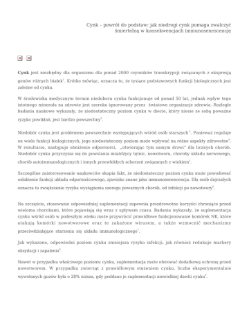 Cynk – powrót do podstaw: jak niedrogi cynk pomaga zwalczyć śmiertelną w konsekwencjach immunosenescencję Cynk jest niezbędny dla organizmu dla ponad 2000 czynników transkrypcji związanych z ekspresją 1 genów różnych białek . Krótko mówiąc, oznacza to, że tysiące podstawowych funkcji biologicznych jest zależne od cynku. W środowisku medycznym termin niedoboru cynku funkcjonuje od ponad 50 lat, jednak wpływ tego istotnego minerału na zdrowie jest szeroko ignorowany przez światowe organizacje zdrowia. Rozległe badania naukowe wykazały, że niedostateczny poziom cynku w diecie, który niesie ze sobą poważne ryzyko powikłań, jest bardzo powszechny2. Niedobór cynku jest problemem powszechnie występujących wśród osób starszych 3. Ponieważ reguluje 4 on wiele funkcji biologicznych, jego niedostateczny poziom może wpływać na różne aspekty zdrowotne . W rezultacie, następuje obniżenie odporności, „otwierając tym samym drzwi” dla licznych chorób. Niedobór cynku przyczynia się do powstania miażdżycy tętnic, nowotworu, choroby układu nerwowego, chorób autoimmunologicznych i innych przewlekłych schorzeń związanych z wiekiem5. Szczególne zainteresowanie naukowców skupia fakt, że niedostateczny poziom cynku może powodować osłabienie funkcji układu odpornościowego, zjawisko znane jako immunosenescencja. Dla osób dojrzałych oznacza to zwiększenie ryzyka wystąpienia szeregu poważnych chorób, od infekcji po nowotwory6. Na szczęście, stosowanie odpowiedniej suplementacji zapewnia prozdrowotne korzyści chroniące przed wieloma chorobami, które pojawiają się wraz z upływem czasu. Badania wykazały, że suplementacja cynku wśród osób w podeszłym wieku może przywrócić prawidłowe funkcjonowanie komórek NK, które atakują komórki nowotworowe oraz te zakażone wirusem, a także wzmocnić mechanizmy przeciwdziałające starzeniu się układu immunologicznego7. Jak wykazano, odpowiedni poziom cynku zmniejsza ryzyko infekcji, jak również redukuje markery oksydacji i zapalenia8. Nawet w przypadku właściwego poziomu cynku, suplementacja może oferować dodatkową ochronę przed nowotworem. W przypadku zwierząt z prawidłowym stężeniem cynku, liczba eksperymentalnie wywołanych guzów była o 28% niższa, gdy poddano je suplementacji niewielkiej dawki cynku9. Cynk – powrót do podstaw: jak niedrogi cynk pomaga zwalczyć śmiertelną w konsekwencjach immunosenescencję Nie ma powodu, dla którego ten łatwo dostępny i niedrogi minerał nie powinien być istotnym składnikiem programu zdrowotnego chroniącego przed niebezpieczeństwem immunosenescencji. Immunosenescencja: stopniowy zanik systemu immunologicznego Niedobór cynku jest problemem powszechnie występującym wśród osób starszych. Podobnie jak w przypadku wielu innych istotnych składników odżywczych, jego poziom zmniejsza się wraz z wiekiem10. Ale to tylko część problemu. Kolejną istotną przyczyną jest fakt, że na co dzień nie dostarczamy do organizmu tego istotnego minerału w odpowiednich ilościach. Minimalna zalecana dzienna dawka (RDA) to zaledwie 15 mg. Natomiast 35% do 45% osób w wieku powyżej 60 lat nie przyjmuje nawet połowy tej ilości11. Naukowcy uważają, że niedobór cynku odgrywa bezpośrednią rolę w procesie starzenia układu odpornościowego, znanego jako immunosenescencja12. Definiuje się ją jako stan w którym następuje spadek komórek układu odpornościowego, które zwykle identyfikują i usuwają nieprawidłowe komórki (takie jak bakterie, komórki zakażone wirusem i komórki nowotworowe)13. To czyni osoby starsze coraz bardziej podatnymi na infekcje i nowotwory, a także zmniejsza skuteczność szczepionek14. Immunosenescencja zwiększa również częstotliwość i nasilenie przebiegu chorób autoimmunologicznych (takich jak reumatoidalne zapalenie stawów i toczeń rumieniowaty), w których to układ odpornościowy 15 atakuje i niszczy zdrowe tkanki . Ponadto prowadzi do utraty kontroli regulacyjnej, co nasila problem stanów zapalnych w organizmie, prowadząc do miażdżycy tętnic, osteoporozy, a następnie podniesienia ryzyka nowotworu16. Zwalcz immunosenescencję z cynkiem Immunosenescencja to bardzo złożony proces, który wciąż jest badany przez naukowców. Jednak to, co wiemy na tę chwilę, to fakt, że system odpornościowy osób starszych jest wynikiem ciągłego procesu przebudowy17. Co oznacza, że zwalczanie tego aspektu starzenia staje się możliwe, a cynk okazuje się być w tym niezbędnym składnikiem. Korelacje między immunosenescencją a niedoborem cynku są na tyle uderzające, że naukowcy uważają, że nie mogą być przypadkowe18. Cynk – powrót do podstaw: jak niedrogi cynk pomaga zwalczyć śmiertelną w konsekwencjach immunosenescencję Niedobór cynku zmniejsza aktywność grasicy, co uniemożliwia wytwarzanie niezbędnych komórek T (z ang. „killer”). Powoduje to zmianę równowagi na korzyść „komórek supresorowych”, które zmniejszają 19 odpowiedz odpornościową . Niski poziom cynku zwiększa również występowanie autoimmunizacji i nadmiernego stanu zapalnego20. Nawet poziom cynku będący na granicy odpowiedniego, może wpływać ujemnie na funkcje 21 odpornościowe i obniżyć odpowiedź na szczepienia . Mimo, że niewłaściwe stężenie tego minerału nie jest jedyną przyczyną immunosenescencji, to wydaje się, że jest jednym z głównych czynników. Oznacza to, że przywrócenie poziomu cynku do odpowiedniego stanu, pozwoli zahamować proces immunosenescencji oraz ochronić organizm przed nowotworem, infekcjami, autoimmunizacją i przewlekłym stanem zapalnym22. Jak wykazano, suplementacja cynku wśród osób w wieku podeszłym wiąże się z następującymi korzyściami zdrowotnymi: Przywrócenie prawidłowego funkcjonowania komórek NK, które usuwają komórki nowotworowe oraz te zakażone wirusem23. Zwiększenie odpowiedzi białych krwinek wśród 