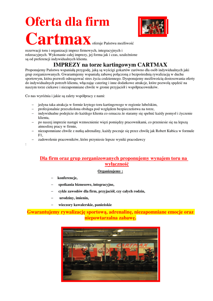 Oferta dla firm Cartmax oferuje Państwu możliwość rezerwacji toru i organizacji imprez firmowych, integracyjnych i rekreacyjnych. Wykonanie całej imprezy, jej forma jak i czas, uzależnione są od preferencji indywidualnych klienta. IMPREZY na torze kartingowym CARTMAX Proponujemy Państwu wspaniałą przygodę, jaką są wyścigi gokartów zarówno dla osób indywidualnych jaki grup zorganizowanych. Gwarantujemy wspaniałą zabawę połączoną z bezpośrednią rywalizacją w duchu sportowym, która pozwoli odreagować stres życia codziennego. Dysponujemy możliwością dostosowania oferty do indywidualnych potrzeb klienta, włączając catering i inne dodatkowe atrakcje, które pozwolą spędzić na naszym torze ciekawe i niezapomniane chwile w gronie przyjaciół i współpracowników. Co nas wyróżnia i jakie są zalety współpracy z nami: − − − − − − jedyna taka atrakcja w formie krytego toru kartingowego w regionie lubelskim, profesjonalnie przeszkolona obsługa pod względem bezpieczeństwa na torze, indywidualne podejście do każdego klienta co oznacza że staramy się spełnić każdy pomysł i życzenie klienta, po naszej imprezie nastąpi wzmocnienie więzi pomiędzy pracownikami, co przeniesie się na lepszą atmosferę pracy w firmie, niezapomniane chwile z nutką adrenaliny, każdy poczuje się przez chwilę jak Robert Kubica w formule F1, zadowolenie pracowników, które przyniesie lepsze wyniki pracodawcy : Dla firm oraz grup zorganizowanych proponujemy wynajem toru na wyłączność Organizujemy : − konferencje, − spotkania biznesowe, integracyjne, − cykle zawodów dla firm, przyjaciół, czy całych rodzin, − urodziny, imienin, − wieczory kawalerskie, panieńskie Gwarantujemy rywalizację sportową, adrenalinę, niezapomniane emocje oraz niepowtarzalna zabawę. Cennik obowiązujący na torze Cartmax OLIMP 1.WYNAJĘCIE TORU NA WYŁĄCZNOŚĆ WRAZ Z PROWADZENIEM Czas trwania Tydzień PN-CZW netto Weekend PT-SO-NDZ netto 60 min 800,00 zł 1 000,00 zł 120 min 1 600,00 zł 2 000,00 zł Cena obejmuje: - wynajem dostępnej ilości gokartów o mocy 6,5 km na czas rezerwacji, - szkolenie uczestników, - organizacja zawodów (dysponujemy profesjonalnym pomiarem czasów, wydruki) - wypożyczenie kasków ochronnych - jednorazowe czepki ochronne na głowę, -opiekę osoby prowadzącej nad przebiegeim zawodów 2. WYNAJĘCIE TORU NA WYŁĄCZNOŚĆ BEZ PROWADZENIA Czas trwania Tydzień PN-CZW netto Weekend PT-SO-NDZ netto 30 min 300,00 zł 350,00 zł 60 min 600,00 zł 700,00 zł 120 min 1 200,00 zł 1 400,00 zł Cena obejmuje: - wynajem dostępnej ilości gokartów o mocy 6,5 km na czas rezerwacji, - szkolenie uczestników, - organizacja zawodów (dysponujemy profesjonalnym pomiarem czasów, wydruki) - wypożyczenie kasków ochronnych - jednorazowe czepki ochronne na głowę, 3. WYNAJĘCIE TORU NA WYŁĄCZNOŚĆ + KARNET NA 3 PIZZE GRATIS Oferujemy Państwu możliwość skorzystania ze specjalnej oferty dla grup zorganizowanych. Jest ona skierowana jest do osób lubiących dobrą zabawę we własnym gronie. Dzięki współpracy z ekskluzywnym pubem sportowym TIFOSI otrzymają Państwo KARNET na 3 pizze. Dzięki temu, mogą Państwo przedłużyć wspaniały wieczór na torze o wizytę w TIFOSI. Będzie okazja na omówienie wrażeń, strategii oraz techniki jazdy w przy smacznej PIZZY. Oferta na torze CARTMAX Olimp obejmuje: • • 45 minut wynajęcia toru na wyłączność Vip room do dyspozycji przez 1 h • karnet na 3 pizze do wykorzystania w SPORT PUB TIFOSI lub na miejscu • ofertę można łączyć kilkakrotnie Czas trwania TYDZIEŃ PN-CZW netto WEEKEND PT-SO-ND netto 45 min 450,00 zł 400,00 zł 4. KARNET CARTMAX DLA PRACOWNIKÓW Z myślą o firmach i ich pracownikach jako pewien sposób miłego gestu szefa w stronę pracownika proponujemy Państwu wykupienie karnetu na 120 min niezapomnianych wrażeń i przeżyć na torach Cartmax. Proponujemy Państwu możliwość nabycia karnetu, który zawiera: − 12 przejazdów + 2 przejazdy GRATIS łącznie aż 2 godziny jazdy na torze ( PONAD DWIE godziny jazdy) Karnet jest bezterminowy i obowiązuje w każdy dzień tygodnia. Właściciel karnetu może swobodnie dysponować wykupionymi przejazdami. 12 przejazdów x 10 min 2 przejazdy x 10 min GRATIS Cena karnetu : 230 zł netto 5. DODATKOWE OPCJE, KTÓRE MOŻEMY PAŃSTWU ZAOFEROWAĆ Puchary dla 3 najlepszych zawodników z dowolna graweracją – 150 zł netto Dyplomy dla uczestników z dowonym napisem oraz logiem Państwa firmy 1 dyplom / 1 zł netto Catering (ciastka, paluszki, kawa, herbata itp.) - 200 zł netto Catering w formie szwedzkiego stołu – cena ustalana indywidualnie POCZĘSTUNEK PRZY STOLE SZWEDZKIM PROPOZYCJA MENU DLA 30 OSÓB g/ml Cena Ilość Wartość I przekąski koktajlowe śliwki suszone zapiekane w bekonie roladka z łososiem w cieście naleśnikowym mini szaszłyczki z kurczakiem i ananasem tarty podane w kawałkach: z grzybami leśnymi, serem feta i papryką z kurczakiem, papryką i cebulą 20 2,50 20 50,00 20 3,00 20 60,00 20 2,50 20 50,00 60 3,00 20 60,00 60 3,00 20 60,00 II mięsa: półmisek mięs pieczonych pasztet z kurczaka z orzeszkami pistacjowymi pasztet francuski w cieście z indykiem i zielonym pieprzem III ryby: delikatna terrina z dorsza z solą i szpinakiem IV sałatki: sałatka szefa (szynka, kukurydza, ser, papryka) sałatka norweska z łososiem, sos tatarski V danie gorące: ragout wieprzowe z grzybami VI dodatki: pieczywo mieszane regionalne, cebularze, marynaty 50 5,00 16 80,00 50 5,00 10 50,00 50 5,00 10 50,00 50 5,50 20 110,00 150 8,00 12 96,00 150 8,00 12 96,00 250 8,00 30 240,00 100 30 683,33 g/os. zaokrągl. - 2,00 Koszt 894,30 zł netto / 1 os 29,80 zł netto Jesteśmy w stanie dopasować menu do Państwa potrzeb. Jeżeli jesteście Państwo zainteresowani naszą ofertą lub macie szczególne wymagania co do imprezy to prosimy o kontakt Karolina Zabłotna 509-557-327 lub na adres e-mail: [email protected