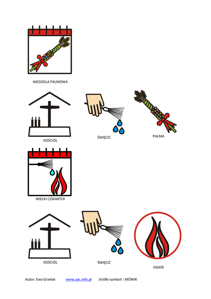NIEDZIELA PALMOWA ŚWIĘCIĆ KOŚCIÓŁ PALMA WIELKI CZWARTEK KOŚCIÓŁ ŚWIĘCIĆ OGIEŃ Autor: Ewa Grzelak www.aac.info.pl źródło symboli : MÓWIK WIELKI PIĄTEK GOLGOTA KORONA CIERNIOWA PRZYBICIE DO KRZYŻA KOŚCIÓŁ SPOWIEDŹ UKRZYŻOWANIE Autor: Ewa Grzelak www.aac.info.pl źródło symboli : MÓWIK WIELKA SOBOTA KOŚCIÓŁ KSIĄDZ ŚWIĘCIĆ ŚWIĘCONKA PISANKI ŚWIĘCONA SÓL Autor: Ewa Grzelak BARANEK WIELKANOCNY ŚWIĘCONE JAJKO www.aac.info.pl źródło symboli : MÓWIK ŚWIĘCONY CHLEB ŚWIĘCONA KIEŁBASA KRÓLICZEK WIELKANOCNY KURCZAK WIELKANOCNY WIELKANOC MODLIĆ SIĘ ZMARTWYCHWSTANIE Autor: Ewa Grzelak www.aac.info.pl KOŚCIÓŁ źródło symboli : MÓWIK PONIEDZIAŁEK WIELKANOCNY KOŚCIÓŁ MODLIĆ SIĘ OBLEWAĆ WODĄ Autor: Ewa Grzelak www.aac.info.pl źródło symboli : MÓWIK ŚMIGUS DYNGUS