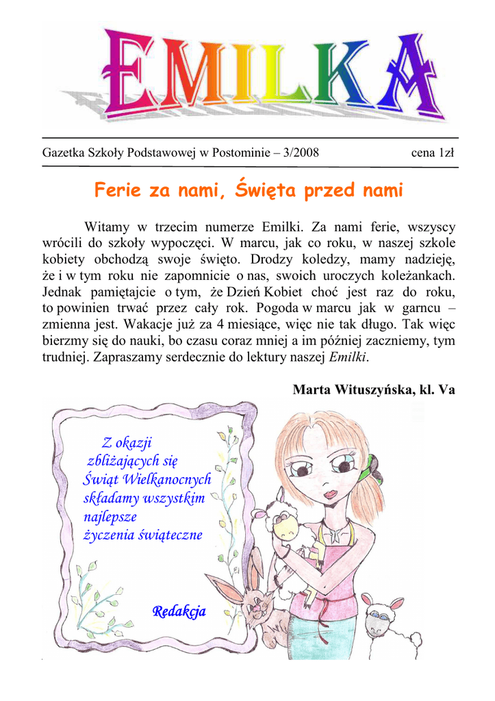 Gazetka Szkoły Podstawowej w Postominie – 3/2008 cena 1zł Ferie za nami, Święta przed nami Witamy w trzecim numerze Emilki. Za nami ferie, wszyscy wrócili do szkoły wypoczęci. W marcu, jak co roku, w naszej szkole kobiety obchodzą swoje święto. Drodzy koledzy, mamy nadzieję, Ŝe i w tym roku nie zapomnicie o nas, swoich uroczych koleŜankach. Jednak pamiętajcie o tym, Ŝe Dzień Kobiet choć jest raz do roku, to powinien trwać przez cały rok. Pogoda w marcu jak w garncu – zmienna jest. Wakacje juŜ za 4 miesiące, więc nie tak długo. Tak więc bierzmy się do nauki, bo czasu coraz mniej a im później zaczniemy, tym trudniej. Zapraszamy serdecznie do lektury naszej Emilki. Marta Wituszyńska, kl. Va Z okazji zbliŜających się Świąt Wielkanocnych składamy wszystkim najlepsze Ŝyczenia świąteczne Redakcja Z śYCIA SZKOŁY Zaczarowana Dnia 23.01.2008 w środę byliśmy w kinie Milenium w Słupsku na filmie pt „Zaczarowana”. Był to film o miłości. O pięknej dziewczynie, która miała przepiękny głos, zwierzęta były jej przyjaciółmi. Spotkała królewicza, który znany był jej ze snów. Królewicz chciał się z nią oŜenić, lecz jego zła macocha nie chciała dopuścić, aby jakaś dziewczyna odebrała jej władzę. A Ŝe była wiedźmą, zamieniła się w babcię i wrzuciła ją do studni. Dziewczyna z bajki wpadła do rzeczywistości. Za nią wskoczył królewicz oraz jego przyjaciółka wiewiórka i wysłannik złej królowej. Gdy dziewczynę znalazł pewien męŜczyzna, zabrał ją do domu. Miał ją wysłać do domu, lecz gdy zasnęła zlitował się nad nią i pozwolił jej zostać. Rankiem wstała wcześniej i ze zwierzakami posprzątała całe mieszkanie. Wzięła prysznic. A co było dalej … dowiecie się, gdy pójdziecie do kina. Aleksandra Sobczak, Marta Lińska kl. IVb Miła, sympatyczna, urokliwa, przyjemna, radosna… Określeń na tę opowieść moŜna jeszcze wymieniać wiele. Chcecie obejrzeć coś roman-tycznego - po prostu idźcie do kina! Magdalena Chylewska, kl. VIb Film bardzo mi się podobał, poniewaŜ jego akcja jest Ŝywa i ciekawa. Bardzo dobra jest gra aktorów oraz na uwagę zasługują muzyka i stroje. UwaŜam równieŜ, Ŝe ten film jest bardzo pouczający i zadowoli kaŜdego widza małego i dorosłego, dlatego polecam go kaŜdemu, kto chce się przenieść w krainę baśni i marzeń. Kamil Gąbka, kl. VIb Rumpel Śmieciarz Dzięki projektowi „Szkoła Równych Szans” wszyscy uczniowie Zespołu Szkół w Postominie bezpłatnie kilkakrotnie brali udział w całorocznym cyklu zajęć- uczestnictwo w kulturze. Jeździli do muzeum, kina i teatru, po to by „zaprzyjaźnić się” z kulturą i sztuką. Uczniowie chętnie korzystali z tych moŜliwości i bardzo cieszyli się z kaŜdego wyjazdu na kolejne przedstawienie czy teŜ projekcję filmową. Na kilka dni przed feriami zimowymi czekała na uczniów duŜa niespodzianka. W murach naszej szkoły zagościli profesjonalni aktorzy. Dnia 6 lutego w Szkole Podstawowej w Postominie odbyły się dwa przedstawienia pt.: „Rumpel Śmieciarz”, które obejrzeli uczniowie klas IV-VI i „Kozucha- Kłamczucha” dla dzieci z zerówki i klas I-III. Parę dni wcześniej i gimnazjaliści oglądali przeznaczony dla siebie spektakl zatytułowany „Pastorałka”. Przedstawienie „Rumpel Śmieciarz” opowiadało o dwóch marynarzach - Bąbelku i Rumplu. Marynarz Rumpel przebrany za staruszkę, wymuszał na mary-narzu Bąbelku (w tej roli p. Tadeusz Falana - aktor znany z takich seriali jak: „M jak miłość”, „Na Wspólnej”) Ŝeby ten zdradził tajemnicę, co teŜ takiego otrzymał od Króla Morza oraz aby wyjawił zaklęcie do otworzenia magicznej szkatułki. Przedstawienie było interaktywne, poniewaŜ na scenę proszeni byli widzowie- czyli uczniowie. Po raz kolejny przekonaliśmy się, Ŝe w naszej szkole mamy wielu otwartych na nowe wyzwania i utalentowanych młodych aktorów. Na scenę poproszono kilkoro uczniów m.in. Patrycję Ordon, Monikę Kasicę, Patrycję Zapor i Ewelinę Jóźwik (wszystkie dziewczyny z klasy Va) były one Ŝeglarzami pływającymi po morzu podczas sztormu. Dziewczyny przywoływały port Adrian- w tej roli sprawdził się Adrian Lubasiński z klasy VIa. Paweł Dybiec (kl. Va) sprawdzał czy szybko umie myśleć, biegając przy tym w miejscu. Paweł Lipiński (kl. VIa) wypowiadał zaklęcie. Grzegorz Brzyszcz (kl. IVb) rozkazywał Bąblowi, by ten jednocześnie stanął prosto, wyciągnął ręce i odłoŜył gitarę. Karol Twarowski (kl. IVb) świetnie sprawdził się w roli stojaka do mikrofonu. Justyna Majrowska (kl. Vb) i Mariusz Majrowski (kl. VIb) torturowali marynarza Bąbla gilgotkami. Poproszeni na scenę mali aktorzy byli traktowani bardzo powaŜnie przez dorosłych, profesjonalnych i doświadczonych aktorów. Rumpel i Bąbelek mówili młodzieŜowym językiem, czym od pierwszych chwil trwania spektaklu, „kupili” sobie młodą publiczność, która Ŝywo reagowała na wszystko, co działo się na naszej szkolnej scenie, szalejąc przy tym z zachwytu. Świetne aktorstwo doceniła postomińska publiczność wybuchami śmiechu i burzą krzyków, przerywając artystom kilkakrotnie. Aktorzy za swoją pracę nagrodzeni zostali gromkimi brawami. Przedstawienie było niezwykle ciekawe i interesujące. Na koniec uczniowie zrobili sobie kilka pamiątkowych zdjęć z Rumplem i Bąbelkiem. Następnie aktorzy wszystkim widzom dzielnie rozdawali autografy. Wszyscy uczniowie zgodnie stwierdzili, Ŝe chcieliby, aby częściej mury naszej szkoły przekraczali znani i zawodowi aktorzy właśnie z takimi interaktywnymi przedstawieniami. Ewelina Królikowska Kozucha Kłamczucha W tym samym dniu, kiedy klasy IV-VI obejrzały „Rumpla Śmieciarza”, aktorzy odegrali jeszcze jedno przedstawienie pt.: „Kozucha Kłamczucha” dla młodszych dzieci (zerówka i klasy I-III). Dzieci obejrzały historię KoŜuchy, która ciągle kłamała. Miała ona 