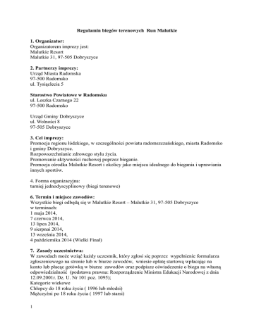 Regulamin biegów terenowych Run Malutkie 1. Organizator: Organizatorem imprezy jest: Malutkie Resort Malutkie 31, 97-505 Dobryszyce 2. Partnerzy imprezy: Urząd Miasta Radomska 97-500 Radomsko ul. Tysiąclecia 5 Starostwo Powiatowe w Radomsku ul. Leszka Czarnego 22 97-500 Radomsko Urząd Gminy Dobryszyce ul. Wolności 8 97-505 Dobryszyce 3. Cel imprezy: Promocja regionu łódzkiego, w szczególności powiatu radomszczańskiego, miasta Radomsko i gminy Dobryszyce. Rozpowszechnianie zdrowego stylu Ŝycia. Promowanie aktywności ruchowej poprzez bieganie. Promocja ośrodka Malutkie Resort i okolicy jako miejsca idealnego do biegania i uprawiania innych sportów. 4. Forma organizacyjna: turniej jednodyscyplinowy (biegi terenowe) 6. Termin i miejsce zawodów: Wszystkie biegi odbędą się w Malutkie Resort – Malutkie 31, 97-505 Dobryszyce w terminach: 1 maja 2014, 7 czerwca 2014, 13 lipca 2014, 9 sierpnai 2014, 13 września 2014, 4 października 2014 (Wielki Finał) 7. Zasady uczestnictwa: W zawodach moŜe wziąć kaŜdy uczestnik, który zgłosi się poprzez wypełnienie formularza zgłoszeniowego na stronie lub w biurze zawodów, wniesie opłatę startową wpłacając na konto lub płacąc gotówką w biurze zawodów oraz podpisze oświadczenie o biegu na własną odpowiedzialność (podstawa prawna: Rozporządzenie Ministra Edukacji Narodowej z dnia 12.09.2001r. Dz. U. Nr 101 poz. 1095); Kategorie wiekowe Chłopcy do 18 roku Ŝycia ( 1996 lub młodsi) MęŜczyźni po 18 roku Ŝycia ( 1997 lub starsi) 1 Dziewczynki do 18 roku Ŝycia ( 1996 lub młodsi) Kobiety po 18 roku Ŝycia ( 1997 lub starsi) Nordic Walking będzie klasyfikowany w dwóch kategoriach MęŜczyźni OPEN Kobiety OPEN 8. Opłata startowa: MoŜna dokonać jej na konto, które uczestnik otrzyma po uprzedniej rejestracji na stronie www lub w biurze zawodów w dniu imprezy. Opłata startowa odnotowana 3 dni przed dniem imprezy wynosi 20zł, a w dniu imprezy 25zł. Przy chęci wykupienia pakietu na wszystkie biegi udzielany jest rabat w wysokości 20% przy płatności przed pierwszą imprezą. Numerek startowy będzie przydzielany jeden na wszystkie biegi. Tytuł przelewu: Dystans, Imię i nazwisko 27 2030 0045 1170 0000 0488 6680 Malutkie Resort Malutkie 31 97-505 Dobryszyce woj.: łódzkie pow.: radomszczański 9. Trasa: Większość trasy będzie przebiegać po ścieŜkach leśny oraz w małej części po kostce brukowej lub asfalcie. Rywalizacja będzie przebiegała na trasie o długości od 8km do 10km w zaleŜności od edycji. Start, meta oraz bufet będzie na dolnym parkingu przy bramie startowej w Malutkie Resort. Trasa dla Nordic Walking będzie wynosić ok 5km. 10. Nagrody i świadczenia dla uczestników: Świadczenia dla wszystkich uczestników: - kupon na posiłek regeneracyjny - dyplom za ukończenie biegu - moŜliwość korzystania z bufetu w trakcie jak i po biegu - numerek startowy - profesjonalny pomiar czasu - moŜliwość wylosowania cennych nagród - gadŜety od sponsorów - za ukończenie biegu pamiątkowy medal Po kaŜdej edycji dla najlepszych przewidziane są: - wyjątkowe puchary za miejsca 1-3 - dyplomy za miejsca 1-3 w poszczególnych kategoriach - nagrody finansowe w poszczególnych kategoriach, tj.: Chłopcy do 18 roku Ŝycia (urodzeni w1996 r. lub młodsi) I - 200zł II - 150zł III - 50zł MęŜczyźni po 18 roku Ŝycia (urodzeni w 1997 r. lub starsi) I - 400zł 2 II - 300zł III - 200zł Dziewczynki do 18 roku Ŝycia (urodzone w 1996 r. lub młodsze) I - 200zł II - 150zł III - 50zł Kobiety po 18 roku Ŝycia (urodzone w 1997 r. lub starsze) I - 300zł II - 200zł III - 100zł Nordic Walking Kobiety Open I-III nagrody rzeczowe MęŜczyźni Open I-III nagrody rzeczowe - wśród wszystkich uczestników będą losowane cenne nagrody. 11. Klasyfikacja generalna Do klasyfikacji generalnej będzie brane pod uwagę 4 najlepszych wyników z 6 biegów. Jeśli ktoś weźmie udział w mniej niŜ 4 biegach nie będzie brany pod uwagę. Punkty w klasyfikacji generalnej będą udzielane w sposób: 1m-ce: 1pkt, 2m-ce: 2pkt., itd. Jeśli dwóch uczestników zbierze taką samą liczbę punktów wygrywa ten który w finałowej edycji zajmie lepsze miejsce. Warunkiem otrzymania nagrody w klasyfikacji generalnej jest udział i ukończenie finałowego biegu. 12. Nagrody Grand Prix (dla zwycięzców klasyfikacji generalnej): Chłopcy do 18 roku Ŝycia: I - 1000zł II - 600zł III - 200zł MęŜczyźni po 18 roku Ŝycia: I - 1500zł II - 800zł III - 400zł Dziewczynki do 18 roku Ŝycia I - 700zł II - 400zł III - 150zł Kobiety po 18 roku Ŝycia: I - 1000zł II - 600zł III- 200zł Nordic Walking Kobiety Open I-III nagrody rzeczowe MęŜczyźni Open I-III nagrody rzeczowe 13. Zabezpieczenie medyczne Na biegu będzie karetka pogotowia która pomoŜe w razie nagłych wypadków. 3 NajbliŜsze szpitale: 1. Szpital Powiatowy w Radomsku ul. Jagiellońska 36 97-500 Radomsko 2.Szpital Wojewódzki im. Jana Pawła II ul. Czapliniecka 123 97-400 Bełchatów 14. Program biegów: 8:00-11:30 zapisy 12:00 start biegu 12:05 Start Nordic Walking 14:00 dekoracja najszybszych 14:05 losowanie nagród dla wszystkich uczestników 15. Postanowienia końcowe: Zawody będą się odbywać bez względu na warunki atmosferyczne. KaŜdy uczestnik musi mieć wykupione ubezpieczenie OC. Uczestnik startuje wyłącznie na własną odpowiedzialność i ponosi związane z tym ryzyko. Wszyscy Uczestnicy przyjmują do wiadomości, Ŝe udział w Biegu wiąŜe się z wysiłkiem fizycznym i pociąga za sobą naturalne ryzyko i zagroŜenie wypadkami, moŜliwość odniesienia obraŜeń ciała i urazów fizycznych (w tym śmierci). Przekazanie Organizatorowi prawidłowo wypełnionego Formularza Rejestracyjnego oraz dokonanie Opłaty Rejestracyjnej oznacza, Ŝe Uczestnik rozwaŜył i ocenił charakter, zakres i stopień ryzyka wiąŜącego się z uczestnictwem w Biegu i dobrowolnie zdecydował się podjąć to ryzyko, startując w Biegu wyłącznie na własn