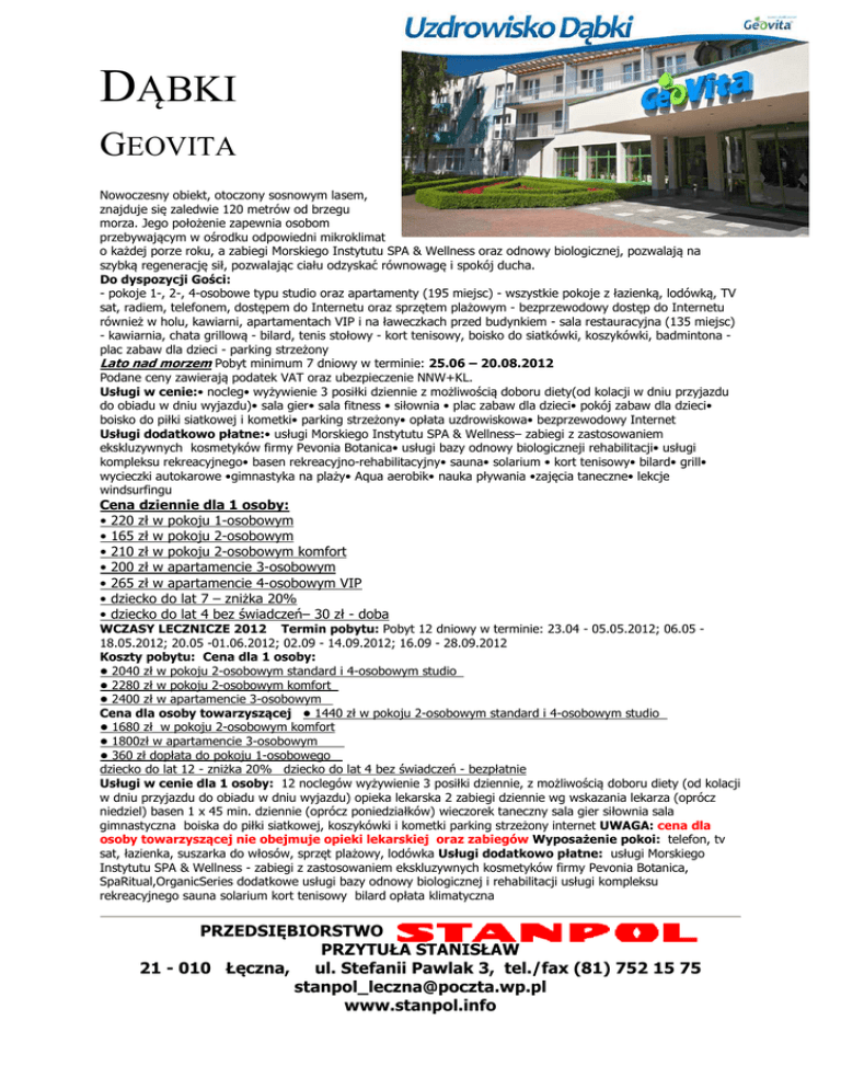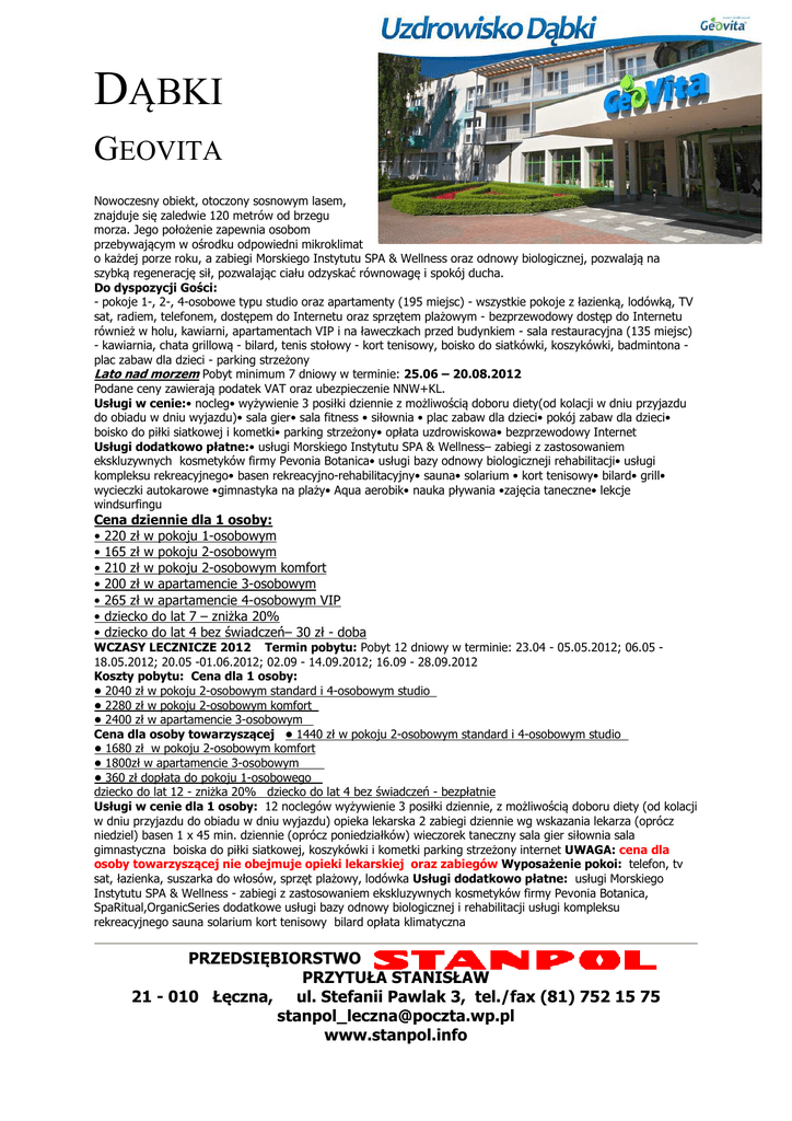 DĄBKI GEOVITA Nowoczesny obiekt, otoczony sosnowym lasem, znajduje się zaledwie 120 metrów od brzegu morza. Jego położenie zapewnia osobom przebywającym w ośrodku odpowiedni mikroklimat o każdej porze roku, a zabiegi Morskiego Instytutu SPA & Wellness oraz odnowy biologicznej, pozwalają na szybką regenerację sił, pozwalając ciału odzyskać równowagę i spokój ducha. Do dyspozycji Gości: - pokoje 1-, 2-, 4-osobowe typu studio oraz apartamenty (195 miejsc) - wszystkie pokoje z łazienką, lodówką, TV sat, radiem, telefonem, dostępem do Internetu oraz sprzętem plażowym - bezprzewodowy dostęp do Internetu również w holu, kawiarni, apartamentach VIP i na ławeczkach przed budynkiem - sala restauracyjna (135 miejsc) - kawiarnia, chata grillową - bilard, tenis stołowy - kort tenisowy, boisko do siatkówki, koszykówki, badmintona plac zabaw dla dzieci - parking strzeżony Lato nad morzem Pobyt minimum 7 dniowy w terminie: 25.06 – 20.08.2012 Podane ceny zawierają podatek VAT oraz ubezpieczenie NNW+KL. Usługi w cenie:• nocleg• wyżywienie 3 posiłki dziennie z możliwością doboru diety(od kolacji w dniu przyjazdu do obiadu w dniu wyjazdu)• sala gier• sala fitness • siłownia • plac zabaw dla dzieci• pokój zabaw dla dzieci• boisko do piłki siatkowej i kometki• parking strzeżony• opłata uzdrowiskowa• bezprzewodowy Internet Usługi dodatkowo płatne:• usługi Morskiego Instytutu SPA & Wellness– zabiegi z zastosowaniem ekskluzywnych kosmetyków firmy Pevonia Botanica• usługi bazy odnowy biologiczneji rehabilitacji• usługi kompleksu rekreacyjnego• basen rekreacyjno-rehabilitacyjny• sauna• solarium • kort tenisowy• bilard• grill• wycieczki autokarowe •gimnastyka na plaży• Aqua aerobik• nauka pływania •zajęcia taneczne• lekcje windsurfingu Cena dziennie dla 1 osoby: • 220 zł w pokoju 1-osobowym • 165 zł w pokoju 2-osobowym • 210 zł w pokoju 2-osobowym komfort • 200 zł w apartamencie 3-osobowym • 265 zł w apartamencie 4-osobowym VIP • dziecko do lat 7 – zniżka 20% • dziecko do lat 4 bez świadczeń– 30 zł - doba WCZASY LECZNICZE 2012 Termin pobytu: Pobyt 12 dniowy w terminie: 23.04 - 05.05.2012; 06.05 18.05.2012; 20.05 -01.06.2012; 02.09 - 14.09.2012; 16.09 - 28.09.2012 Koszty pobytu: Cena dla 1 osoby: • 2040 zł w pokoju 2-osobowym standard i 4-osobowym studio • 2280 zł w pokoju 2-osobowym komfort • 2400 zł w apartamencie 3-osobowym Cena dla osoby towarzyszącej • 1440 zł w pokoju 2-osobowym standard i 4-osobowym studio • 1680 zł w pokoju 2-osobowym komfort • 1800zł w apartamencie 3-osobowym • 360 zł dopłata do pokoju 1-osobowego dziecko do lat 12 - zniżka 20% dziecko do lat 4 bez świadczeń - bezpłatnie Usługi w cenie dla 1 osoby: 12 noclegów wyżywienie 3 posiłki dziennie, z możliwością doboru diety (od kolacji w dniu przyjazdu do obiadu w dniu wyjazdu) opieka lekarska 2 zabiegi dziennie wg wskazania lekarza (oprócz niedziel) basen 1 x 45 min. dziennie (oprócz poniedziałków) wieczorek taneczny sala gier siłownia sala gimnastyczna boiska do piłki siatkowej, koszykówki i kometki parking strzeżony internet UWAGA: cena dla osoby towarzyszącej nie obejmuje opieki lekarskiej oraz zabiegów Wyposażenie pokoi: telefon, tv sat, łazienka, suszarka do włosów, sprzęt plażowy, lodówka Usługi dodatkowo płatne: usługi Morskiego Instytutu SPA & Wellness - zabiegi z zastosowaniem ekskluzywnych kosmetyków firmy Pevonia Botanica, SpaRitual,OrganicSeries dodatkowe usługi bazy odnowy biologicznej i rehabilitacji usługi kompleksu rekreacyjnego sauna solarium kort tenisowy bilard opłata klimatyczna PRZEDSIĘBIORSTWO PRZYTUŁA STANISŁAW 21 - 010 Łęczna, ul. Stefanii Pawlak 3, tel./fax (81) 752 15 75 [email protected] www.stanpol.info