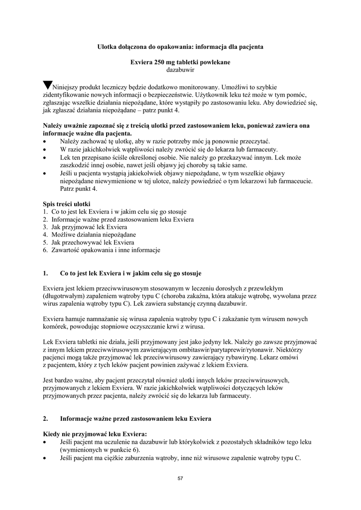 Ulotka dołączona do opakowania: informacja dla pacjenta Exviera 250 mg tabletki powlekane dazabuwir Niniejszy produkt leczniczy będzie dodatkowo monitorowany. Umożliwi to szybkie zidentyfikowanie nowych informacji o bezpieczeństwie. Użytkownik leku też może w tym pomóc, zgłaszając wszelkie działania niepożądane, które wystąpiły po zastosowaniu leku. Aby dowiedzieć się, jak zgłaszać działania niepożądane – patrz punkt 4. Należy uważnie zapoznać się z treścią ulotki przed zastosowaniem leku, ponieważ zawiera ona informacje ważne dla pacjenta. Należy zachować tę ulotkę, aby w razie potrzeby móc ją ponownie przeczytać. W razie jakichkolwiek wątpliwości należy zwrócić się do lekarza lub farmaceuty. Lek ten przepisano ściśle określonej osobie. Nie należy go przekazywać innym. Lek może zaszkodzić innej osobie, nawet jeśli objawy jej choroby są takie same. Jeśli u pacjenta wystąpią jakiekolwiek objawy niepożądane, w tym wszelkie objawy niepożądane niewymienione w tej ulotce, należy powiedzieć o tym lekarzowi lub farmaceucie. Patrz punkt 4. Spis treści ulotki 1. Co to jest lek Exviera i w jakim celu się go stosuje 2. Informacje ważne przed zastosowaniem leku Exviera 3. Jak przyjmować lek Exviera 4. Możliwe działania niepożądane 5. Jak przechowywać lek Exviera 6. Zawartość opakowania i inne informacje 1. Co to jest lek Exviera i w jakim celu się go stosuje Exviera jest lekiem przeciwwirusowym stosowanym w leczeniu dorosłych z przewlekłym (długotrwałym) zapaleniem wątroby typu C (choroba zakaźna, która atakuje wątrobę, wywołana przez wirus zapalenia wątroby typu C). Lek zawiera substancję czynną dazabuwir. Exviera hamuje namnażanie się wirusa zapalenia wątroby typu C i zakażanie tym wirusem nowych komórek, powodując stopniowe oczyszczanie krwi z wirusa. Lek Exviera tabletki nie działa, jeśli przyjmowany jest jako jedyny lek. Należy go zawsze przyjmować z innym lekiem przeciwwirusowym zawierającym ombitaswir/parytaprewir/rytonawir. Niektórzy pacjenci mogą także przyjmować lek przeciwwirusowy zawierający rybawirynę. Lekarz omówi z pacjentem, który z tych leków pacjent powinien zażywać z lekiem Exviera. Jest bardzo ważne, aby pacjent przeczytał również ulotki innych leków przeciwwirusowych, przyjmowanych z lekiem Exviera. W razie jakichkolwiek wątpliwości dotyczących leków przyjmowanych przez pacjenta, należy zwrócić się do lekarza lub farmaceuty. 2. Informacje ważne przed zastosowaniem leku Exviera Kiedy nie przyjmować leku Exviera: Jeśli pacjent ma uczulenie na dazabuwir lub którykolwiek z pozostałych składników tego leku (wymienionych w punkcie 6). Jeśli pacjent ma ciężkie zaburzenia wątroby, inne niż wirusowe zapalenie wątroby typu C. 57 Jeśli pacjent przyjmuje którykolwiek z leków wymienionych w poniższej tabeli. W przypadku, gdy leki Exviera i ombitaswir/parytaprewir/rytonawir zostaną przyjęte z tymi lekami, mogą wystąpić ciężkie lub zagrażające życiu działania niepożądane. Leki te mogą wpływać na działanie leków Exviera i ombitaswiru/parytaprewiru/rytonawiru lub leki Exviera i ombitaswir/parytaprewir/rytonawir mogą wpływać na działanie wymienionych leków. Leki, których nie wolno przyjmować z lekiem Exviera Lek lub substancja czynna Cel stosowania leku karbamazepina, fenytoina, fenobarbital padaczka efawirenz, etrawiryna, newirapina zakażenie HIV enzalutamid rak gruczołu krokowego leki zawierające etynyloestradiol, takie jak antykoncepcja większość doustnych środków antykoncepcyjnych i systemów terapeutycznych dopochwowych stosowanych w antykoncepcji gemfibrozyl aby zmniejszyć stężenie cholesterolu i innych tłuszczów we krwi mitotan niektóre nowotwory nadnerczy ryfampicyna zakażenia bakteryjne dziurawiec zwyczajny (Hypericum w przypadku niepokoju i łagodnej depresji perforatum) lek ziołowy dostępny bez recepty Nie stosować leku Exviera, jeśli którykolwiek z powyższych punktów dotyczy pacjenta. W razie jakichkolwiek wątpliwości przed rozpoczęciem stosowania leku Exviera należy zwrócić się do lekarza lub farmaceuty. Ostrzeżenia i środki ostrożności Przed rozpoczęciem przyjmowania leku Exviera należy poinformować lekarza lub farmaceutę, jeśli u pacjenta występuje inna choroba wątroby niż wirusowe zapalenie wątroby typu C. Podczas leczenia lekami Exviera i ombitaswir/parytaprewir/rytonawir, należy powiedzieć lekarzowi, jeśli u pacjenta występują następujące objawy, ponieważ mogą być one oznaką nasilenia zaburzeń wątroby: – nudności, wymioty lub utrata apetytu, – zażółcenie skóry lub oczu, – ciemniejsza niż zwykle barwa moczu, – splątanie, – stwierdzenie powiększenia brzucha. Jeśli którykolwiek z powyższych punktów dotyczy pacjenta (lub pacjent nie jest pewny) należy powiedzieć o tym lekarzowi lub farmaceucie przed przyjęciem leku Exviera. Badania krwi Lekarz zleci badania krwi przed rozpoczęciem, w czasie i po zakończeniu stosowania leku Exviera. Są one wykonywane, aby lekarz mógł: podjąć decyzję, jakie inne leki pacjent powinien przyjmować z lekiem Exviera i jak długo, stwierdzić czy leczenie jest skuteczne i czy u pacjenta nie występuje już wirus zapalenia wątroby typu C, sprawdzić czy u pacjenta nie występują działania niepożądane leku Exviera lub innych leków przeciwwirusowych przepisanych pacjentowi do stosowania z lekiem Exviera (takich jak ombitaswir/parytaprewir/rytonawir i rybawiryna). 58 Dzieci i młodzież Nie należy podawać leku Exviera dzieciom i młodzieży w wieku poniżej 18 lat. Nie badano stosowania leku Exviera u dzieci i młodzieży. Lek Exviera a inne leki Należy powiedzieć lekarzowi lub farmaceucie o wszystkich lekach przyjmowanych przez pacjenta obecnie lub ostatnio, a także o lekach, które pacjent planuje przyjmować. Pewnych leków nie wolno przyjmować z lekiem Exviera – patrz tabela powyżej „Leki,