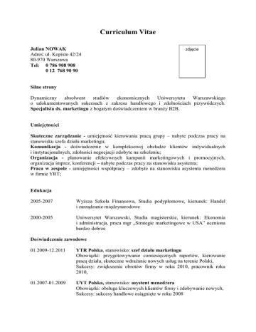 Curriculum Vitae Julian NOWAK Adres: ul. Kopisto 42/24 80-970 Warszawa Tel: 0 786 908 908 0 12 768 90 90 zdjęcie Silne strony Dynamiczny absolwent studiów ekonomicznych Uniwersytetu Warszawskiego o udokumentowanych sukcesach z zakresu handlowego i zdolnościach przywódczych. Specjalista ds. marketingu z bogatym doświadczeniem w branży B2B. Umiejętności Skuteczne zarządzanie - umiejętność kierowania pracą grupy – nabyte podczas pracy na stanowisku szefa działu marketingu; Komunikacja - doświadczenie w kompleksowej obsłudze klientów indywidualnych i instytucjonalnych, zdolności negocjacji zdobyte na szkoleniu; Organizacja - planowanie efektywnych kampanii marketingowych i promocyjnych, organizacja imprez, konferencji – nabyte podczas pracy na stanowisku asystenta; Praca w zespole - umiejętności współpracy – zdobyte na stanowisku asystenta menedżera w firmie YRT; Edukacja 2005-2007 Wyższa Szkoła Finansowa, Studia podyplomowe, kierunek: Handel i zarządzanie międzynarodowe 2000-2005 Uniwersytet Warszawski, Studia magisterskie, kierunek: Ekonomia i administracja, praca mgr „Strategie marketingowe w USA” oceniona bardzo dobrze Doświadczenie zawodowe 01.2009-12.2011 YTR Polska, stanowisko: szef działu marketingu Obowiązki: przygotowywanie comiesięcznych raportów, kierowanie pracą działu, skuteczne wdrażanie nowych usług na terenie Polski, Sukcesy: zwiększenie obrotów firmy w roku 2010, pracownik roku 2010, 01.2007-01.2009 UYT Polska, stanowisko: asystent menedżera Obowiązki: obsługa kluczowych klientów firmy i zdobywanie nowych, Sukcesy: sukcesy handlowe osiągnięte w roku 2008 Kursy, szkolenia: 01.2007-06.2007 Kurs dla specjalistów ds. marketingu przeprowadzony przez Biznesowe Centrum Szkoleniowe – potwierdzone certyfikatem YTR Obsługa komputera: Biegła znajomość MS Office; Podstawy PowerPoint i JavaScript Znajomość programu graficznego UYT Obsługa Internetu Języki: Angielski Włoski Szwedzki - bardzo dobry dobry (egzamin w Instytucie Włoskim) komunikatywnie Zainteresowania: Malarstwo niderlandzkie (publikacje internetowe) Sport (kolarstwo górskie) „Wyrażam zgodę na przetwarzanie moich danych osobowych w celach rekrutacji, zgodnie z Ustawą z dn. 29 sierpnia 1997 r. o ochronie danych osobowych (Dz. U. z 2002 r. Nr 101, poz. 926 z późniejszymi zmianami).”