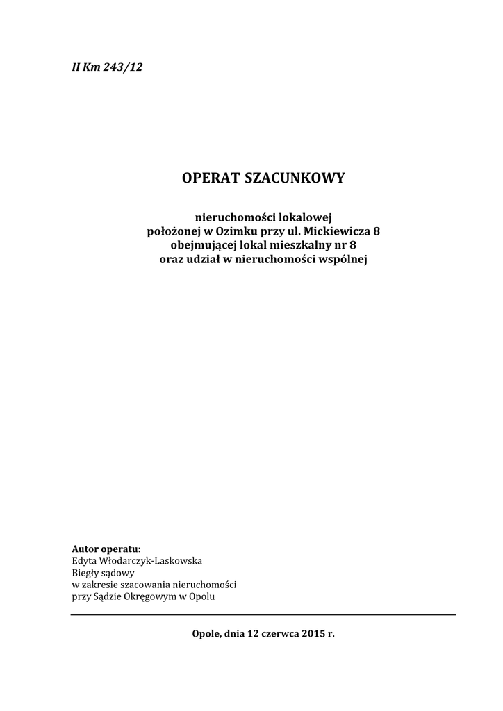 II Km 243/12 OPERAT SZACUNKOWY nieruchomości lokalowej położonej w Ozimku przy ul. Mickiewicza 8 obejmującej lokal mieszkalny nr 8 oraz udział w nieruchomości wspólnej Autor operatu: Edyta Włodarczyk-Laskowska Biegły sądowy w zakresie szacowania nieruchomości przy Sądzie Okręgowym w Opolu Opole, dnia 12 czerwca 2015 r. Operat szacunkowy nieruchomości lokalowej – ul. Mickiewicza 8/8 – Ozimek Wyciąg z operatu szacunkowego (zgodnie z art. 158 ustawy z dnia 21 sierpnia 1997 r. o gospodarce nieruchomościami Dz. U. z 2014, poz. 518 z późniejszymi zmianami). 1. Położenie nieruchomości, adres: 2. Oznaczenie wg ewidencji gruntów, budynków i lokali: 3. Numer księgi wieczystej: Ozimek, ul. Mickiewicza 8/8 Nieruchomość lokalowa - Ozimek, ul. Mickiewicza 8, lokal 2 mieszkalny nr 8, powierzchnia użytkowa lokalu – 48,40 m Nieruchomość gruntowa - nr 77/17, arkusz mapy 1, obręb 0091 – Ozimek, o powierzchni 0,1448 ha. KW lokalu: OP1O/00085751/3, KW gruntu: OP1O/00083434/1 4. Określenie osób, którym przysługują prawa do nieruchomości, rodzaj praw: Współwłaściciele gruntu i lokalu: Mirosław Kamiński i Zofia Kamińska 5. Opis nieruchomości: Lokal mieszkalny nr 8 o powierzchni użytkowej 48,40 m zlokalizowany na I piętrze w budynku mieszkalnym wielorodzinnym, położonym przy ul. Mickiewicza 8. Do lokalu 2 przynależy piwnica o powierzchni 8,90 m oraz udział w wysokości 753/10000 w nieruchomości wspólnej tj. w części budynku i urządzeniach, które nie służą wyłącznie do użytku właściciela lokalu, a także udział w gruncie, jako przedmiocie prawa użytkowania wieczystego. 6. Cel wyceny: Celem wyceny jest określenie wartości rynkowej nieruchomości jako podstawy dla sporządzenia opisu i oszacowania nieruchomości przez Komornika Sądowego. 2 7. Wartość nieruchomości: 94 500 zł Wartość rynkowa. Określenie wartości: podejście porównawcze, metoda porównywania parami. słownie: dziewięćdziesiąt cztery tysiące pięćset złotych Data sporządzenia operatu szacunkowego 12 czerwca 2015 r. 8. Daty istotne dla sporządzenia operatu: Data określenia wartości przedmiotu wyceny 9 czerwca 2015 r. Data, na którą określono i uwzględniono w wycenie stan przedmiotu wyceny 9 czerwca 2015 r. Edyta Włodarczyk-Laskowska 9. Imię i nazwisko rzeczoznawcy majątkowego, pieczęć i podpis –2– Biegły sądowy w zakresie szacowania nieruchomości – Edyta Włodarczyk-Laskowska Operat szacunkowy nieruchomości lokalowej – ul. Mickiewicza 8/8 – Ozimek Operat szacunkowy nieruchomości 1. Określenie przedmiotu, zakresu i uwarunkowań wyceny 1.1. Przedmiot wyceny Nieruchomość lokalowa stanowiąca lokal mieszkalny nr 8 o powierzchni użytkowej 48,40 m2 zlokalizowany na I piętrze w budynku mieszkalnym wielorodzinnym, położonym przy ul. Mickiewicza 8. Do lokalu przynależy piwnica o powierzchni 8,90 m2 oraz udział w wysokości 753/10000 w nieruchomości wspólnej tj. w części budynku i urządzeniach, które nie służą wyłącznie do użytku właściciela lokalu, a także udział w gruncie, jako przedmiocie prawa użytkowania wieczystego. Przedmiotowy grunt oznaczony jest w ewidencji gruntów i budynków (kataster nieruchomości) jako działka ewidencyjna nr 77/17, arkusz mapy 1, obręb 0091 – Ozimek, o powierzchni 0,1448 ha. Przedmiotowa nieruchomość lokalowa ma założoną księgę wieczystą KW Nr OP1O/00085751/3, a przedmiotowa nieruchomość gruntowa ma założoną księgę wieczystą KW Nr OP1O/00083434/1. Obie księgi wieczyste prowadzone są przez Sąd Rejonowy w Opolu – VI Wydział Ksiąg Wieczystych. 1.2. Zakres wyceny Zakres wyceny obejmuje określenie wartości rynkowej nieruchomości lokalowej, na którą składa się prawo własności lokalu mieszkalnego i piwnicy wraz z przynależnym udziałem w wysokości 753/10000 w części nieruchomości wspólnej, którą stanowi prawo współużytkowania wieczystego gruntu oraz części budynku i urządzeń, które nie służą wyłącznie do użytku właściciela lokalu. Z wartości wycenianej nieruchomości lokalowej nie wyodrębniano wartości udziału w prawie współużytkowania wieczystego gruntu, gdyż nie wymaga tego cel wyceny. 1.3. Uwarunkowania wyceny Zgodnie z art. 7 ustawy z dnia 21 sierpnia 1997 r. o gospodarce nieruchomościami - jeżeli istnieje potrzeba określenia wartości nieruchomości, wartość tę określają rzeczoznawcy majątkowi. Zgodnie z art. 152 ustawy sposoby określania wartości nieruchomości, stanowiące podejścia do ich wyceny, są uzależnione od przyjętych rodzajów czynników wpływających na wartość nieruchomości. Wyceny nieruchomości dokonuje się przy zastosowaniu podejść: porównawczego, dochodowego lub kosztowego, albo –3– Biegły sądowy w zakresie szacowania nieruchomości – Edyta Włodarczyk-Laskowska Operat szacunkowy nieruchomości lokalowej – ul. Mickiewicza 8/8 – Ozimek mieszanego, zawierającego elementy podejść poprzednich. Przy zastosowaniu podejścia porównawczego lub dochodowego określa się wartość rynkową nieruchomości. Jeżeli istniejące uwarunkowania nie pozwalają na zastosowanie podejścia porównawczego lub dochodowego, wartość rynkową nieruchomości określa się w podejściu mieszanym. Według art. 154 ust. 1 wyboru właściwego podejścia oraz metody i techniki szacowania nieruchomości dokonuje rzeczoznawca majątkowy, uwzględniając w szczególności cel wyceny, rodzaj i położenie nieruchomości, przeznaczenie w planie miejscowym, stopień wyposażenia w urządzenia infrastruktury technicznej, stan jej zagospodarowania oraz dostępne dane o cenach, dochodach i cechach nieruchomości podobnych. Zgodnie z celem wyceny określana jest wartość rynkowa nieruchomości. Według art. 151 ust. 1. ustawy wartość rynkową nieruchomości stanowi najbardziej prawdopodobna jej cena, możliwa do uzyskania na rynku, określona z uwzględnieniem cen transakcyjnych przy przyjęciu następ