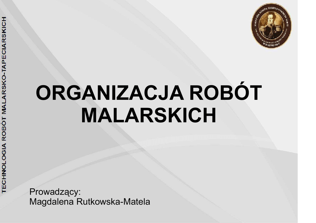 ORGANIZACJA ROBÓT MALARSKICH Prowadzący: Magdalena Rutkowska-Matela Odpowiednio zorganizowane stanowisko pracy malarza ma wpływ na prawidłowe i bezpieczne wykonanie robót malarskich. Przed rozpoczęciem robót powinny być usunięte z malowanych pomieszczeń wszystkie materiały pozostałe po wcześniej wykonywanych robotach budowlanych. Pomieszczenia powinny być posprzątane, a zamontowana stolarka i wykonane posadzki – osłonięte przed zanieczyszczeniem farbą. 2 I. PRZYGOTOWANIE POWIERZCHNI Przed przystąpieniem do prac malarskich wskazane jest dokładne zabezpieczenie:okien, grzejników, podłóg i innych elementów w pomieszczeniu, które mogłyby ulec zabrudzeniu farbą . Zabezpieczenie powierzchni okien Zabezpieczenie grzejników 3 Zabezpieczenie podłóg Zabezpieczenie elementów w pomieszczeniu, 4 które mogłyby ulec zabrudzeniu farbą Elementy wyposażenia, takie jak oprawy gniazd elektrycznych, kontakty itp. najlepiej zdemontować , a pozostałe części zabezpieczyć przed zabrudzeniem folią oraz taśmą malarską . 5 Malarz powinien być wyposażony we wszystkie potrzebne narzędzia, które należy utrzymywać w czystości. Na stanowisku pracy powinny się znajdować tylko narzędzia potrzebne do wykonywania danej roboty. Drabiny malarskie muszą być w dobrym stanie technicznym. Jeżeli malowanie jest wykonywane na rusztowaniach, muszą być one prawidłowo zmontowane i kontrolowane codziennie przed rozpoczęciem pracy. 6 Malarz powinien posiadać odpowiednią odzież ochronną i sprzęt ochrony indywidualnej. Jeżeli roboty malarskie będą wykonywane z zastosowaniem takich materiałów łatwopalnych jak: lakiery czy rozpuszczalniki, należy umieścić napisy ostrzegawcze i przygotować sprzęt gaśniczy. Maski ochronne Rodzaj maski zależy od stopnia zagrożenia powodowanego przez farbę, czasu pracy, ilości używanej farby oraz miejsca wykonywania prac. Natryskowa aplikacja farby wymaga zastosowania maski pełnotwarzowej i ochrony dróg oddechowych i zaleca się, aby była wykonywana przez fachowców dysponujących specjalistycznym sprzętem. 7 Okulary i gogle ochronne Podczas używania farby należy zawsze stosować ochronę wzroku. Rodzaj stosowanego środka ochronnego zależy od rodzaju wykonywanej pracy. Okulary ochronne są wystarczające w przypadku niewielkich rozprysków, natomiast gogli należy używać w celu zapewnienia sobie większej ochrony Obuwie ochronne Podczas malowania łodzi należy nosić antyelektrostatyczne buty ochronne ze stalowymi noskami. Zapewniają one między innymi dobre zabezpieczenie kostki 8 Rękawice Podczas malowania należy stosować chemoodporne, dobrej jakości rękawice. Należy je często wymieniać, w tym każdorazowo po zauważeniu zanieczyszczeń od strony wewnętrznej. Kombinezon We wszystkich sytuacjach, w których ryzyko narażenia na działanie farby jest potencjalnie wysokie, należy nosić bawełniany kombinezon (min. 60% bawełny) z długimi rękawami i nogawkami. Jeśli ryzyko to jest niewielkie, można użyć odpowiedniego kombinezonu jednorazowego użytku 9 Krem ochronny Krem ochronny należy stosować na odsłonięte fragmenty skóry nie zabezpieczone przez odzież ochronną. Nie wolno go stosować zamiast niej. NIE używać produktów, których podstawowym składnikiem jest wazelina, ponieważ przyspiesza ona proces wchłaniania farby przez skórę. Hełm ochronny Hełm ochronny należy nosić w celu zabezpieczenia głowy podczas malowania w miejscach, w których występuje zagrożenie powodowane przez spadające przedmioty lub odłamki. 10 Właściwa organizacja pracy polega na: określeniu zadania, przygotowaniu środków, wykonaniu zadania i kontroli wykonania zadania. W robotach malarskich można szczegółowo określić zakres poszczególnych etapów. Roboty malarskie mogą być wykonywane indywidualnie lub zespołowo. Malarz wykonujący pracę indywidualnie powinien umieć wykonywać wszystkie procesy technologiczne: − przygotowania materiałów, − przygotowania podłoża, − wykonania powłoki malarskiej. 11 Brygady malarskie powinny pracować zgodnie z harmonogramem robót malarskich, metodą pracy potokowej. Harmonogram robót malarskich przedstawia graficznie przebieg i ilość robót, czas i sposób wykonania poszczególnych operacji, liczebność brygad i zespołów. Brygady i zespoły malarskie muszą mieć zapewniony przez kierownictwo budowy zakres robót, aby nie występowały przestoje w pracy. 12 13 Odbiór powłok malarskich: wapiennej, cementowej, krzemianowej, kazeinowej, olejnej i lakierniczej może nastąpić najwcześniej po 14 dniach od ich wykonania. Powłoki klejowe i emulsyjne można odbierać po 7 dniach. Powłoki dwuwarstwowe powinny być jednolite, bez uszkodzeń, smug, prześwitów, zmarszczeń, plam i śladów pędzla. Nie mogą występować spękania, złuszczenia, odstawania od podłoża oraz widoczne ślady łączeń i poprawek. Powłoki nie powinny się ścierać przy potarciu tkaniną. Dopuszcza się chropowatość powierzchni odpowiadającą chropowatości podłoża, na którym została wykonana. Powłoki klejowe doborowe oraz olejne i lakierowe powinny być gładkie. Powłoki emulsyjne powinny być odporne na zmywanie wodą z mydłem. Barwa powłoki powinna być jednolita, bez widocznych poprawek lub połączeń o różnym odcieniu i natężeniu. 14 Linie styku różnych barw powinny być proste. Dopuszczalne odchyłki od linii prostej przy malowaniu zwykłym: do 2 mm/m i 3 mm na całej długości, przy malowaniu doborowym – 1 mm/m i 2 mm na całej długości. Powłoki nie powinny zawierać pigmentów szkodliwych dla zdrowia i nie powinny wydzielać przykrego zapachu. Powłoki olejne i lakierowe błyszczące powinny mieć jednolity połysk, a powłoki matowe – jednolitą matowość lub półmatowość. Powłoki nawierzchniowe z wyrobów olejnych i lakierowych powinny wytrzymywać próby: na wycieranie, zarysowanie, zmywanie wodąz mydłem, nasiąkliwość 